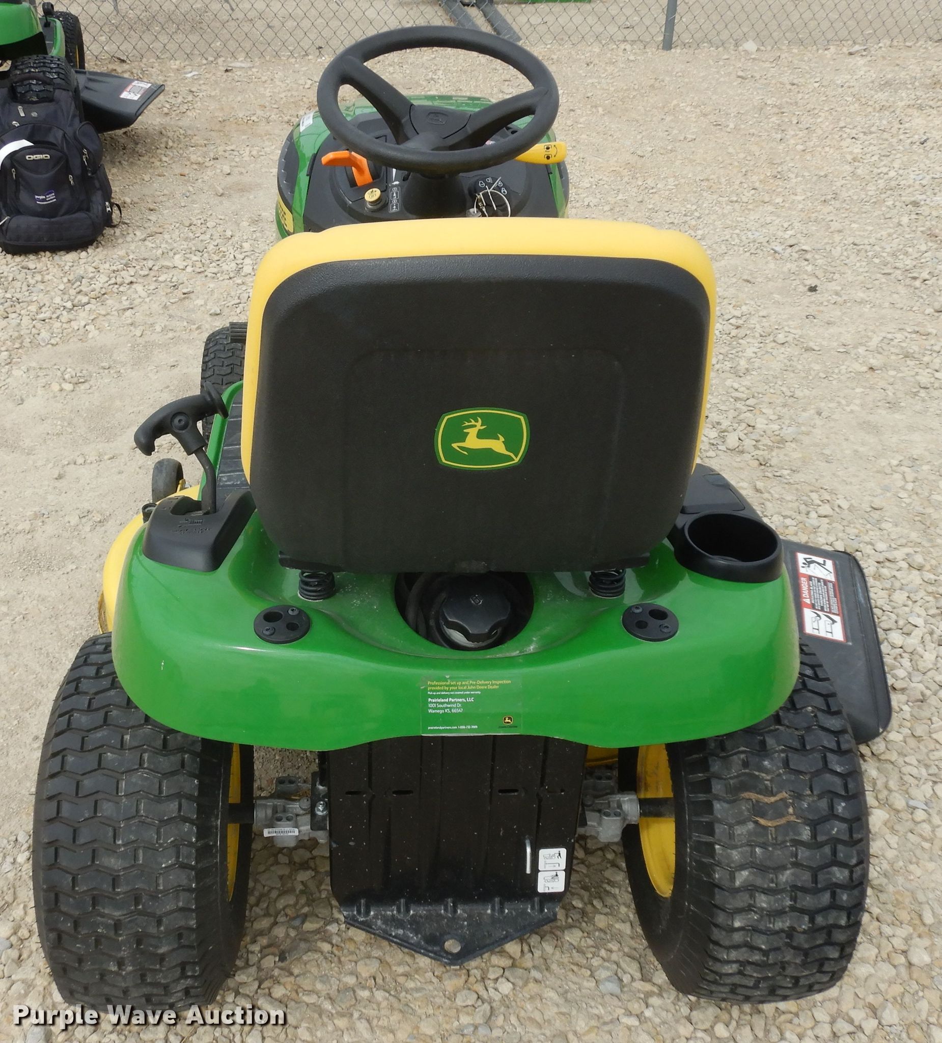 John Deere E120 lawn mower. 29 hours on meter, Cutting width: 42", Serial: 1GXE120EVKK112699, Unit #: 176506. Engine Cylinders: 2, Fuel type: Gas, HP: 20. Transmission Hydrostatic. Operational Self- propelled, Rear drawbar, Mower deck Width: 42". Tires Front: 15x6.00-6, Rear: 20x8.00-8. PrairieLand Partners. 1300 S Buckeye Ave. Abilene, KS 67410