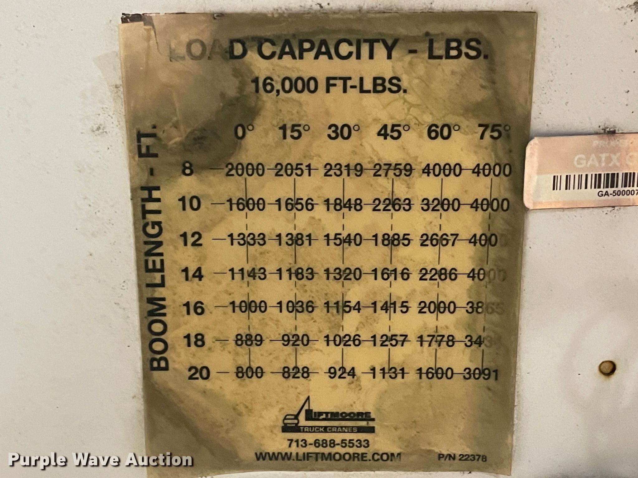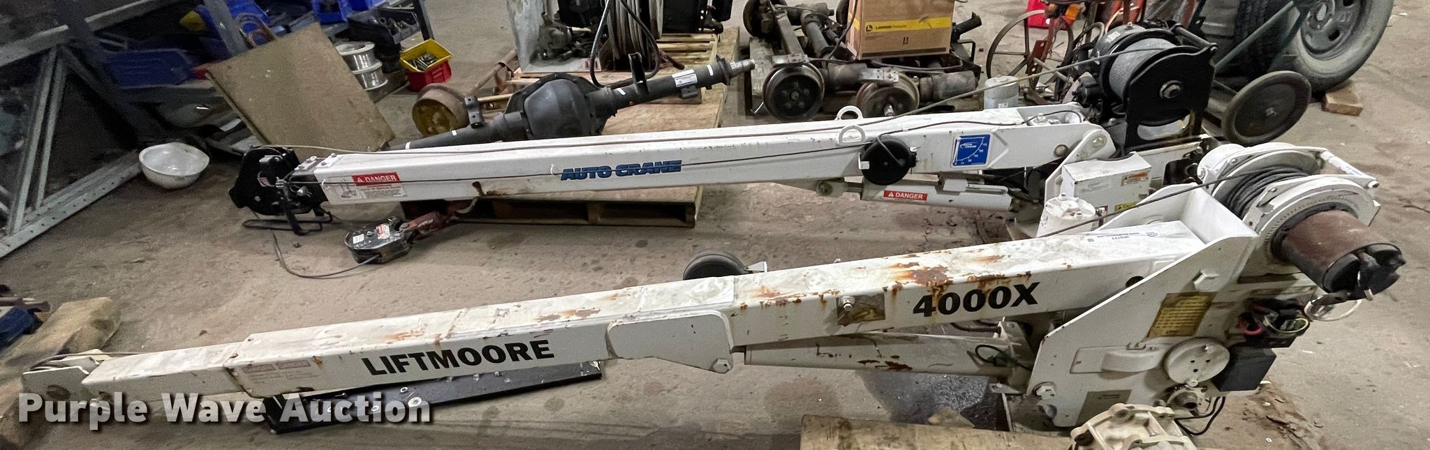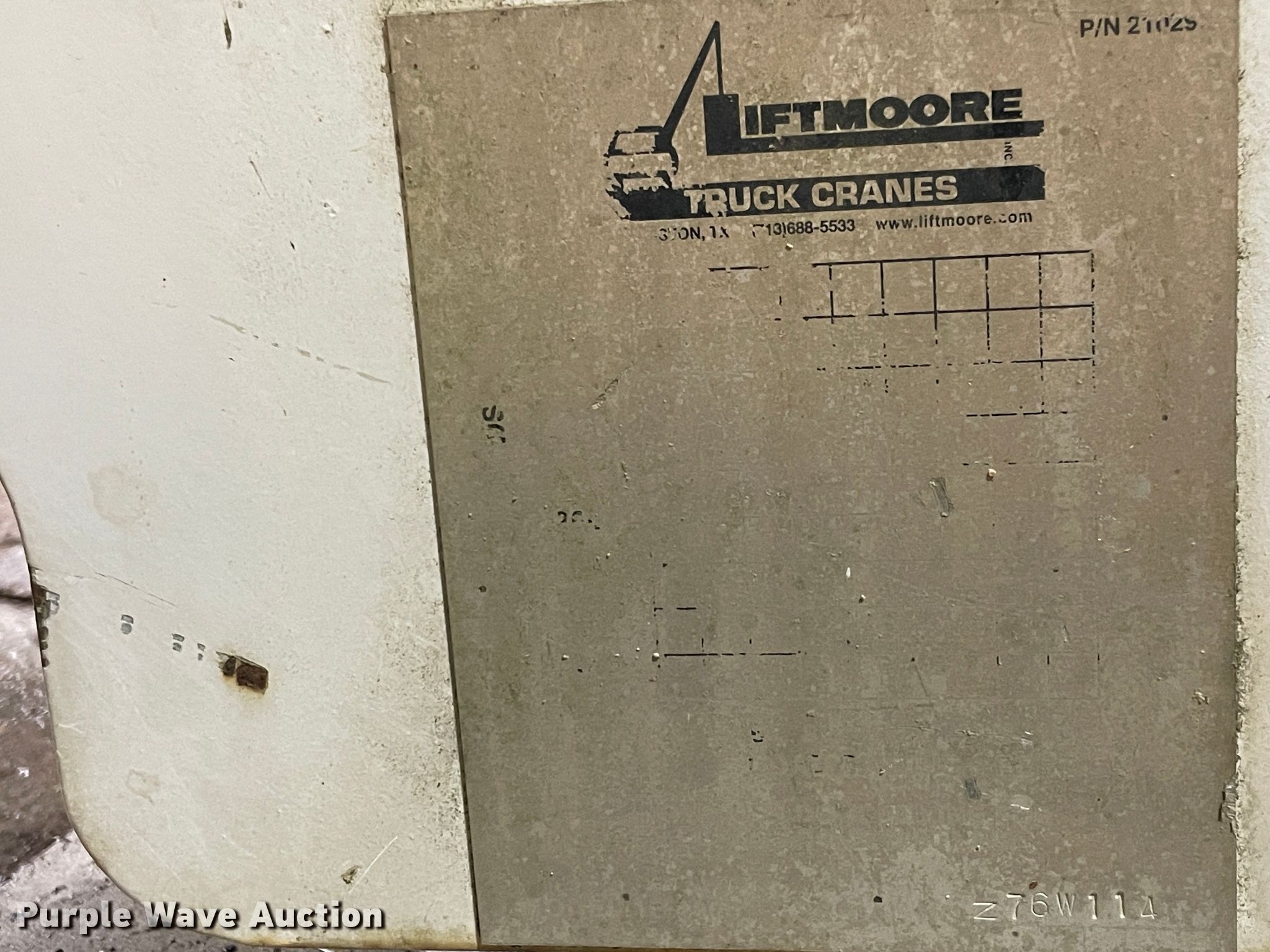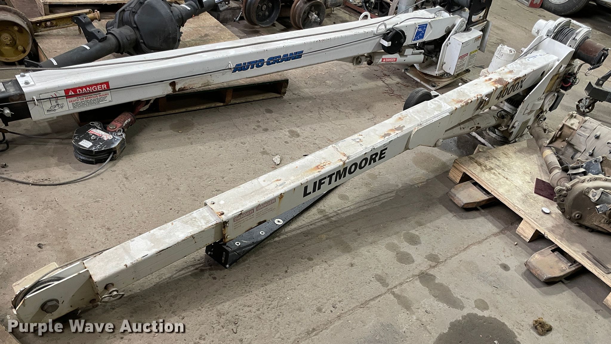 Purple Wave is selling a used Automotive Parts or Acces. in Kansas. This item is a Liftmoore crane with the following: 4,000 lbs maximum lift capacity, 20'L maximum reach length, Hydraulic leak, Unknown operating condition, Serial Z76W114
