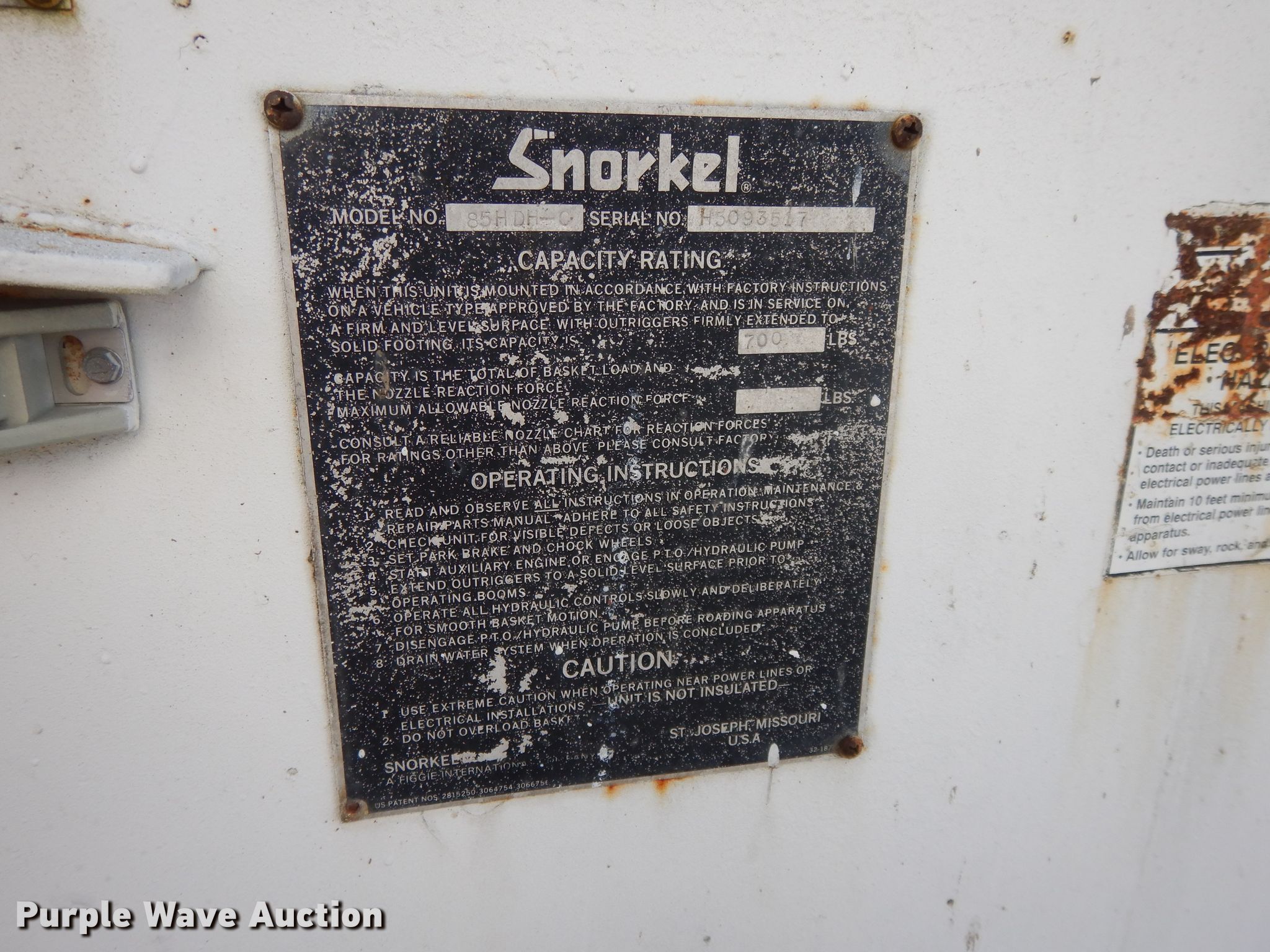 1985 Ford 9000 bucket truck. 160,506 miles on odometer. Engine Detroit Diesel 6-71, Displacement: 7.0L, Cylinders: 6, Fuel type: Diesel. Transmission Manual, Speed: 10. Chassis Axles: Tandem, Suspension: Walking beam, Brakes: Air, PTO, GVWR: 54,900 lbs, Wheelbase: 252". Interior Heat. Operational Flatbed Snorkel, Length: 22' 6", Boom Snorkel 85HDH-C, Serial: H5093517, Maximum lift capacity: 700 lbs, Maximum lift height: 80', Boom type: Articulating, Man basket, Boom controls Platform/ basket.. Tires Size: 10.00R20. Missouri title. KS117272. Commercial Waterproofing, Inc.. 6330 NW Kelly Dr. Parkville, MO 64152