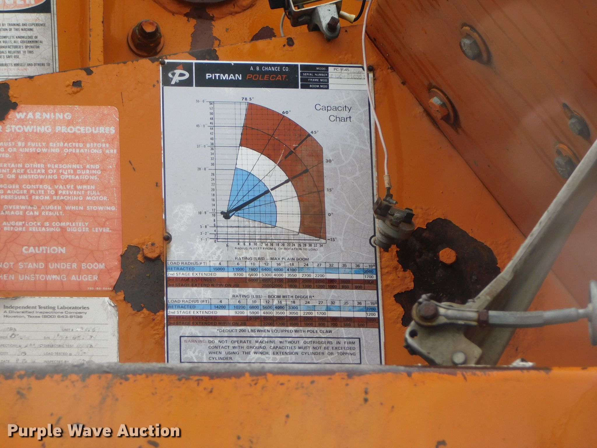 1981 Chevrolet C6500 digger derrick truck. 29,085 miles on odometer, Engine hours: 251. Engine Displacement: 6.0L V8, Cylinders: 8, Fuel type: Gas. Transmission Manual, Speed: 10. Chassis Axles: Single, Suspension: Spring, Brakes: Hydraulic, PTO, GVWR: 27,500 lbs, Wheelbase: 180". Interior Heat. Operational Bed Astoria , Serial: 16353, Length: 12' 3", Boom Pitman Polecat PC1545, Serial: 181504810353, Boom length: 34', Mast height: 55', Maximum lift capacity: 15,000 lbs, Boom type: Telescopic, Man basket, Boom controls Platform/ basket, Material handler, Pole guide, Auger Diameter: 20".. Tires Size: 10.00-20. Nebraska title. 1GBL7D1B7BV104513. Norfolk Construction. 2410 N Airport Rd. Norfolk, NE 68701