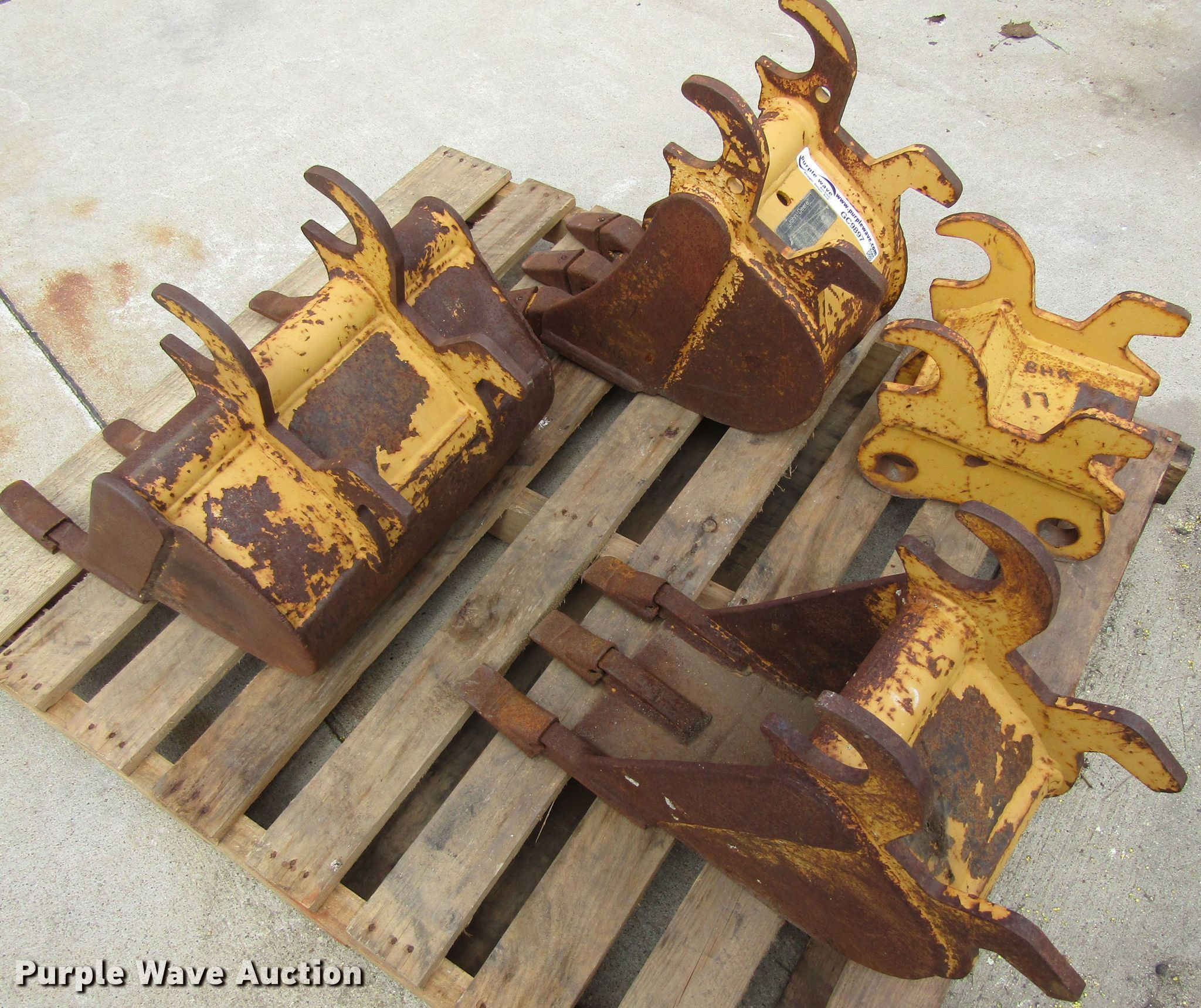 Purple Wave is selling a used Excavator Attach. in Iowa. This item is a Excavator attachments with the following: (2) 8"W excavator buckets, 17"W excavator bucket, Quick coupler, Breaker, Skid steer to excavator quick attach, Fits John Deere 17 ZTS excavator