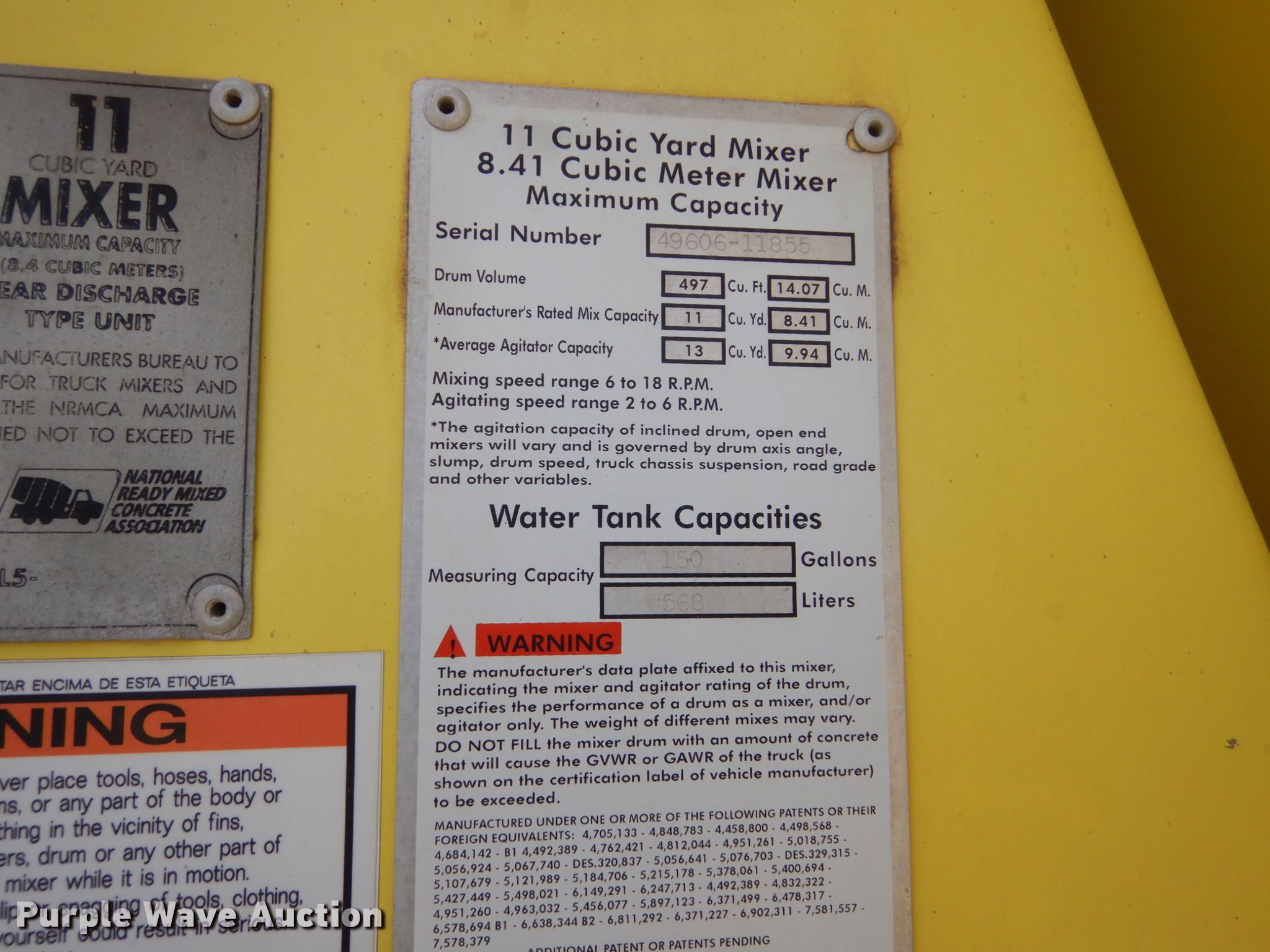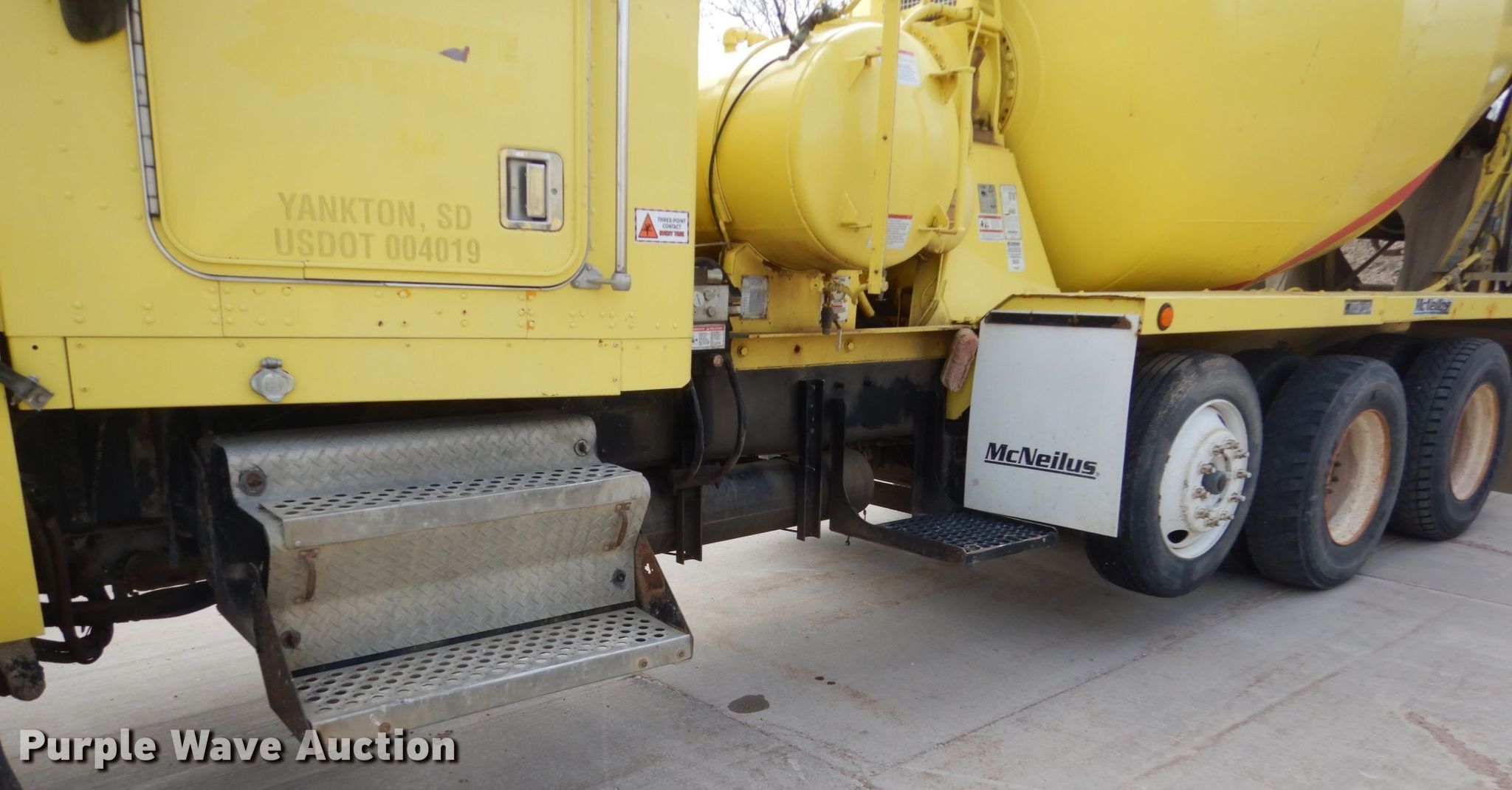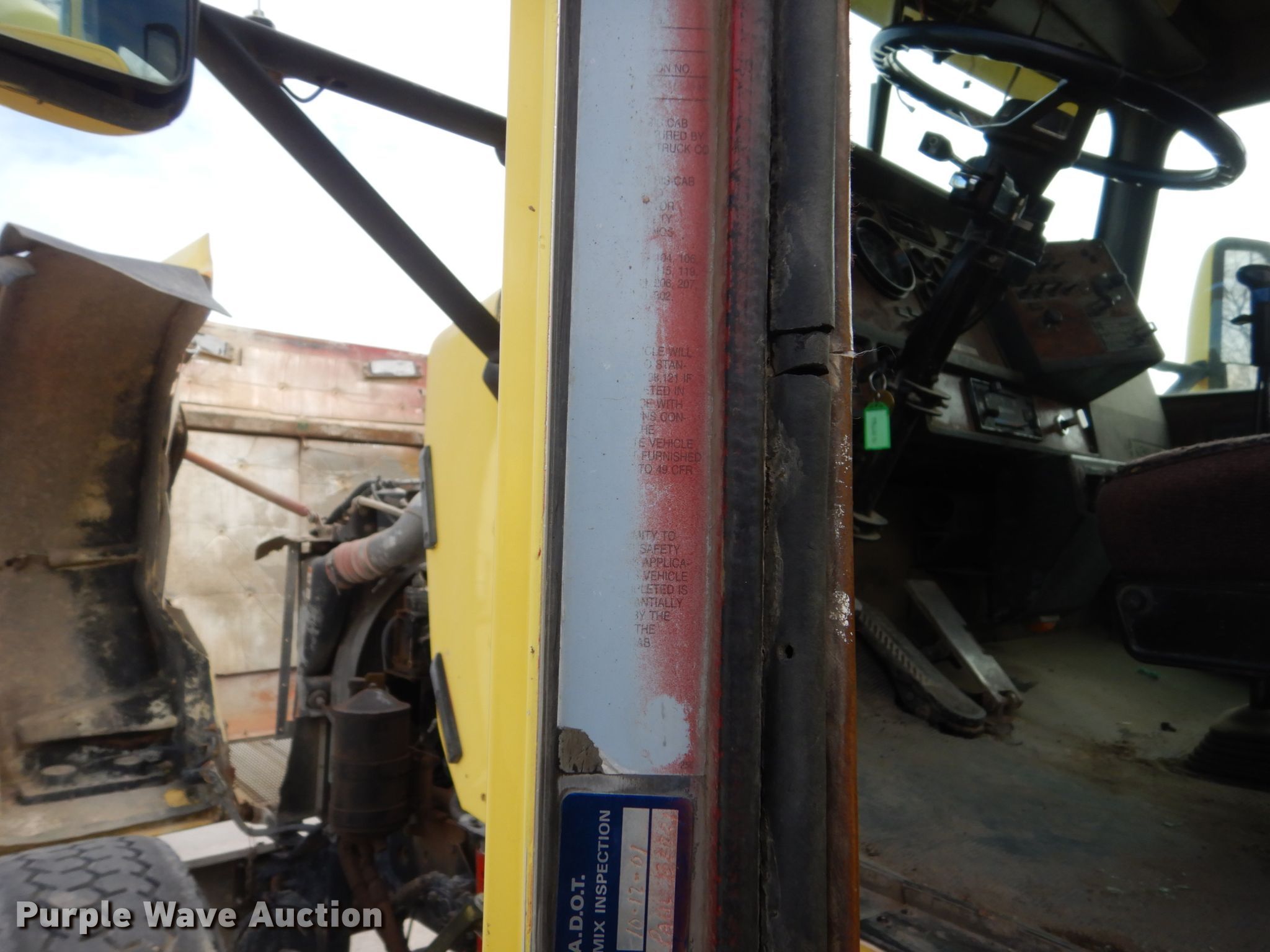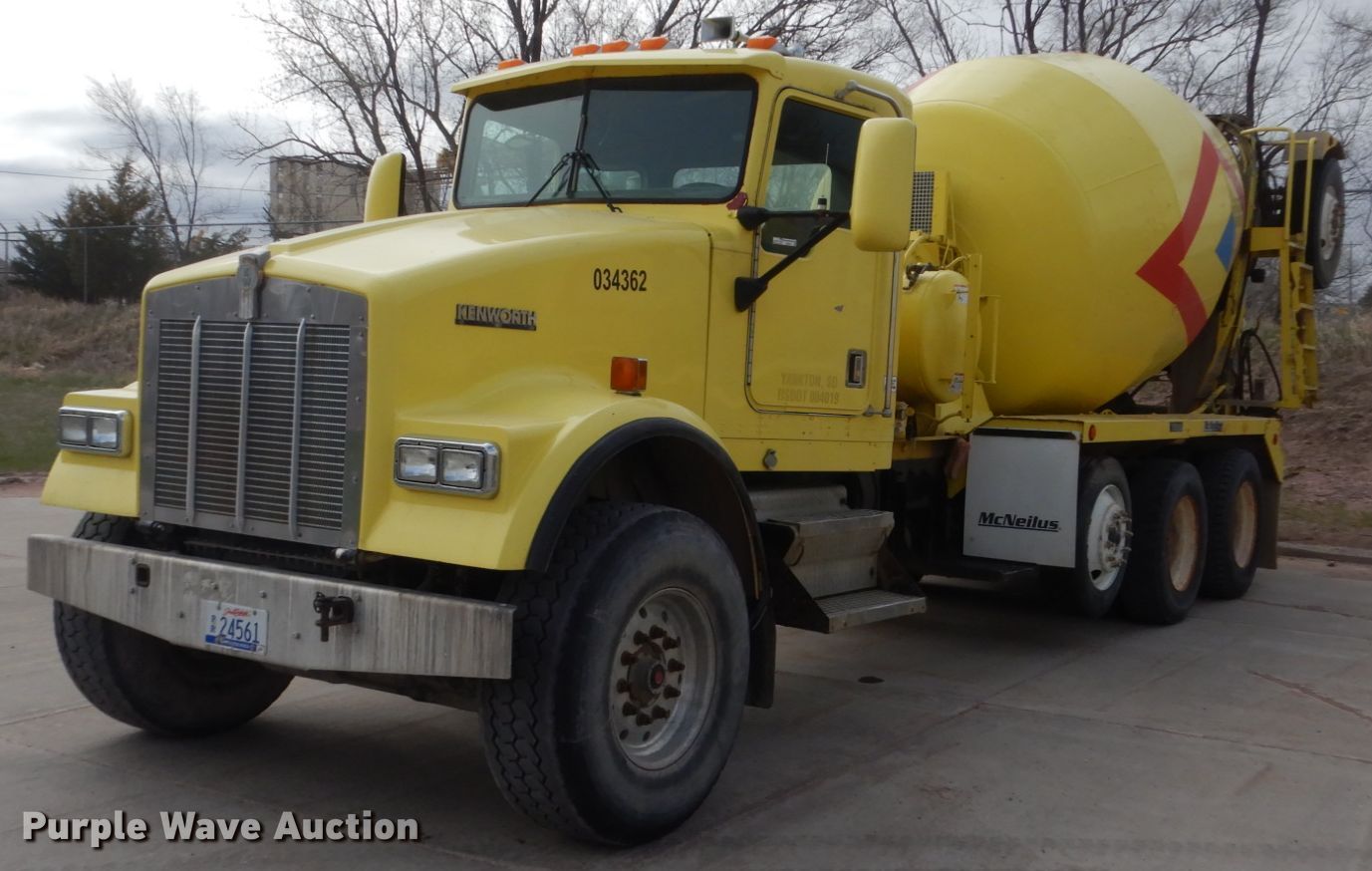 1999 Kenworth W900 ready mix truck. 322,960 miles on odometer. Engine Cummins M11, Displacement: 10.8L, Cylinders: 6, Fuel type: Diesel. Transmission Manual, Speed: 10. Chassis Axles: Quad, Pusher axle, Tag axle, Differential lock: Inter-axle, Suspension: Walking beam, Brakes: Air, PTO, FAWR: 20,000 lbs, IAWR: 23,000 lbs, RAWR: 23,000 lbs. Interior AC, Heat, Heated mirrors, Power passenger window, Cruise control. Operational Mixer McNeilus , Serial: 49606-11855, Capacity: 11 cu.yd., Discharge: Rear, In-cab controls, Rear drum controls, Water tank capacity: 150 gallons, Chute Extensions: 3, Chute type: Steel.. Tires Front: 425/65R22.5, Pusher: 255/70R22.5, Rear: 11R22.5, Tag: 375/80R22.5. South Dakota title. 1NKWL90X6XR814662. Concrete Materials - Sweetman Const.. 1305 N Louise Ave. Sioux Falls, SD 57107