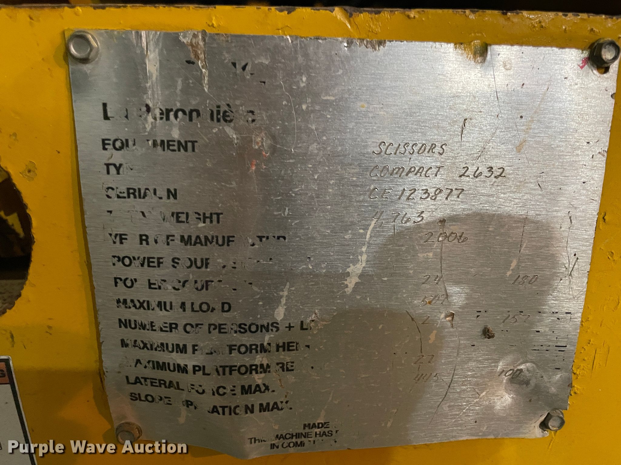 Purple Wave is selling a used Scissor or Vertical Lift in Kansas. This item is a 2007 Haulotte 2632E scissor lift with the following: Unknown hours on meter, Serial: CE123877