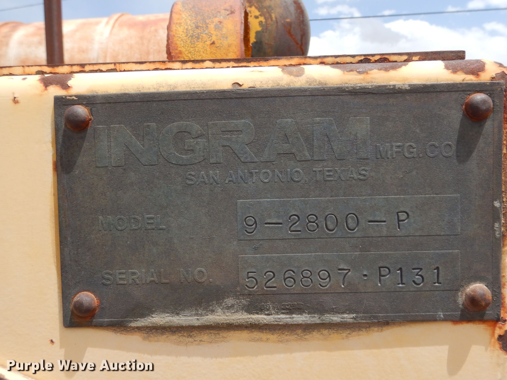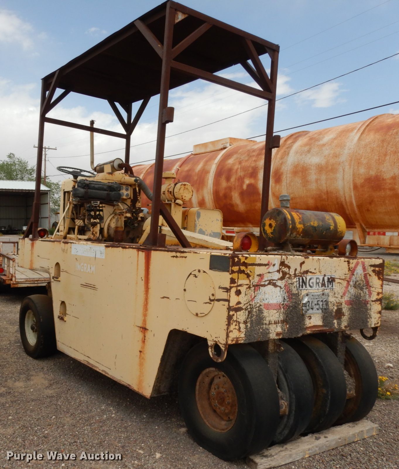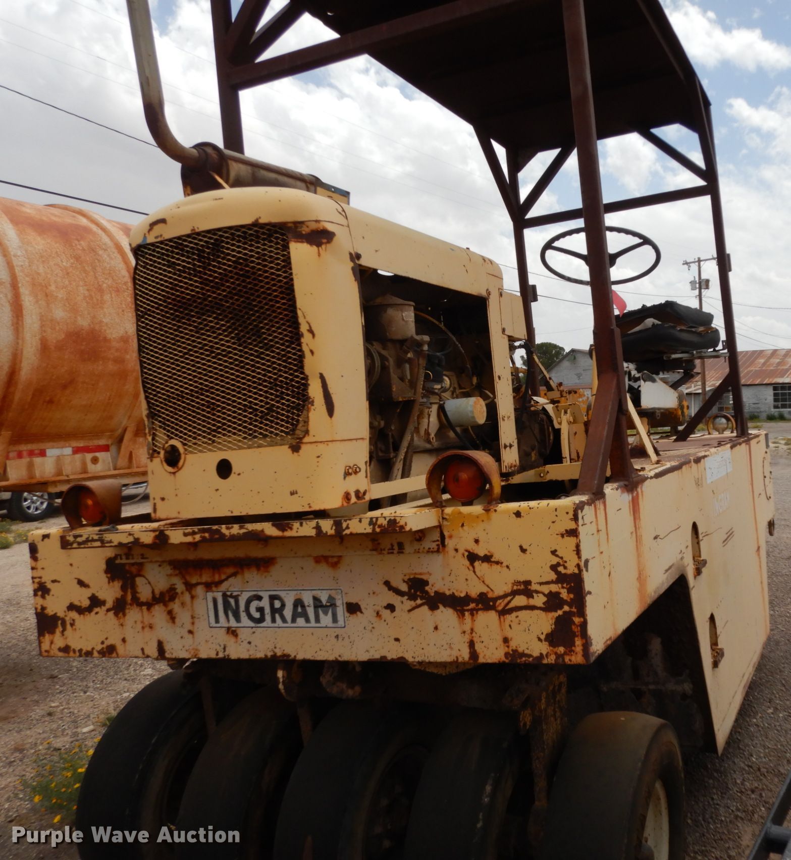 Ingram 9-2800-P pneumatic roller. Serial: 526897-P131. Engine Ford, Cylinders: 6, Fuel type: Gas. Transmission Hydrostatic, Two speed travel. Operators station OROPS. Tires Quantity: 9. Notes Non-operational unit. Winkler County - Kermit, TX. 729 N Pine St. Kermit, TX 79745