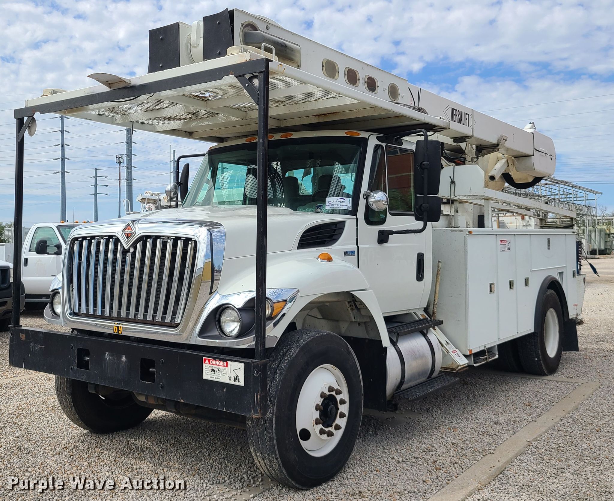 2012 International 7300 bucket truck. 66,600 miles on odometer, Engine hours: 11,144, Unit #: 4017. Engine International DT466, Displacement: 7.6L, Cylinders: 6, Fuel type: Diesel. Transmission Automatic. Chassis Axles: Single, Suspension: Spring, Brakes: Hydraulic, PTO. Interior AC, Heat, Cruise control. Operational Bed Length: 12', Boom Versalift VO350MHI-01, Serial: MG120002, Maximum lift height: 35', Boom type: Articulating, Insulated, Man basket, Boom controls Ground, Platform/ basket, Material handler. Tires Size: 11R22.5. Missouri title. 1HTWAAAR3CJ078929. City of Independence Power & Light, MO. 21500 E Truman Rd. Independence, MO 64056