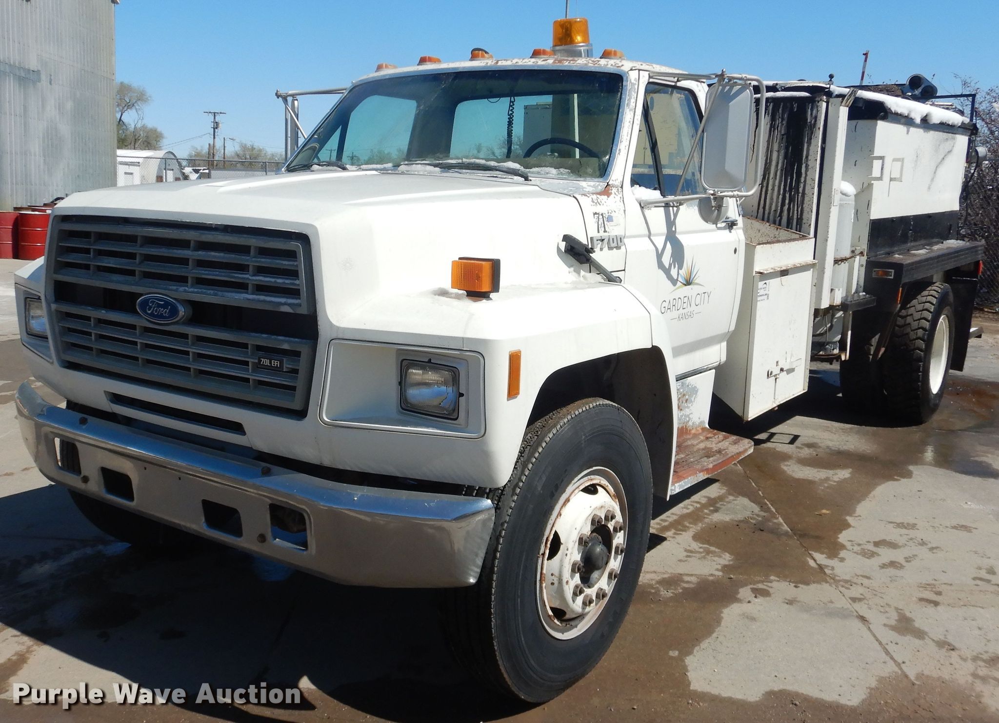 1992 Ford F700 pot hole patcher truck. 38,409 miles on odometer. Engine Displacement: 7.0L, Cylinders: 8, Fuel type: Gas. Transmission Automatic. Chassis Axles: Single, Suspension: Spring, PTO, GVWR: 28,000 lbs. Interior Heat. Operational Bed / tank Length: 18', Width: 96", Burner: Diesel, Spray wand, Hydraulic fold top, 12" asphalt chute. Tires Size: 10.00R20. Notes Non-operational burner. Kansas title. 1FDPF70J0NVA20768. Garden City KS Utilities Dept.. 103 S 9th St. Garden City, KS 67846