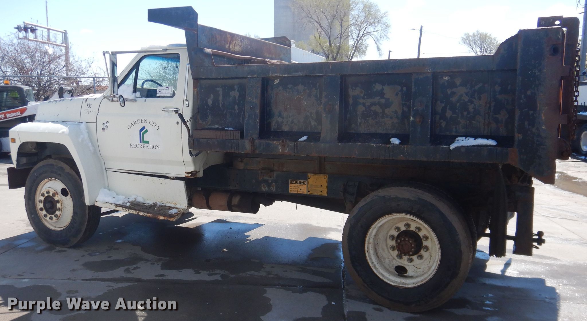 1994 Ford F700 dump truck. 92,268 miles on odometer. Engine Displacement: 7.0L, Cylinders: 8, Fuel type: Gas. Transmission Automatic. Chassis Axles: Single, Suspension: Spring, Brakes: Hydraulic, PTO, GVWR: 24,800 lbs. Interior AC, Heat. Operational Dump bed 10' L x 96" W, Side height: 30", Bed type: Steel, Ram: Single , End gate: Manual. Tires Size: 10R22.5. Notes Windshield chipped or cracked, Passenger window missing. Kansas title. 1FDNF70J9RVA28431. Garden City KS Utilities Dept.. 103 S 9th St. Garden City, KS 67846