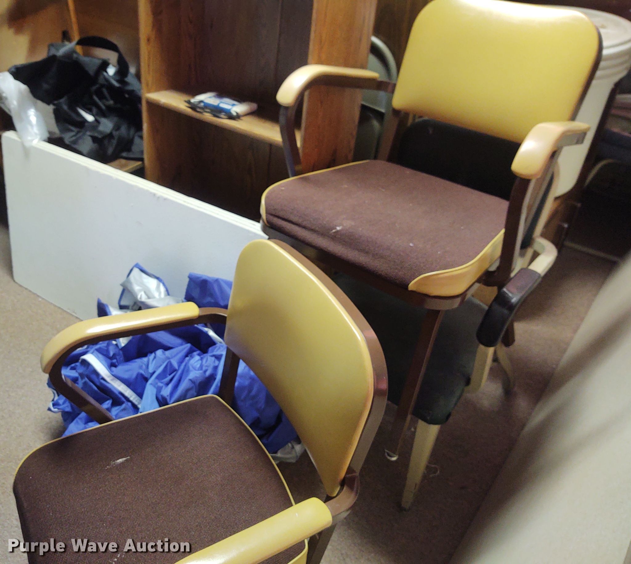 Purple Wave is selling a used Furniture in Kansas. This item is a Furniture with the following: (8) tables, Assorted chairs, Cessna sign, Shelving, Additional furniture