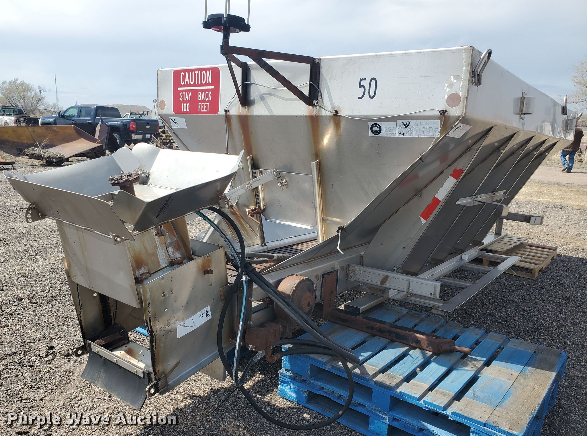 Monroe MV-156-84-56/3041210 stainless steel spreader. 13'L, Spinner plate missing, Unknown operating condition , Serial 110-99-01-8423. City of Great Bend. 1209 Williams St. Great Bend, KS 67530