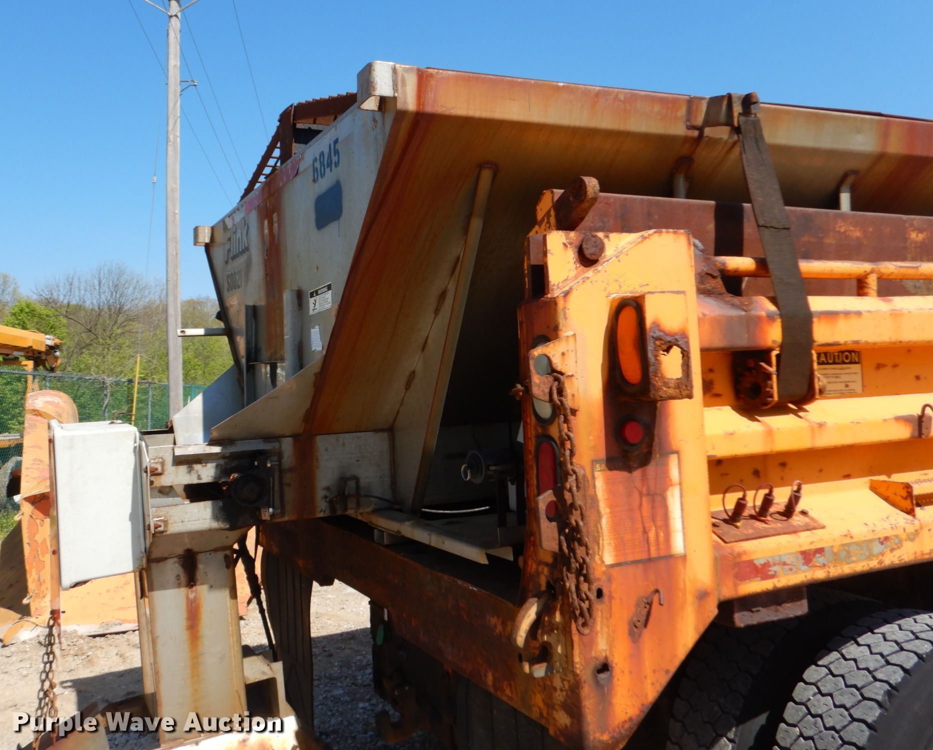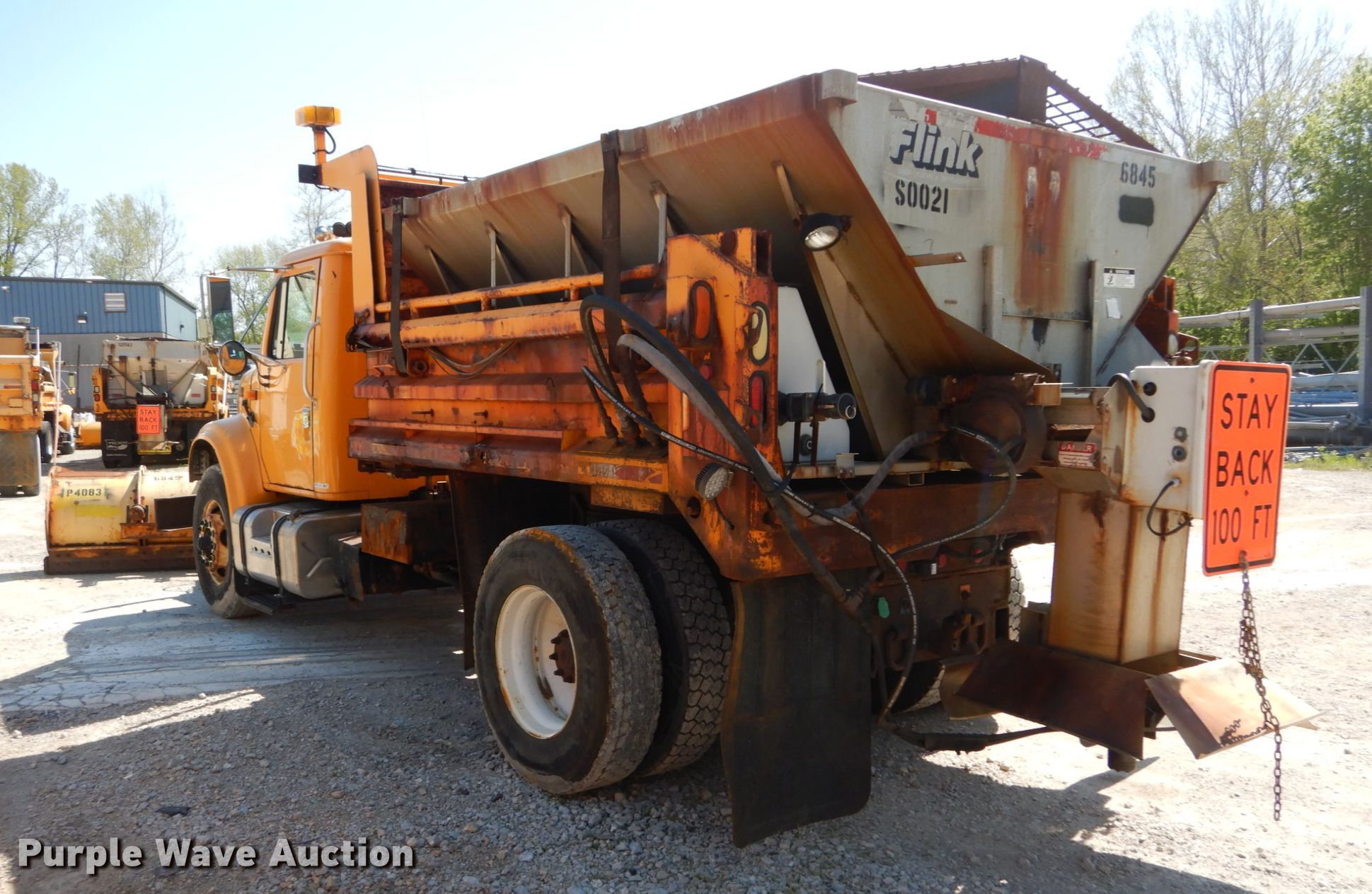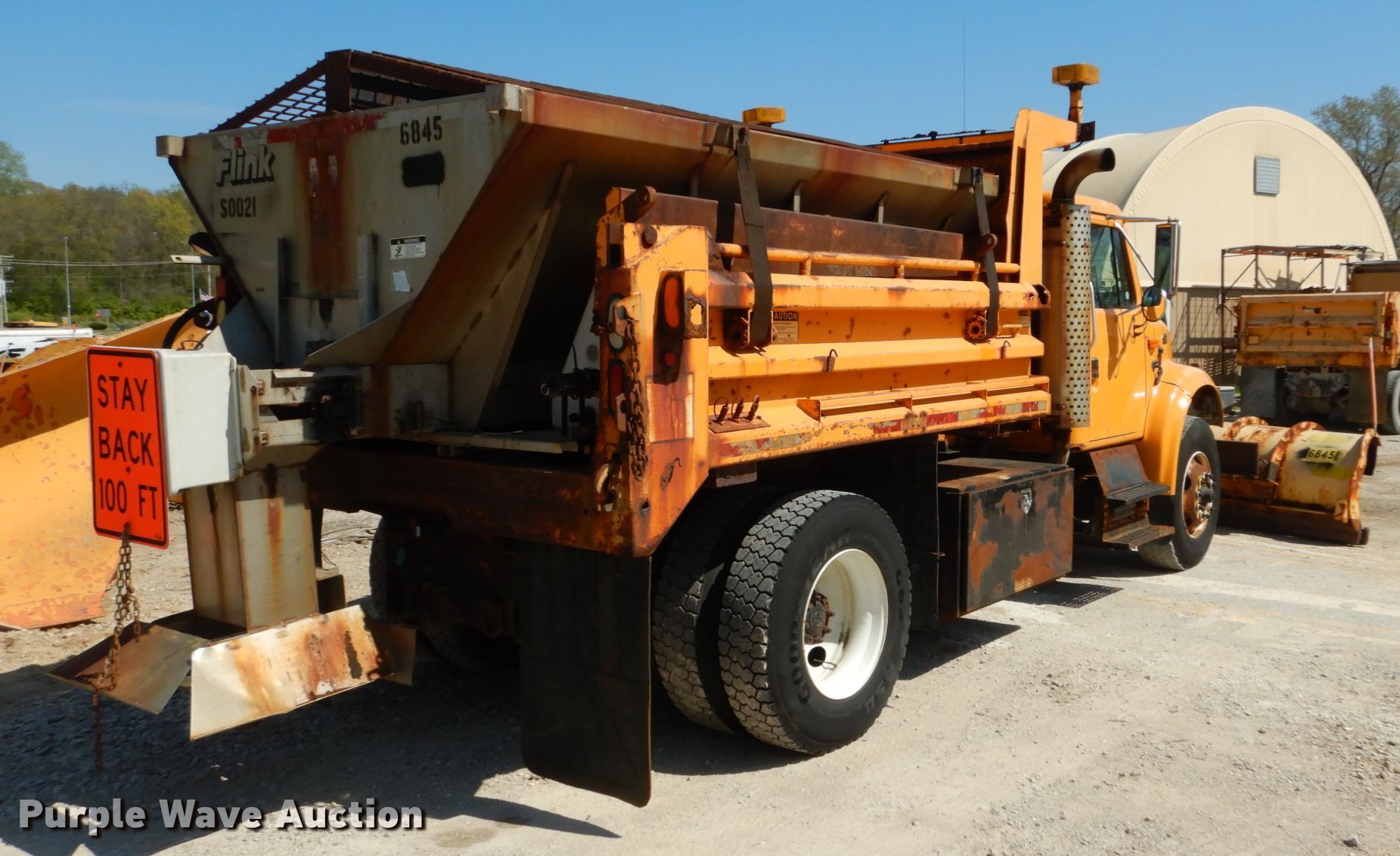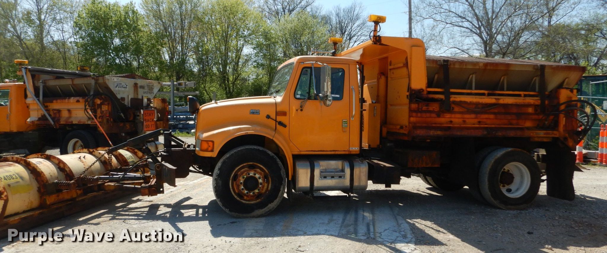 2002 International 4900 dump truck. 163,304 miles on odometer, Engine hours: 10,761, MODOT ID: 6845. Engine International DT466, Displacement: 7.6L, Cylinders: 6, Fuel type: Diesel. Transmission Allison , Automatic. Chassis Axles: Single, Suspension: Spring, Brakes: Air, PTO, GVWR: 37,000 lbs FAWR: 16,000 lbs, RAWR: 21,000 lbs, Wheelbase: 170". Interior AC, Heat, Heated mirrors, Power windows, Cruise control. Operational Dump bed 10' L x 96" W, Side height: 24", Bed type: Steel, Roll tarp, Ram: Single , End gate: Air operated, Spreader Flink, Plow Width: 144". Tires Front: 315/80R22.5, Rear: 11R22.5. Notes Dash warning indicator: ABS, Dead battery , Unknown operating condition of spreader. Missouri title. 1HTSDAAR92H523895. Missouri Department of Transportation (MODOT). 2309 Barrett Station Rd. Ballwin, MO 63021