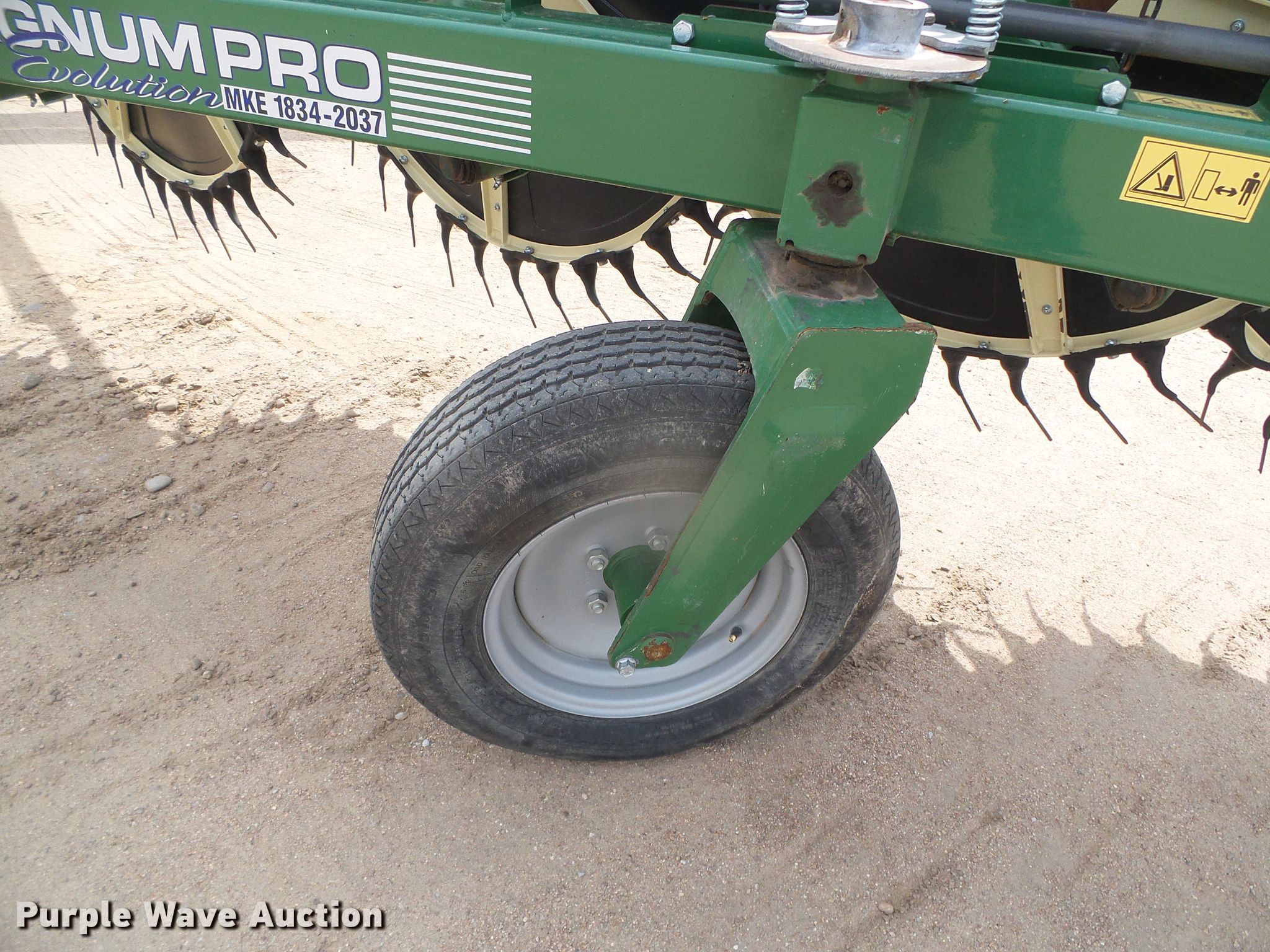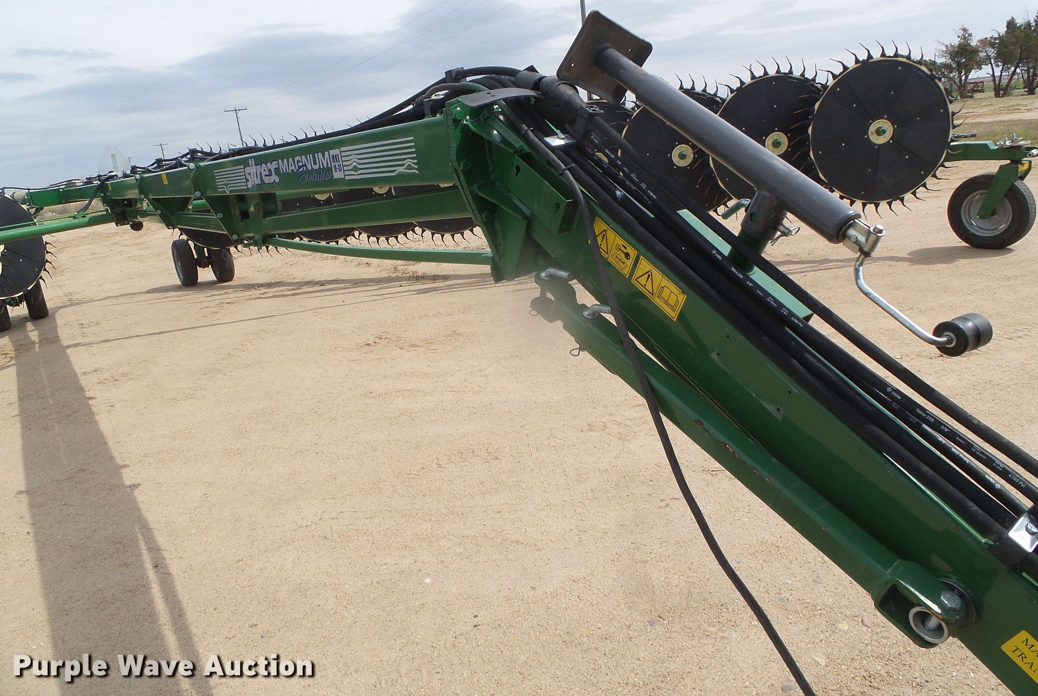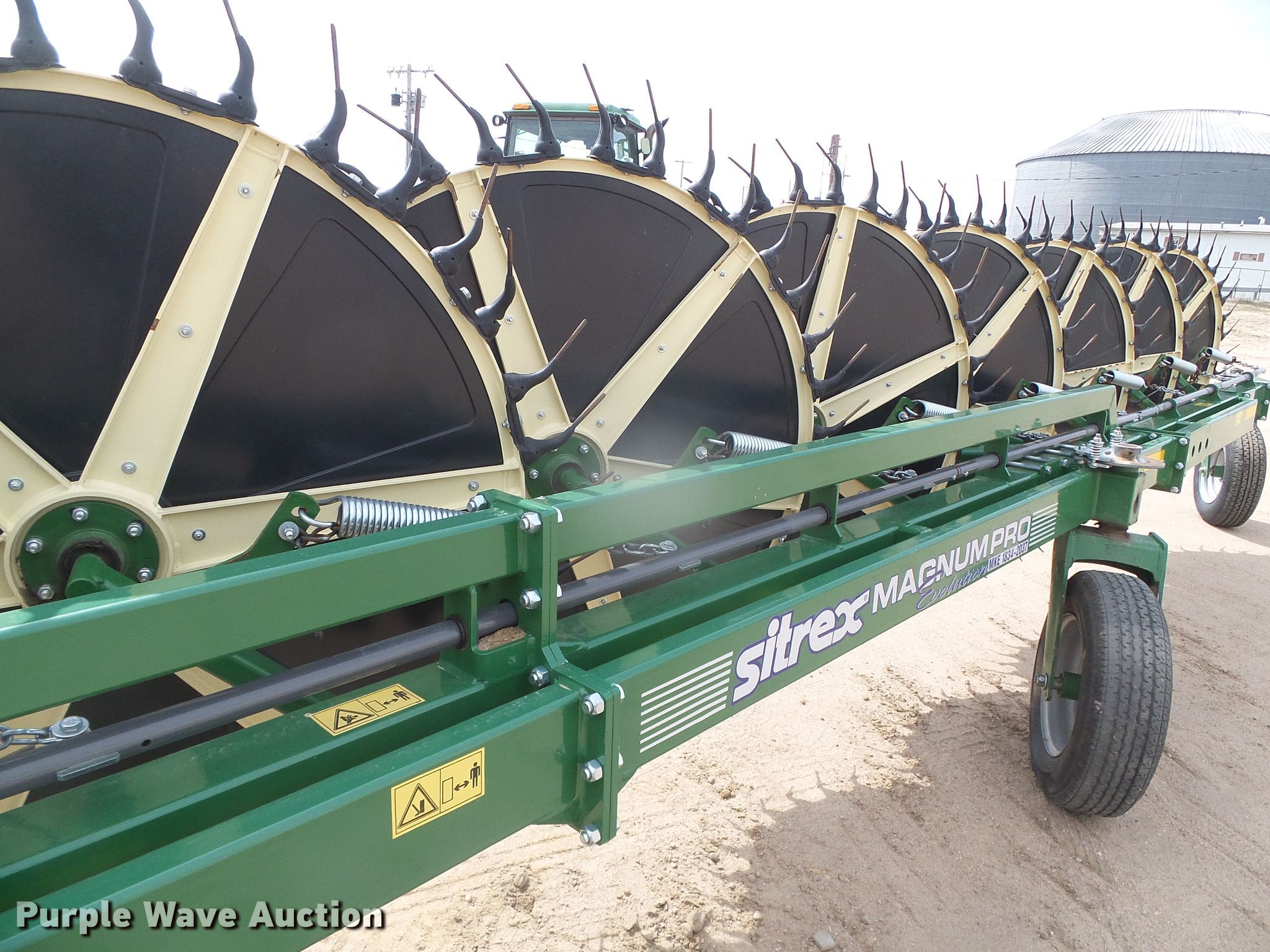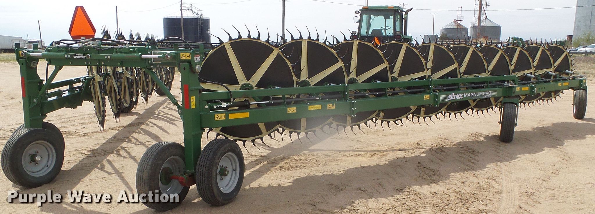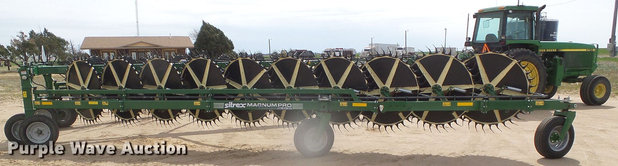 Purple Wave is selling a used Hay Rake in Kansas. This item is a Sitrex Magnum Pro Evolution MKE1834-2037 hay rake with the following: (20) 4' diameter wheels, Hydraulic fold, ST250/75R15 tires
