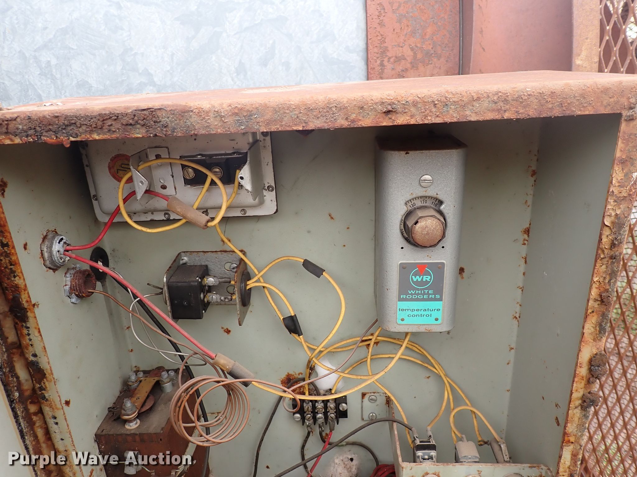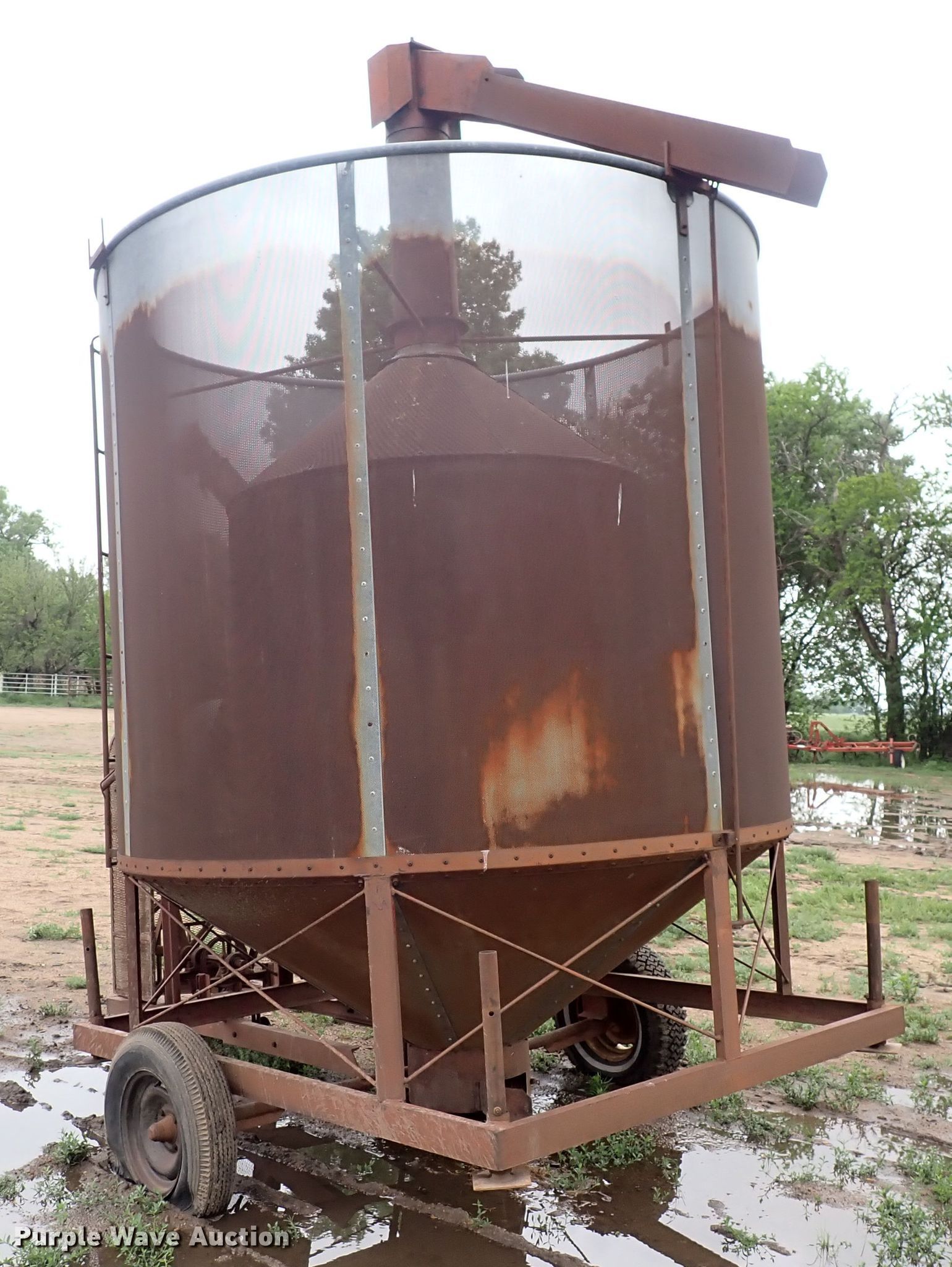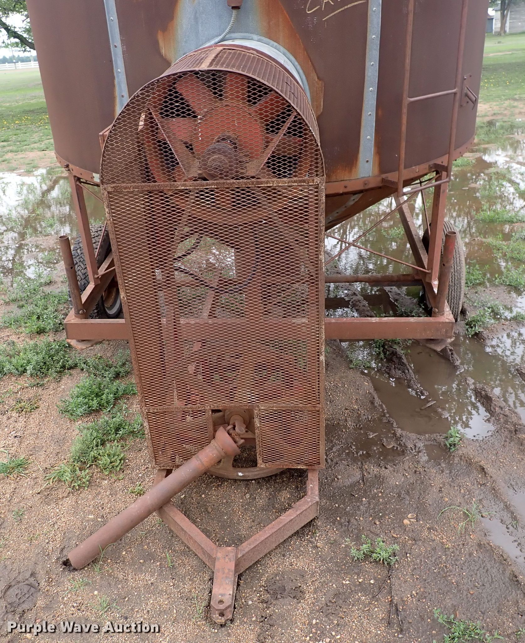 Purple Wave is selling a used Grain Dryer in Kansas. This item is a Gilmore grain dryer with the following: Dial thermometer, 6.70-15 tires, Flat tire, PTO end shaft missing