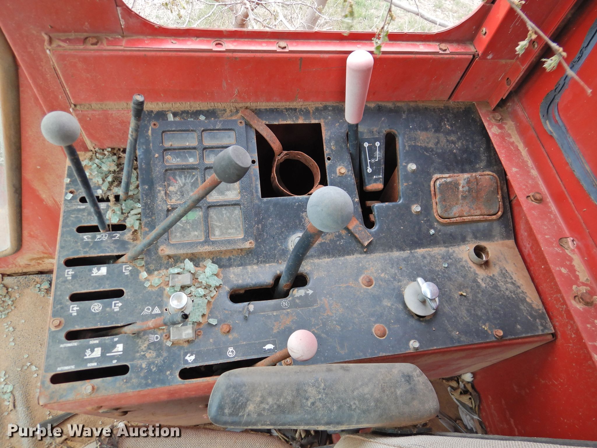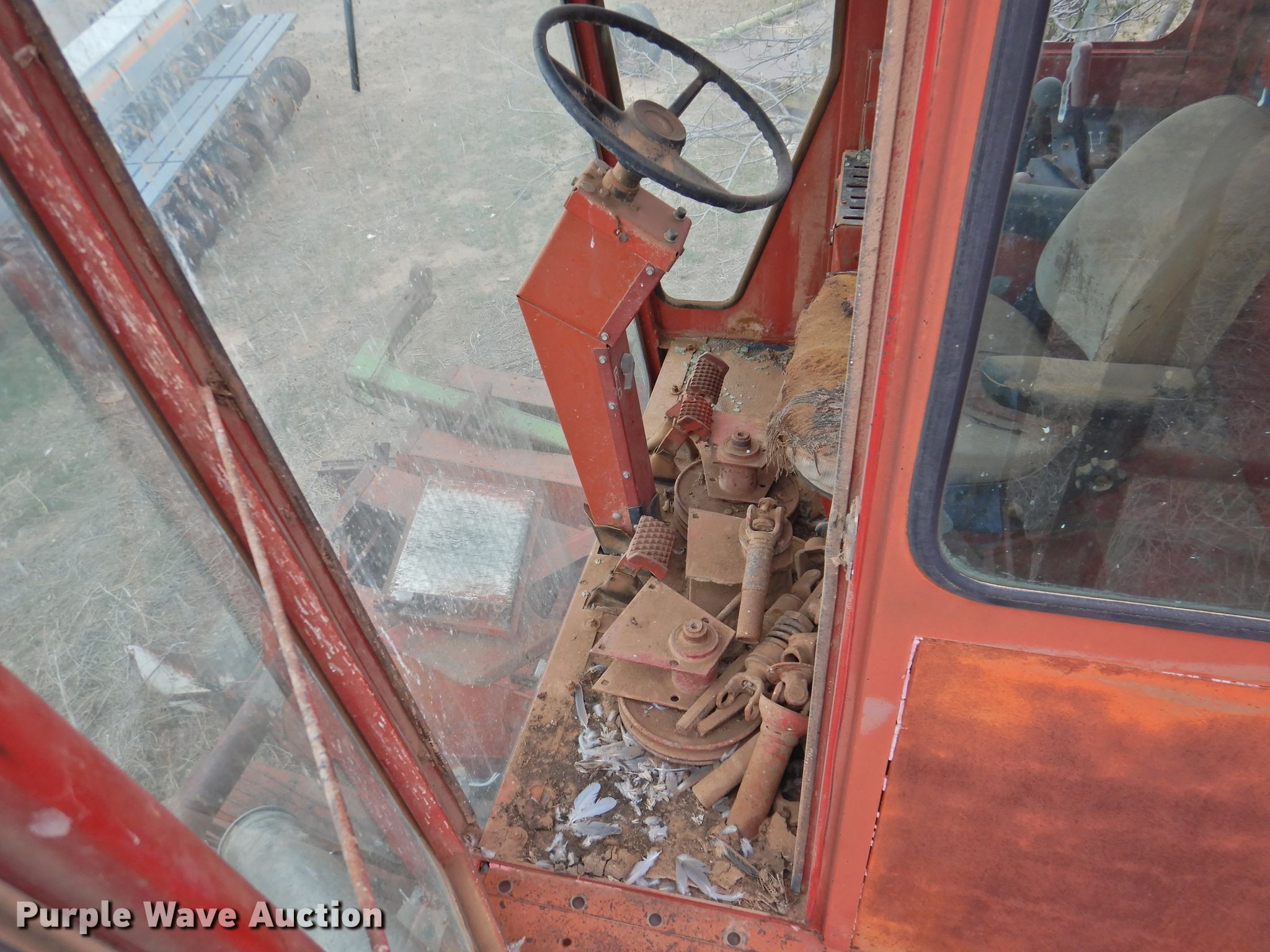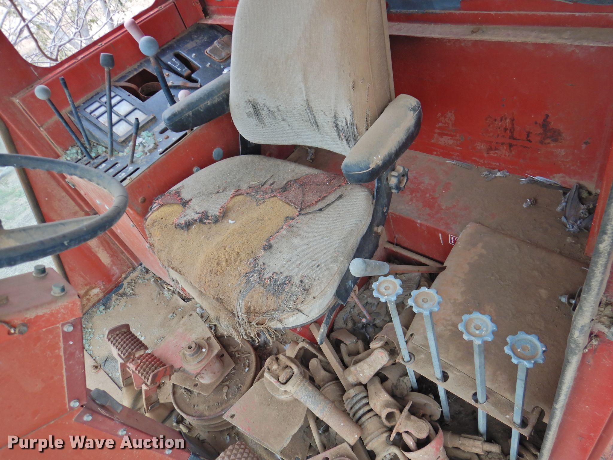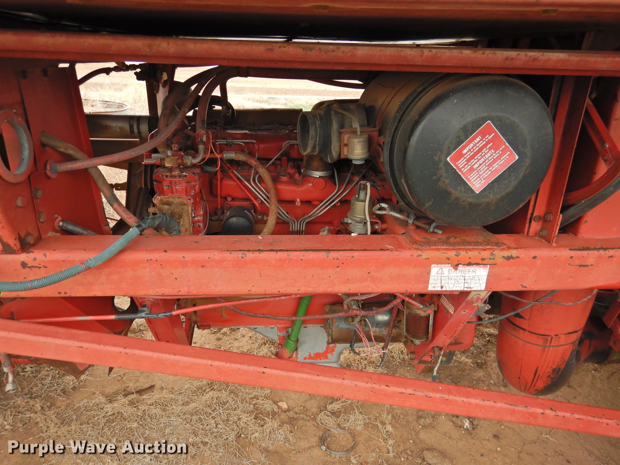 International 1400 cotton stripper. Serial: 0950174U001104. Engine International, Displacement: 358 C.I.D., Cylinders: 6, Fuel type: Diesel. Transmission Hydrostatic, 3F - 3R. Operational Header International, Serial: 0951084U001150, Stripper head Width: 12', Rows: 4. Notes Parts missing from engine compartment , Rear Tires missing, Non-operational unit, Serial 0950174U001104. Dutton Farms. 1499 County Rd 2. Tulia, TX 79088