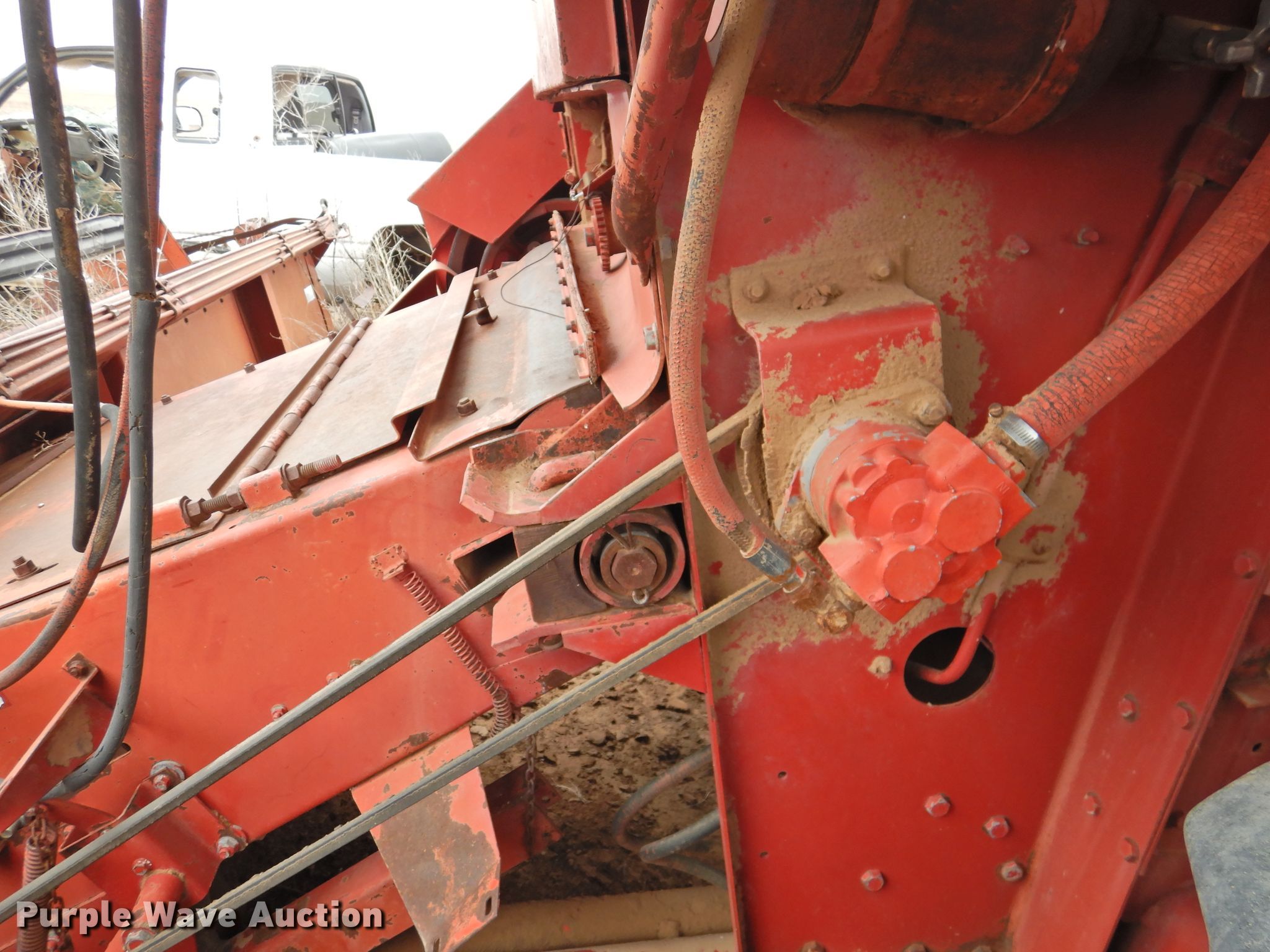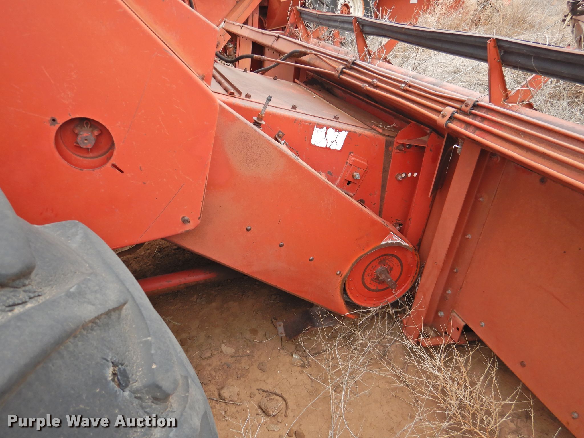 International 1480 combine. Unknown hours on meter, Serial: 1720225U014502. Engine International, Displacement: 7.6L, Cylinders: 6, Fuel type: Diesel. Transmission Hydrostatic, 3F - 3R. Interior AC, Heat. Operational Rigid platform head Width: 24', Reel: Bat. Tires Front: 24.5-32, Rear wheels and tires missing. Notes Non-operational unit. Dutton Farms. 1499 County Rd 2. Tulia, TX 79088