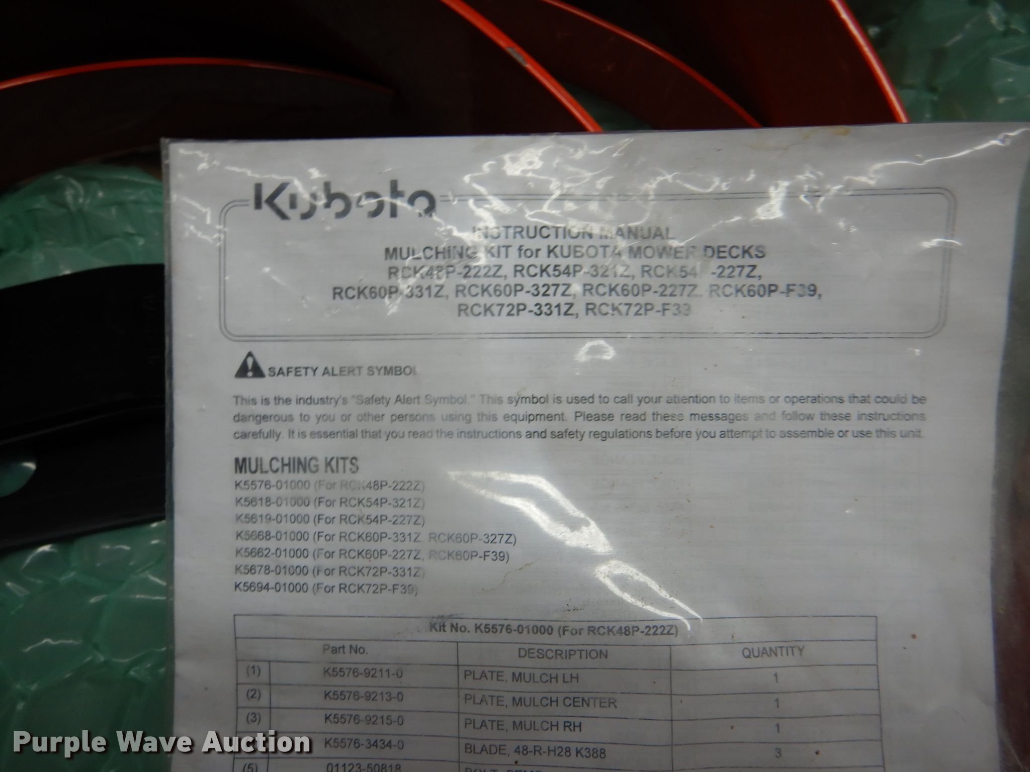 Purple Wave is selling a used Lawn and Garden in Kansas. This item is a Kubota mulch kit with the following: Kubota mulch kit. KanEquip Inc.. 2901 NW US 24 Hwy. Topeka, KS 66618