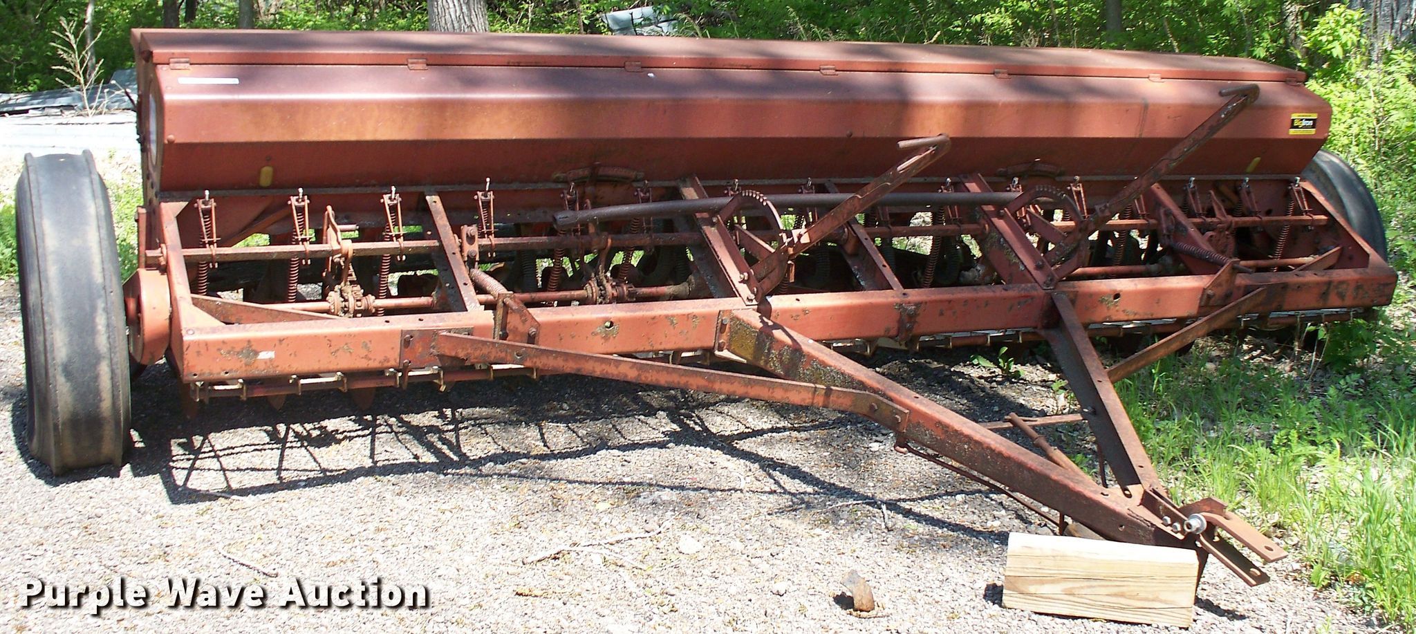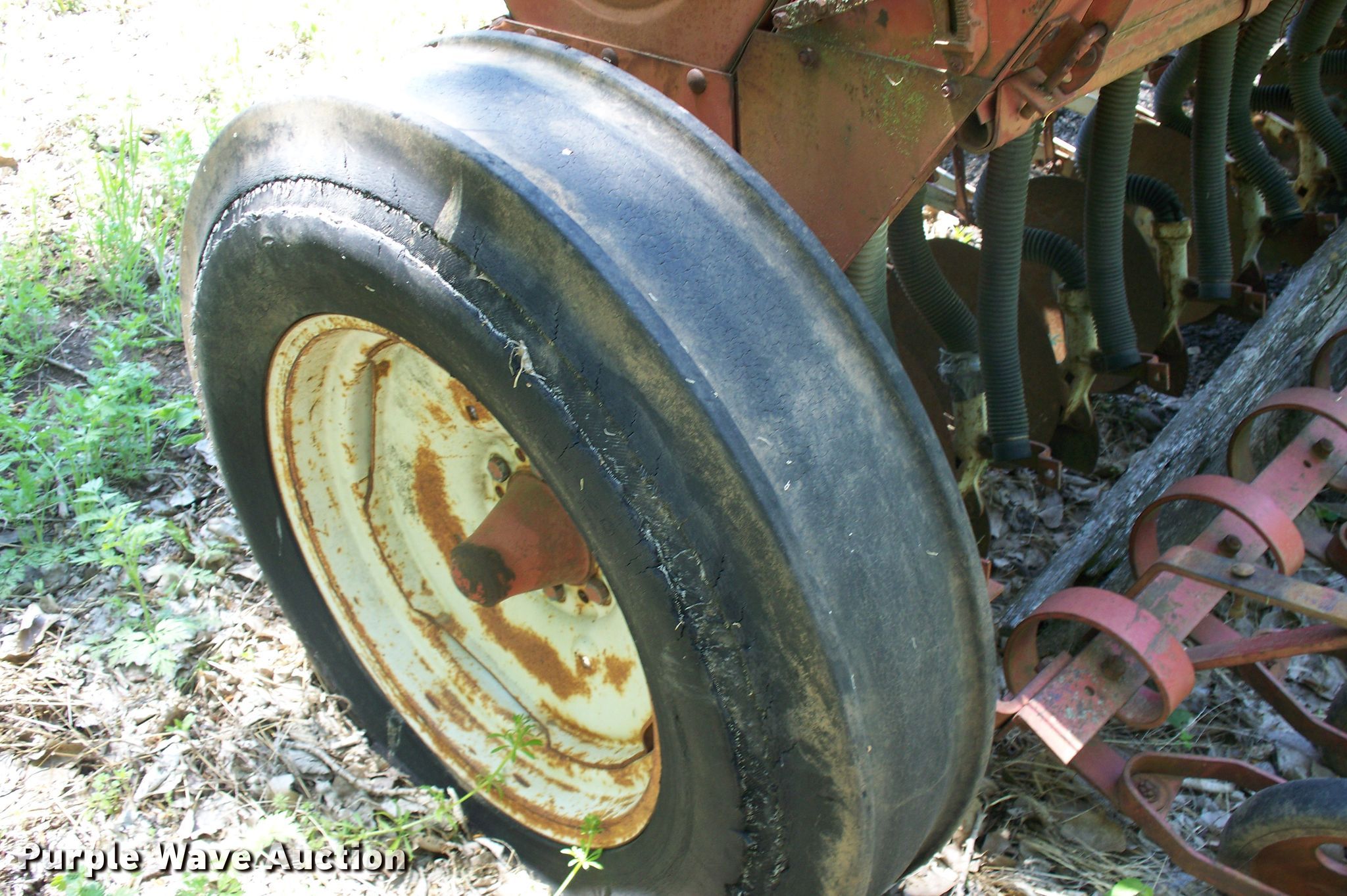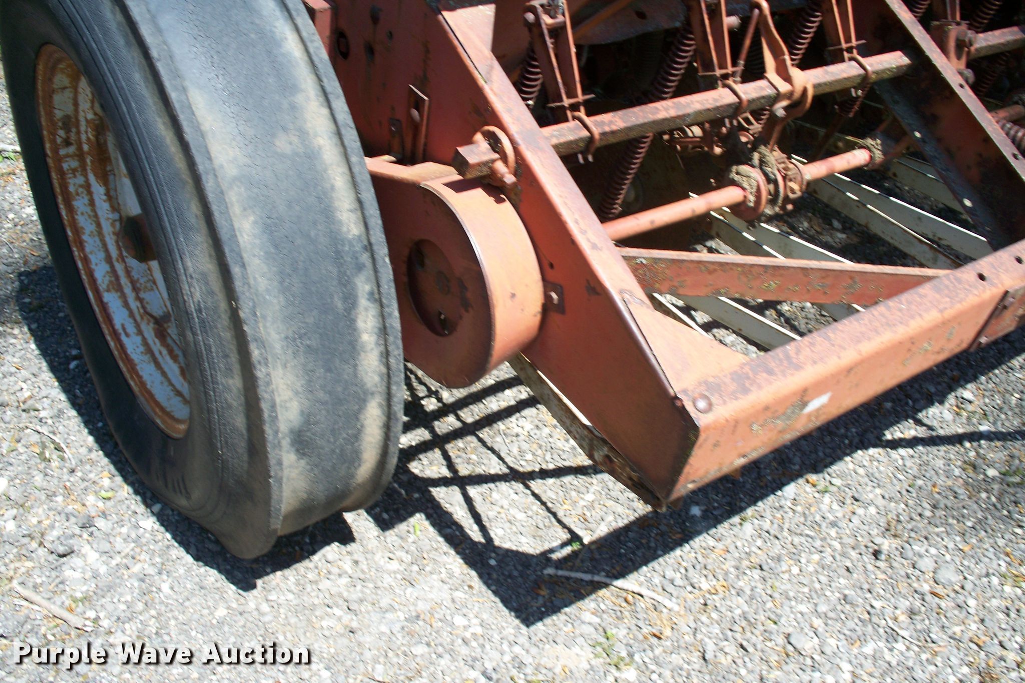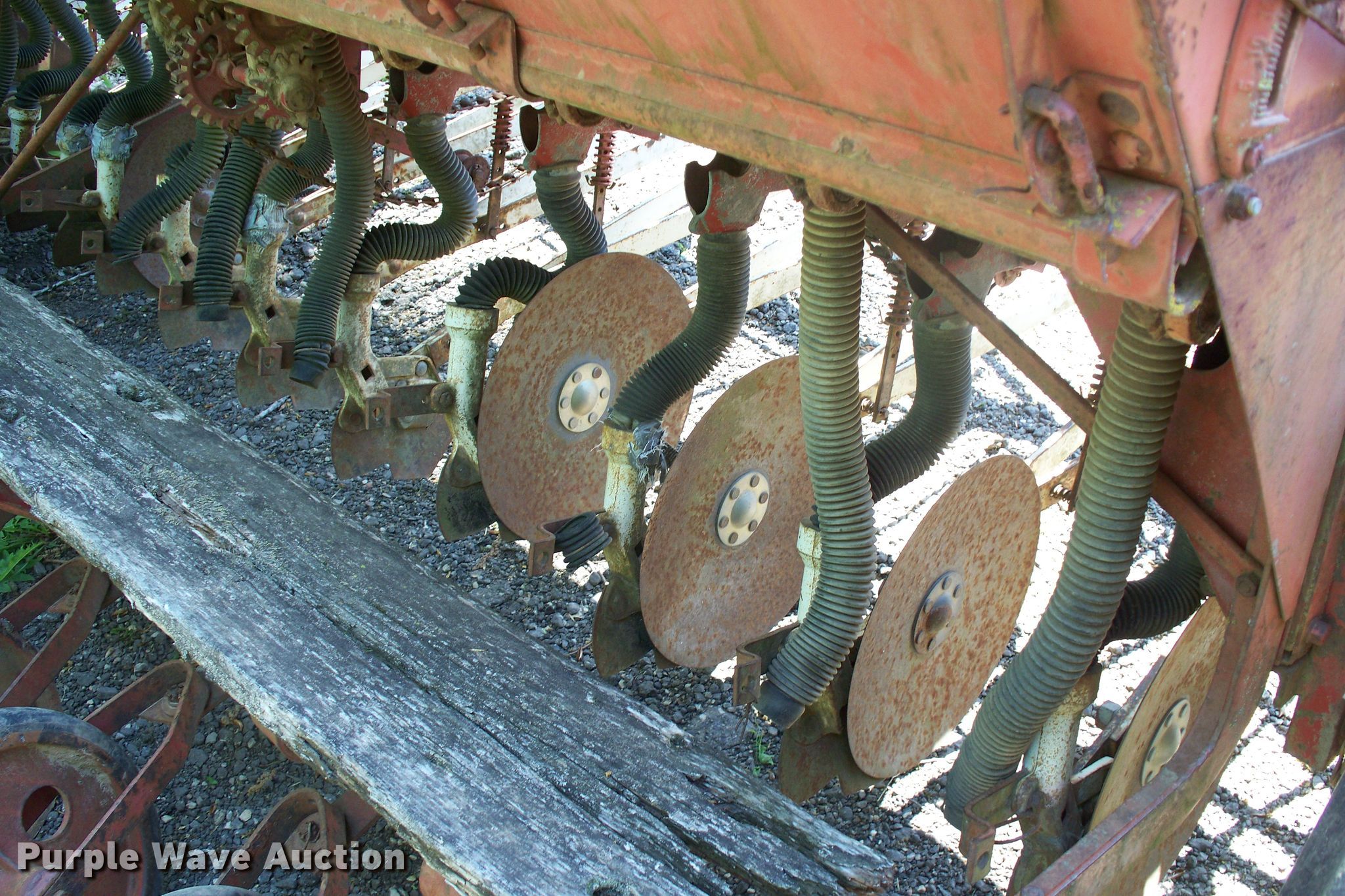 International Harvester grain drill. Row units: 16, Row spacing: 10". Operational Seed delivery Bulk fill system, Row units Meter drive: Ground, Down pressure: Spring, Disk openers: Single , Closing system: Single Type: Rubber.. Notes Parts may be missing, Unknown operating condition. 645 170th Road. Bennington, KS 67422