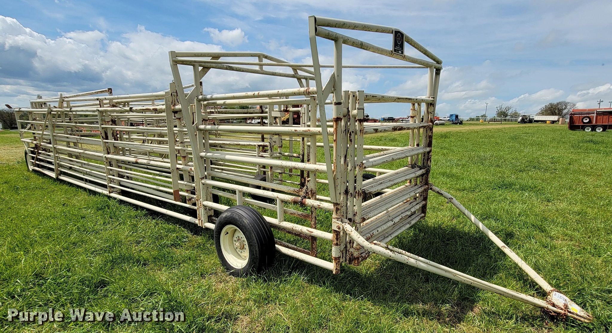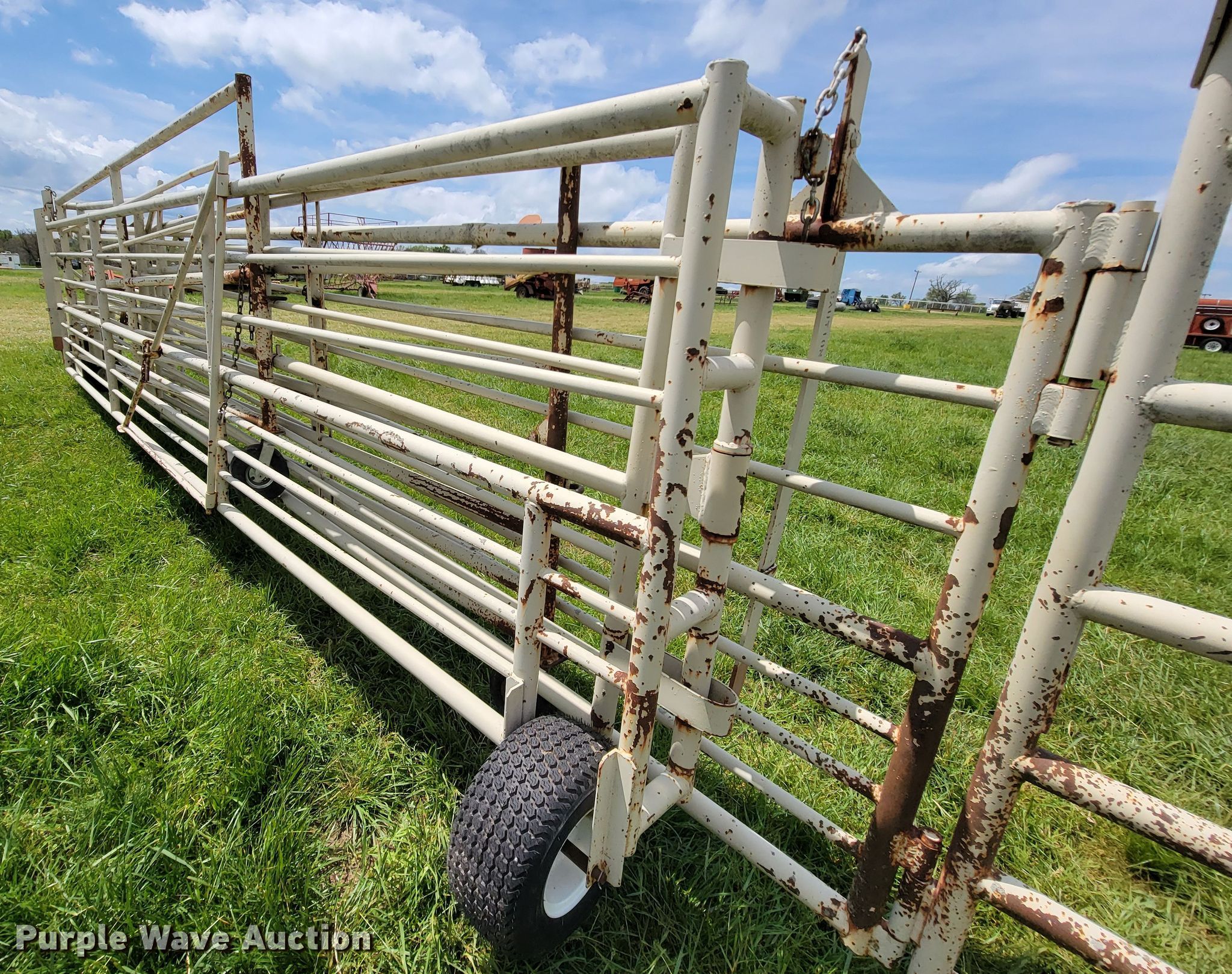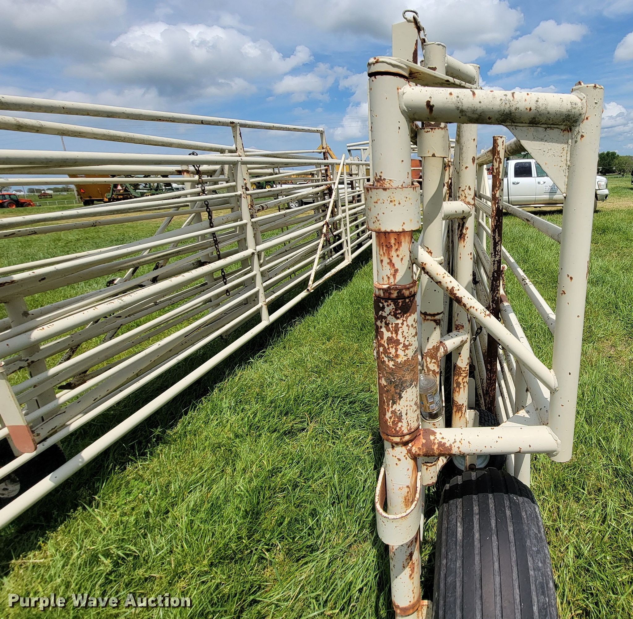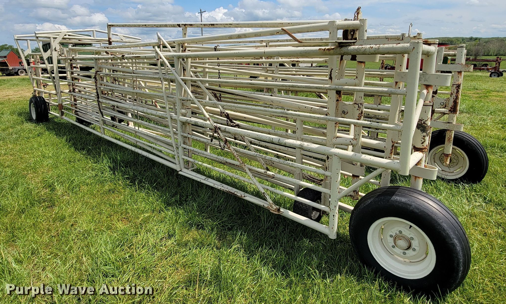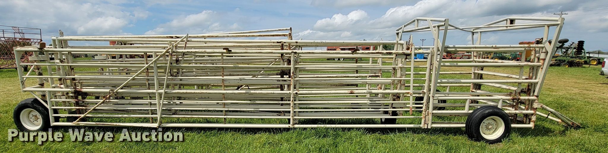 Purple Wave is selling a used Livestock Equip. in Missouri. This item is a Wilson corral with the following: (11) panels, (2) 24'L, (2) 22'L, (2) 20'L, (2) 10'L, (3) 6'L, 10' swing gate, (2) gauge wheels, 11L-15 tires, Serial 2214