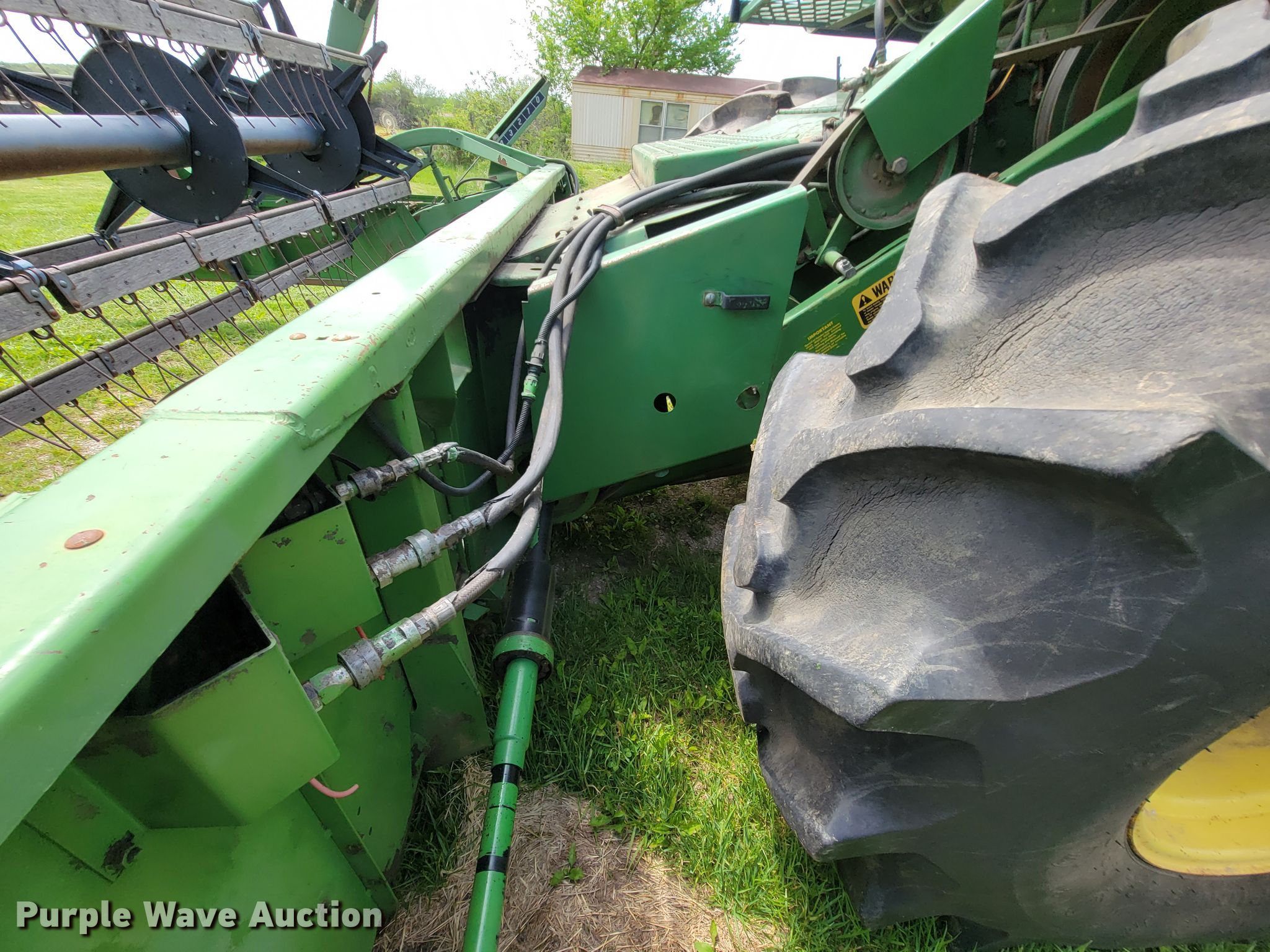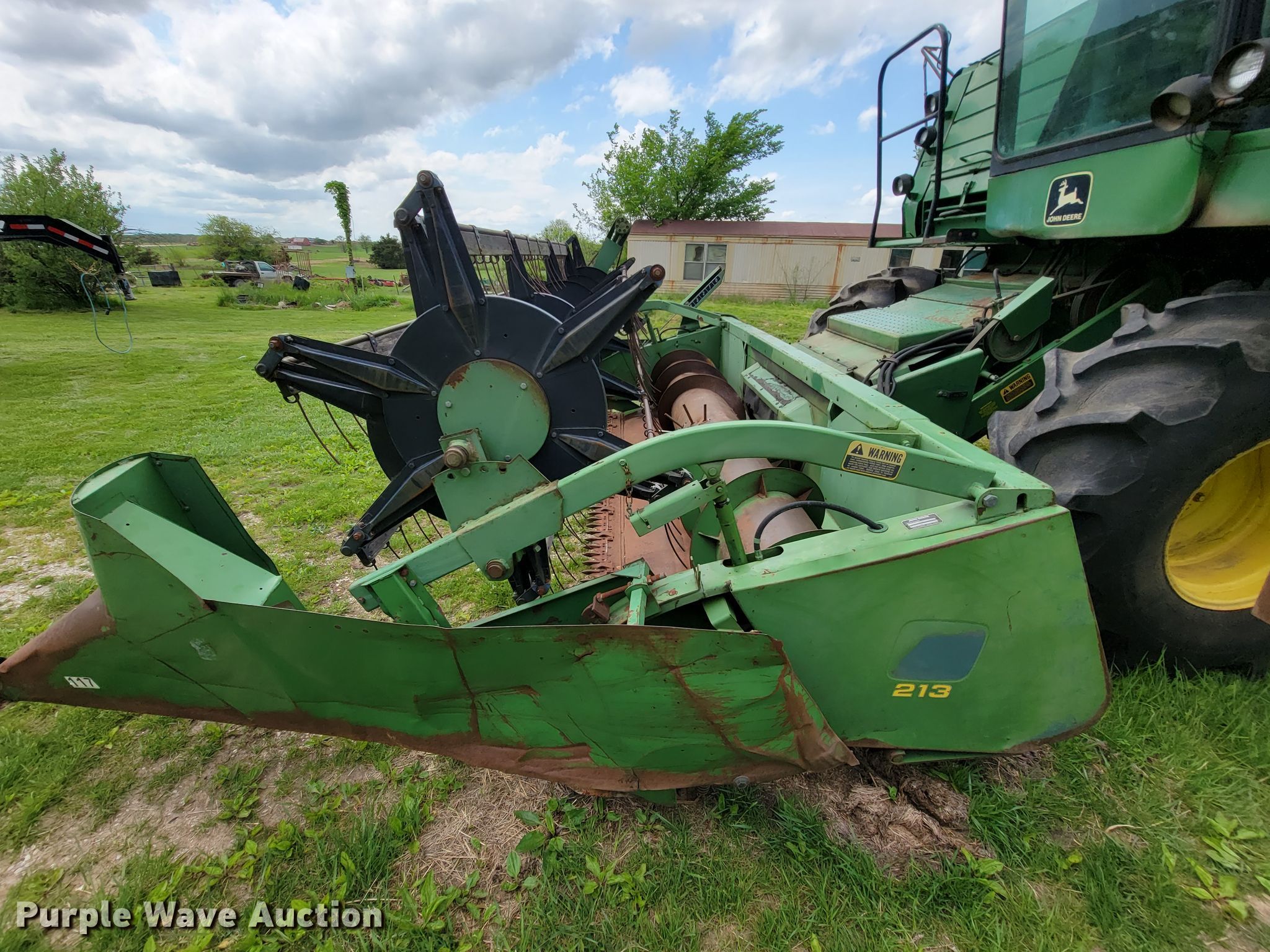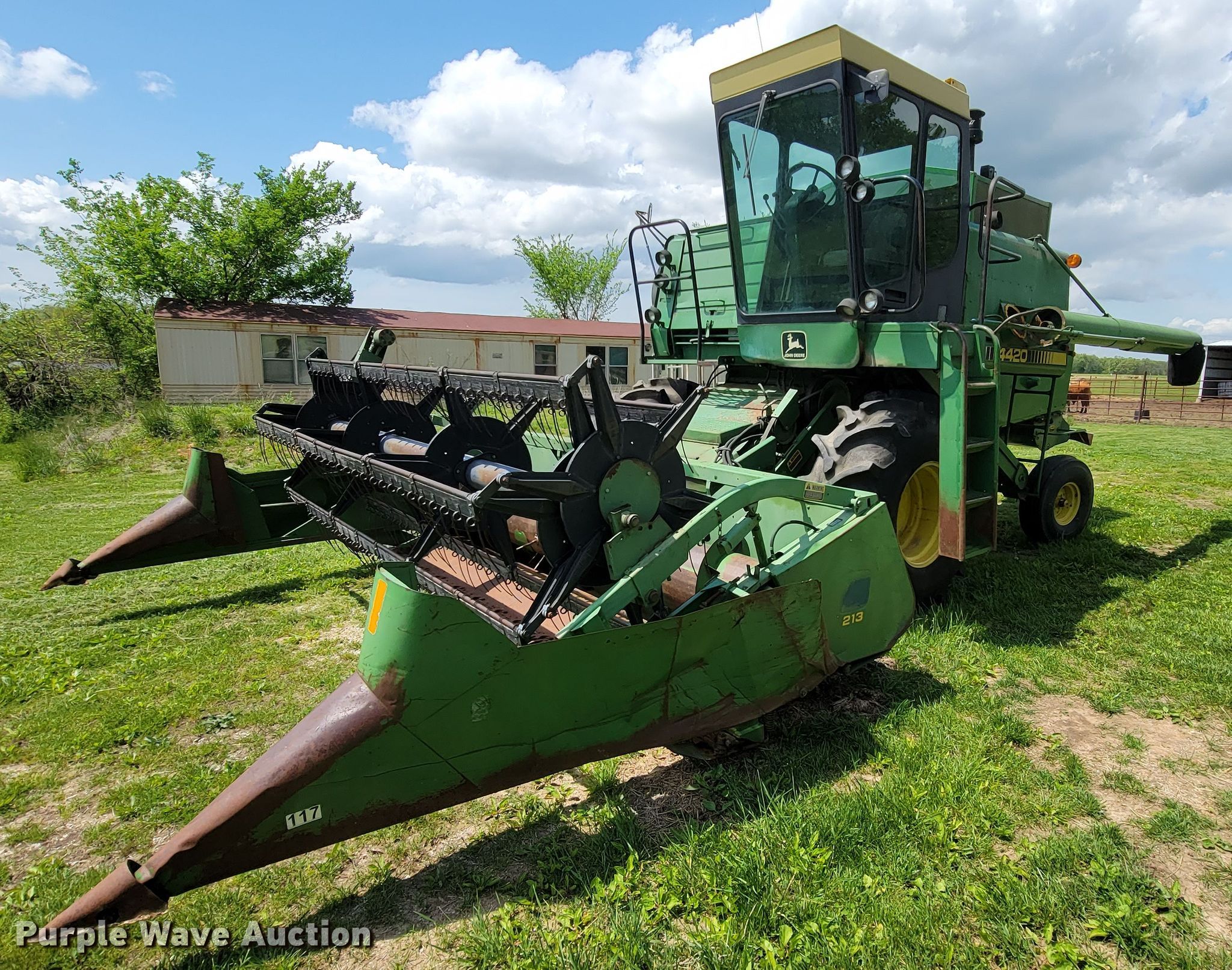 1984 John Deere 4420 RWA combine. Engine hours: 3,633, Serial: H04420X600240. Engine Cylinders: 6, Fuel type: Diesel. Transmission Manual, 4F - 1R. Interior Heat. Operational Rotor speeds: 2, Straw chopper, Unloading auger length: 11' 5", Platform head John Deere 213, Width: 13', Reel: Finger, Drivelines: Dual. Tires Front: 11.00-16, Rear: 23.1-26. 905 E 477th Rd. Bolivar, MO 65613