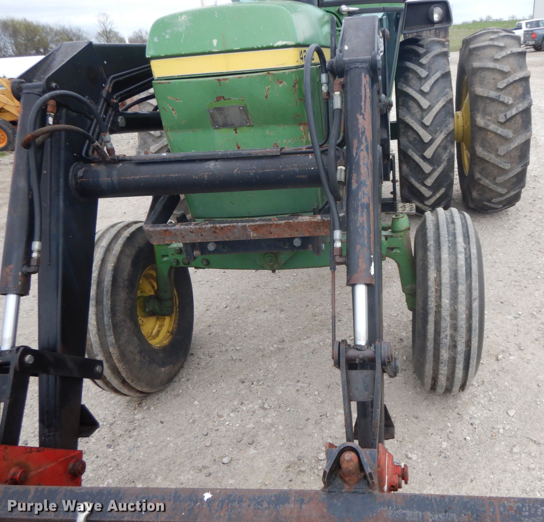 1973 John Deere 4230 tractor. 8,544 hours on meter, Serial: 003617R. Engine John Deere, Serial: 6404DR-12, Displacement: 404 C.I.D, Cylinders: 6, Fuel type: Diesel. Transmission Quad-range, 16F - 6R. Operators station AC, Heat. Operational PTO: 1000, Three point Top link, Hydraulic remote sets Rear: 2, Loader Westendorf, Quick attach, Bale spear, Controls: Two lever, Bucket Width: 72".. Tires Front: 10.00-16, Rear: 18.4-34, Duals. 18641 Vernon Kennedy Ave. Mendon, MO 64660
