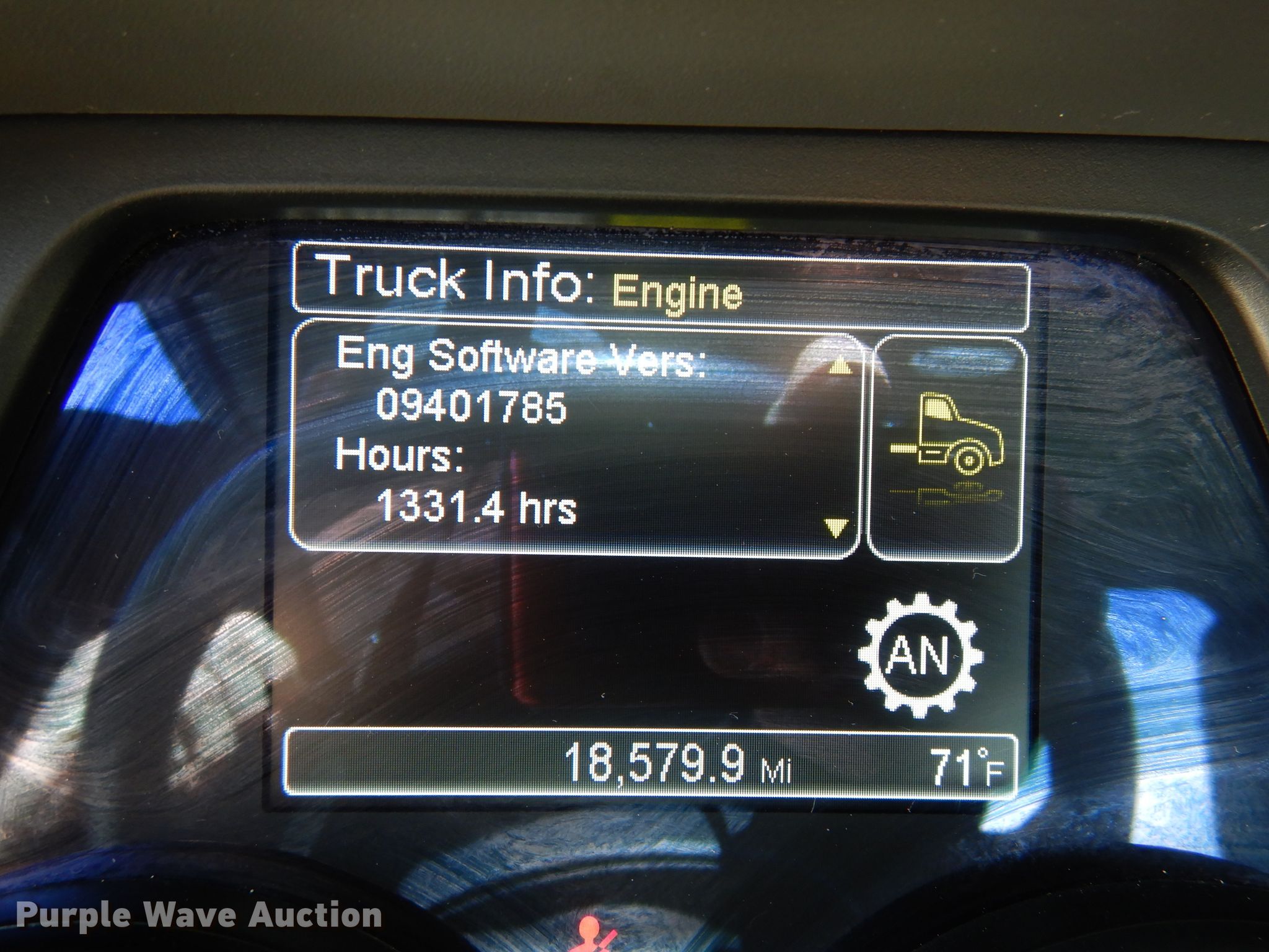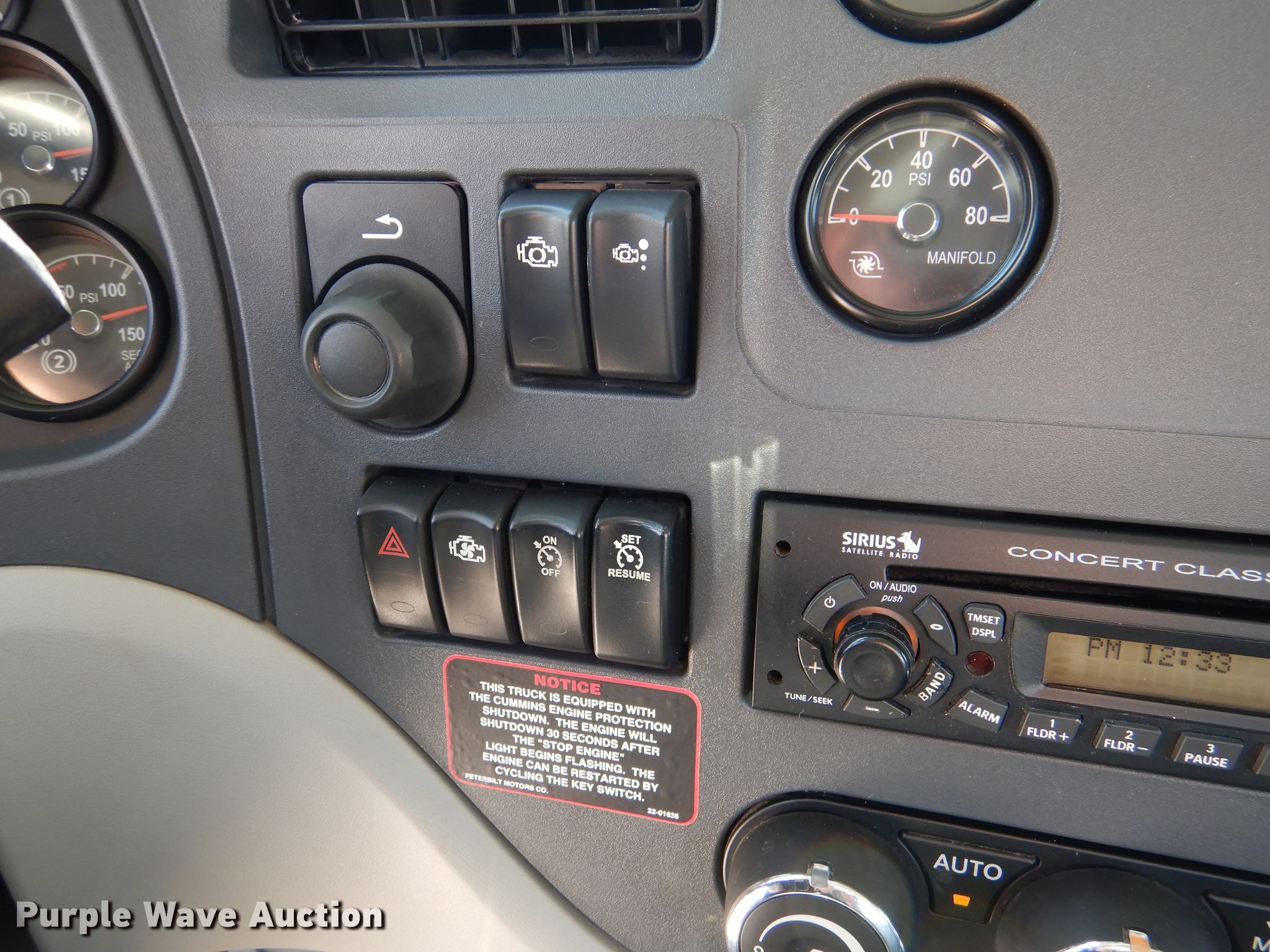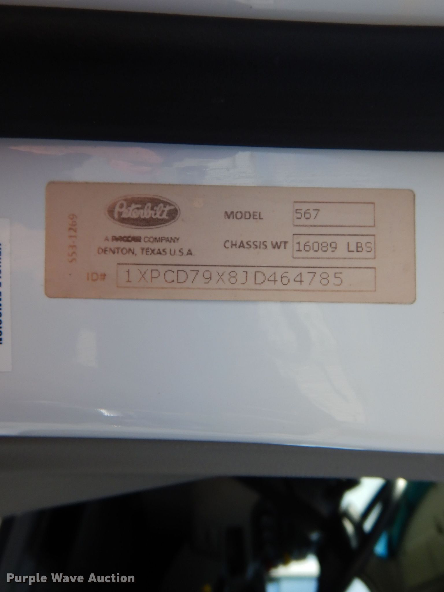 2018 Peterbilt 567 semi truck. 18,580 miles on odometer, Engine hours: 1,331. Engine Cummins ISX12-425V, Serial: 75059508, Displacement: 11.9L, Cylinders: 6, Fuel type: Diesel, HP: 500, Engine brake. Transmission Eaton Fuller FA0-16810C-EA8, Automatic. Chassis Axles: Tandem, Differential lock: Inter-axle, Suspension: Air Dump valves, Brakes: Air, PTO, GVWR: 53,200 lbs FAWR: 13,200 lbs, IAWR: 20,000 lbs, RAWR: 20,000 lbs, Wheelbase: 196". Interior AC, Heat, Power windows, Power locks, Cruise control, Air ride cab. Operational Deck plate: Aluminum, Fifth wheel type: Air operated, Fuel tank: Single. Tires Size: 11R22.5. Notes Windshield chipped or cracked. Kansas title. 1XPCD79X8JD464785. Midwest Concrete Materials. Manhattan, KS 66503