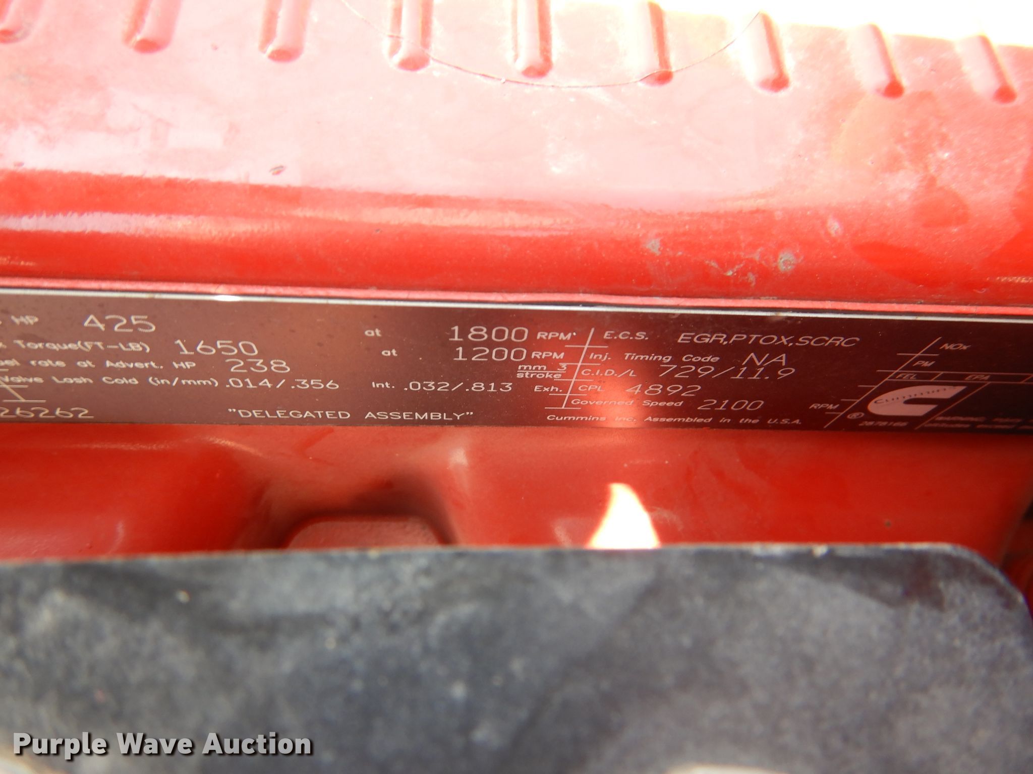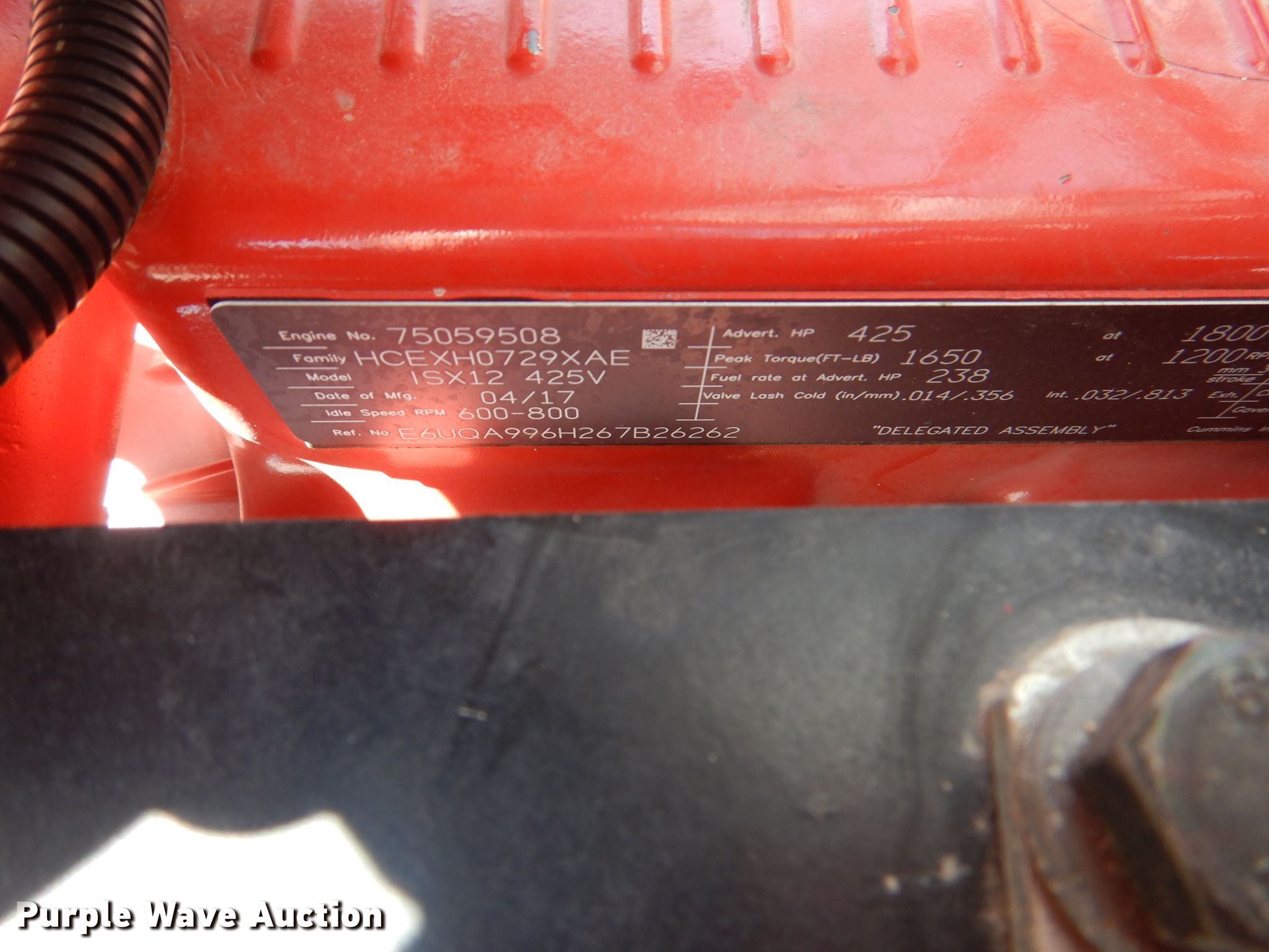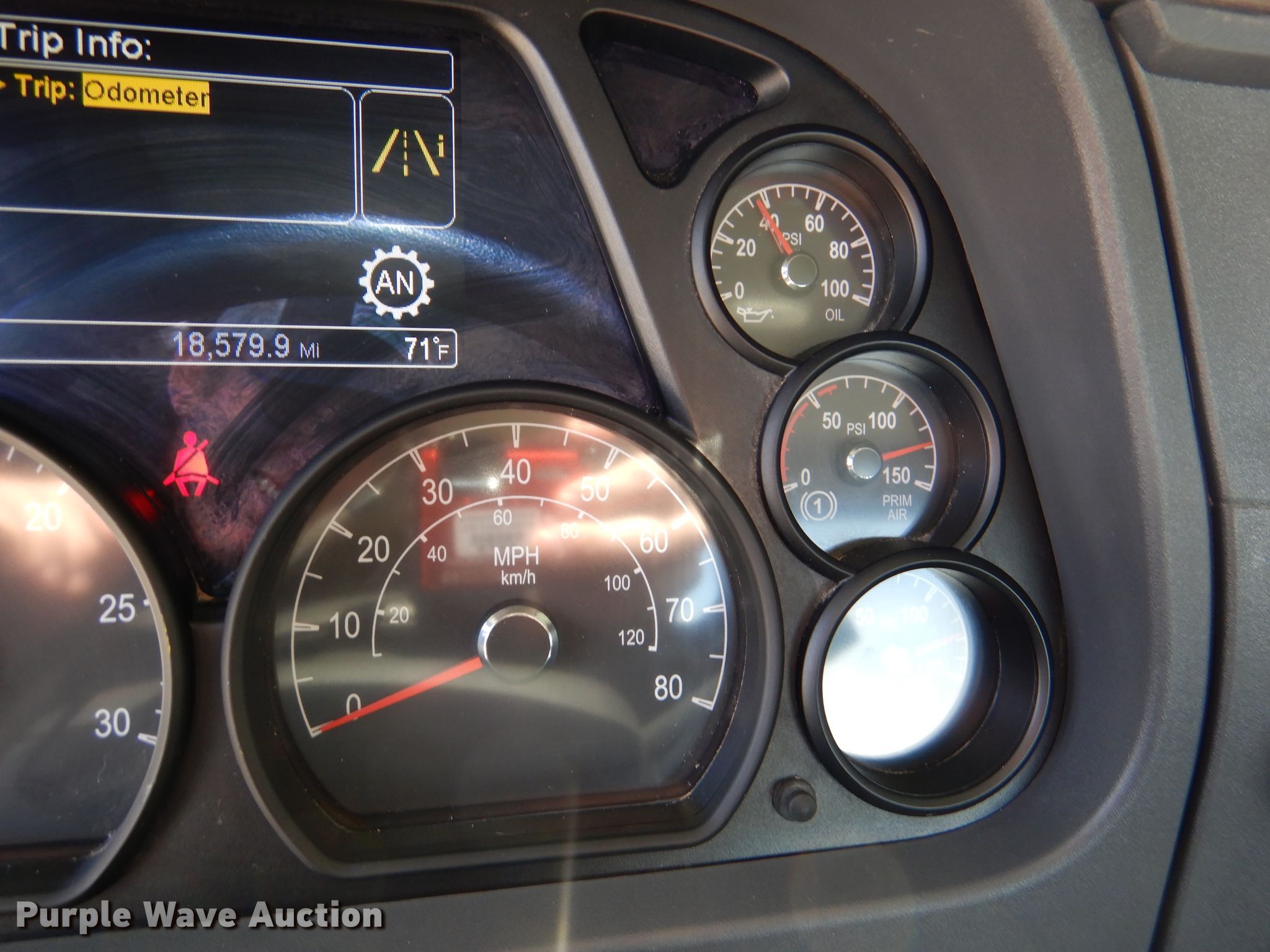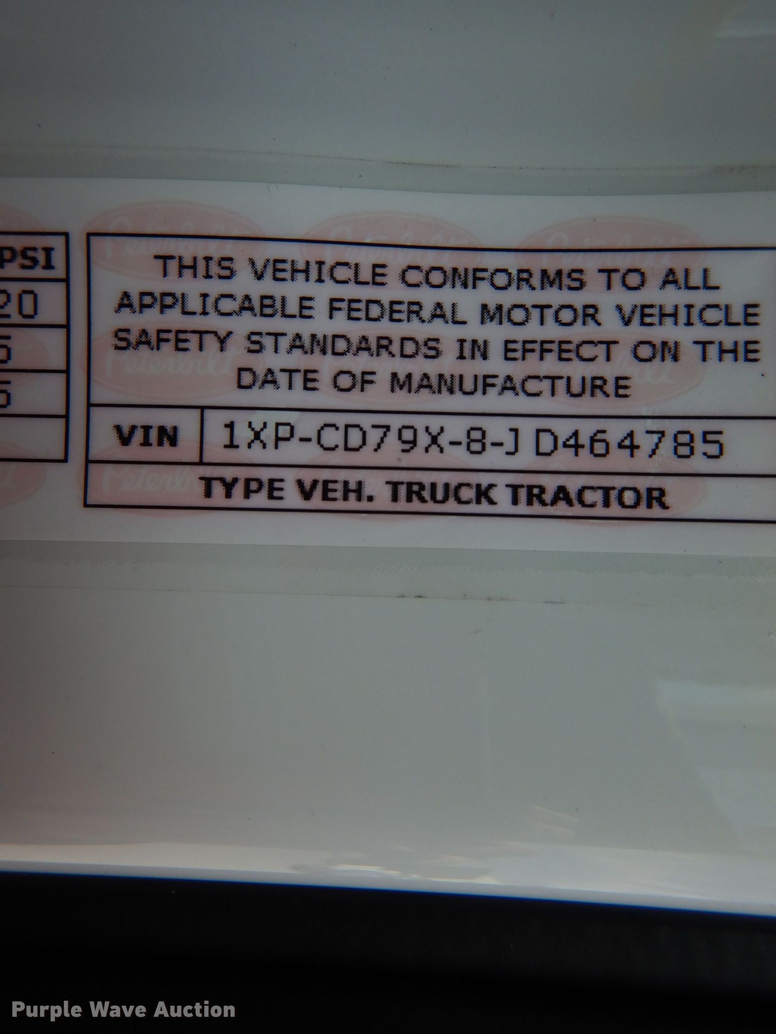 2018 Peterbilt 567 semi truck. 18,580 miles on odometer, Engine hours: 1,331. Engine Cummins ISX12-425V, Serial: 75059508, Displacement: 11.9L, Cylinders: 6, Fuel type: Diesel, HP: 500, Engine brake. Transmission Eaton Fuller FA0-16810C-EA8, Automatic. Chassis Axles: Tandem, Differential lock: Inter-axle, Suspension: Air Dump valves, Brakes: Air, PTO, GVWR: 53,200 lbs FAWR: 13,200 lbs, IAWR: 20,000 lbs, RAWR: 20,000 lbs, Wheelbase: 196". Interior AC, Heat, Power windows, Power locks, Cruise control, Air ride cab. Operational Deck plate: Aluminum, Fifth wheel type: Air operated, Fuel tank: Single. Tires Size: 11R22.5. Notes Windshield chipped or cracked. Kansas title. 1XPCD79X8JD464785. Midwest Concrete Materials. Manhattan, KS 66503