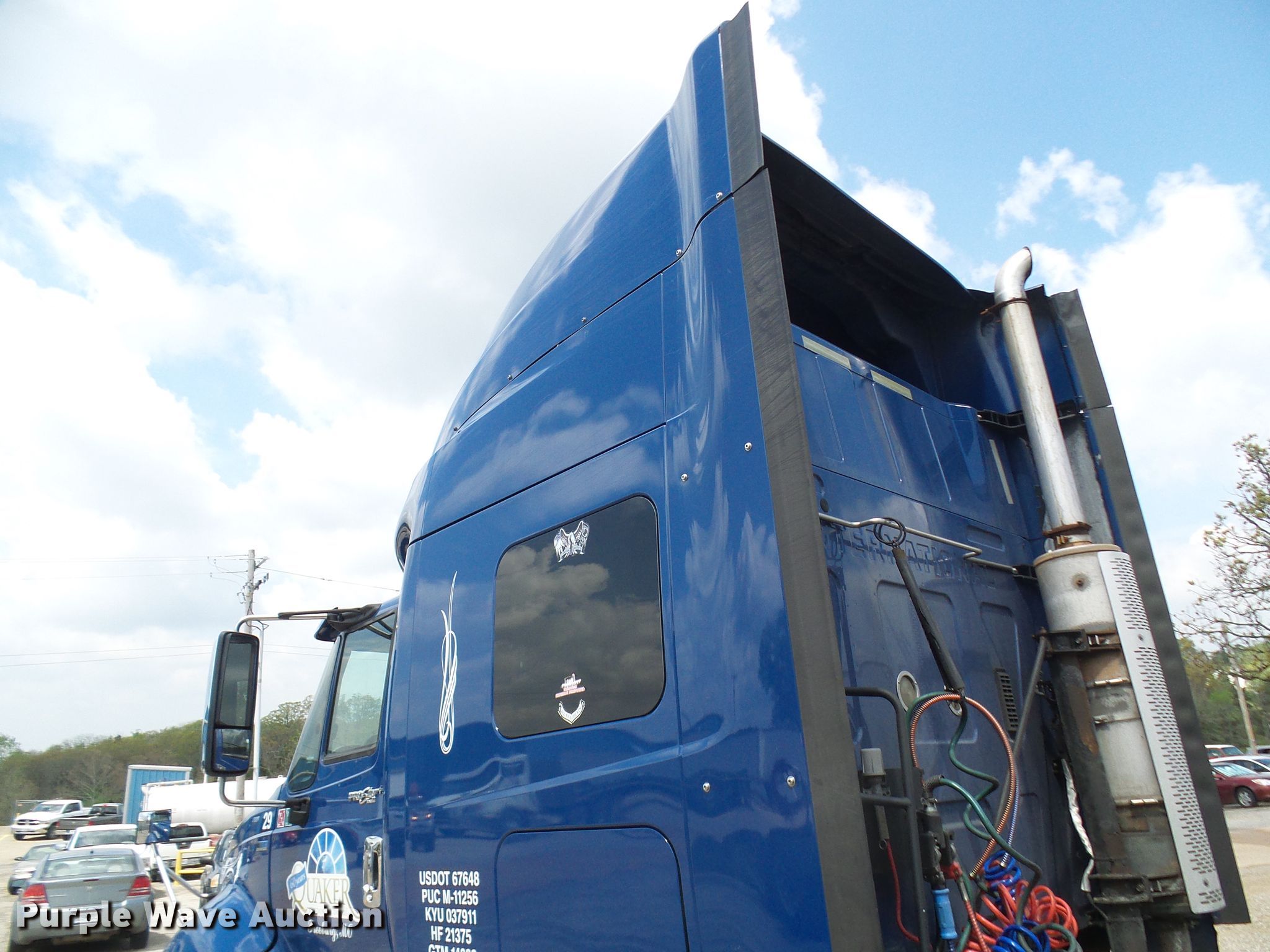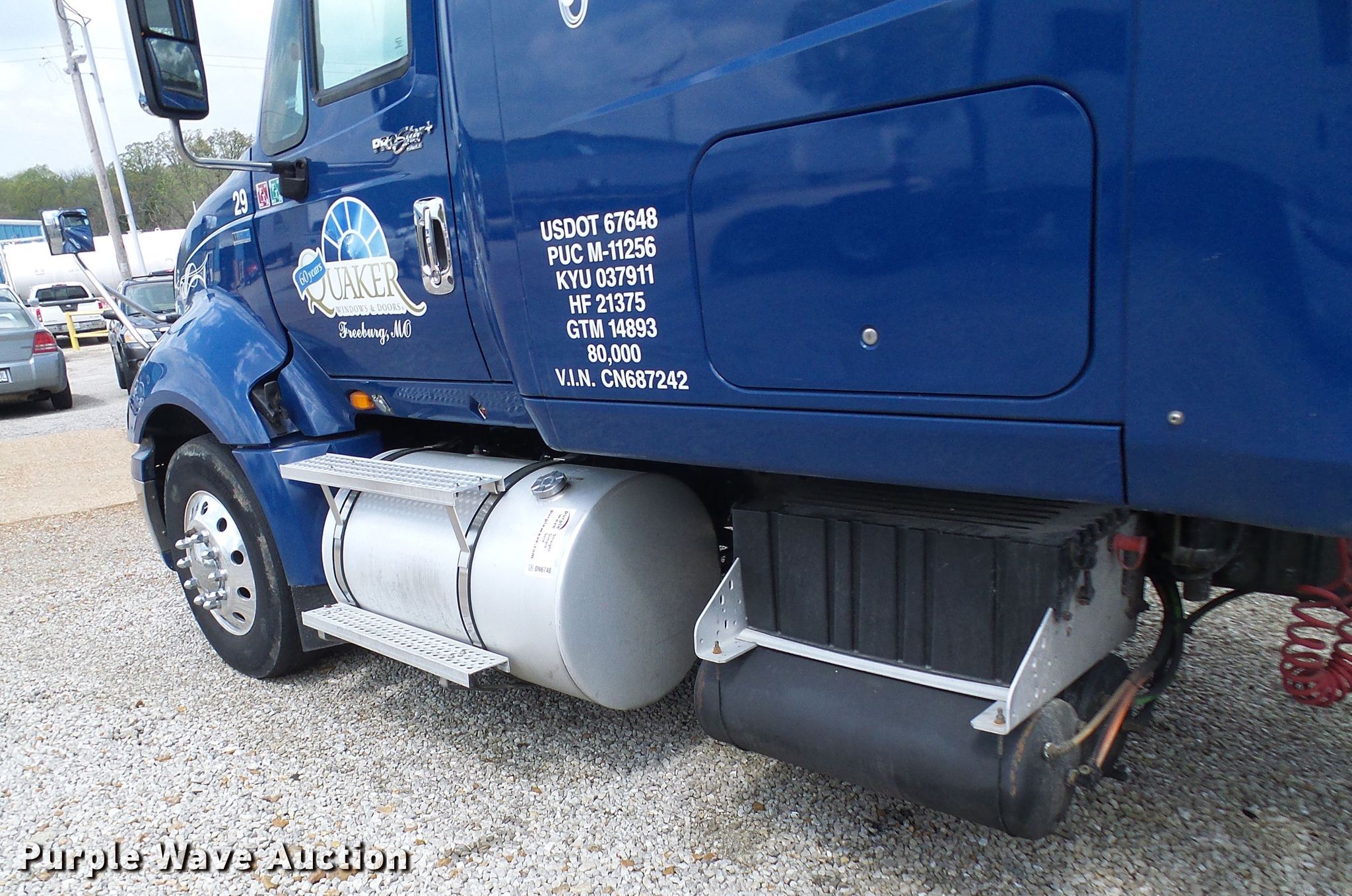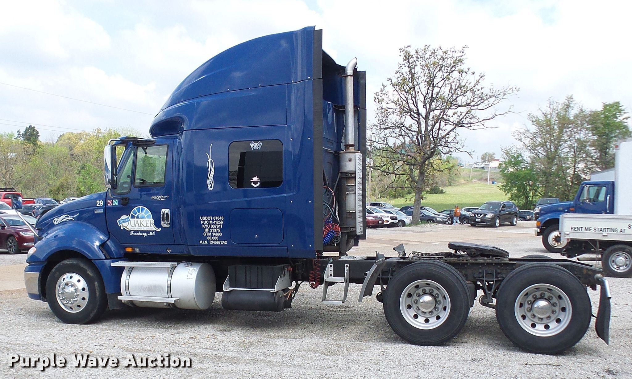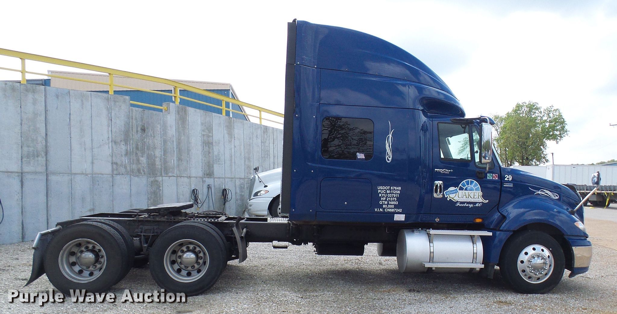 2012 International ProStar truck tractor. 696,986 miles on odometer, Engine hours: 24,181. Engine International , Displacement: 13.0L , Cylinders: 6, Fuel type: Diesel. Transmission Eaton Fuller, Manual, Speed: 13. Chassis Axles: Tandem, Differential lock: Inter-axle, Suspension: Air, Brakes: Air, GVWR: 52,350 lbs. Interior AC, Heat, Heated mirrors, Power windows, Power locks, Cruise control, Air ride cab Beds: Single, Rear climate control. Operational Deck plate: Aluminum, Fifth wheel type: Air operated, Sliding, Fuel tank: Dual. Tires Size: 275/80R22.5. Notes Engine blow-by. Missouri title. 3HSDJSJR1CN687242. Quaker Windows & Doors. 504 S Hwy 63. Freeburg, MO 65035