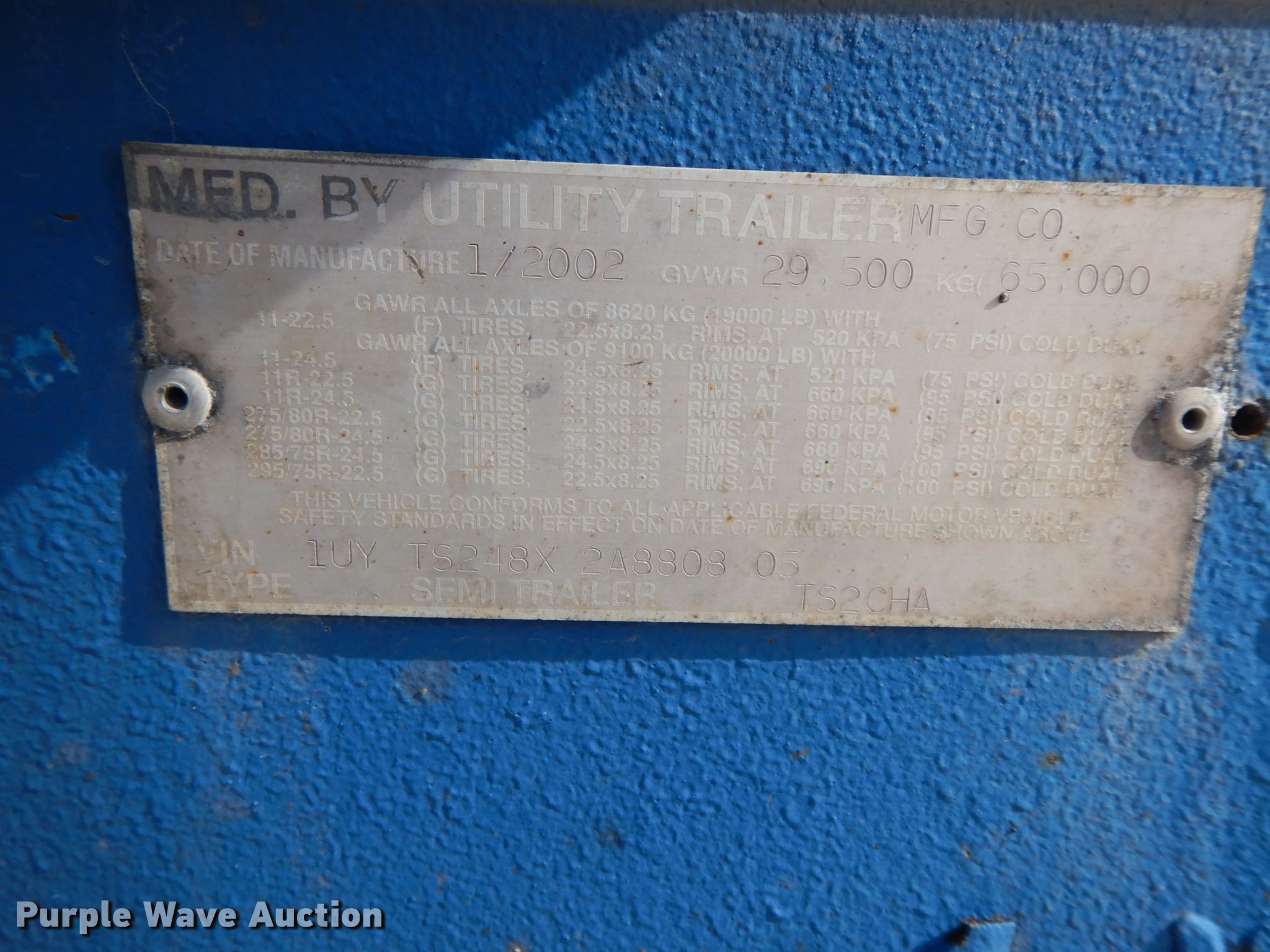 2002 Utility side curtain trailer. Unit #: 046. Dimensions Overall: 44' x 102" W. Operational Deck type: Wood. Chassis Landing gear: Dual, Two speed, Suspension: Spring, Brakes: Air, Axles: Tandem, GVWR: 65,000 lbs. Tires Steel wheels, Size: 295/75R22.5. Missouri title. 1UYTS248X2A880805. Mid-Am Building Supply Inc.. 1615 Omar Bradley Dr. Moberly, MO 65270