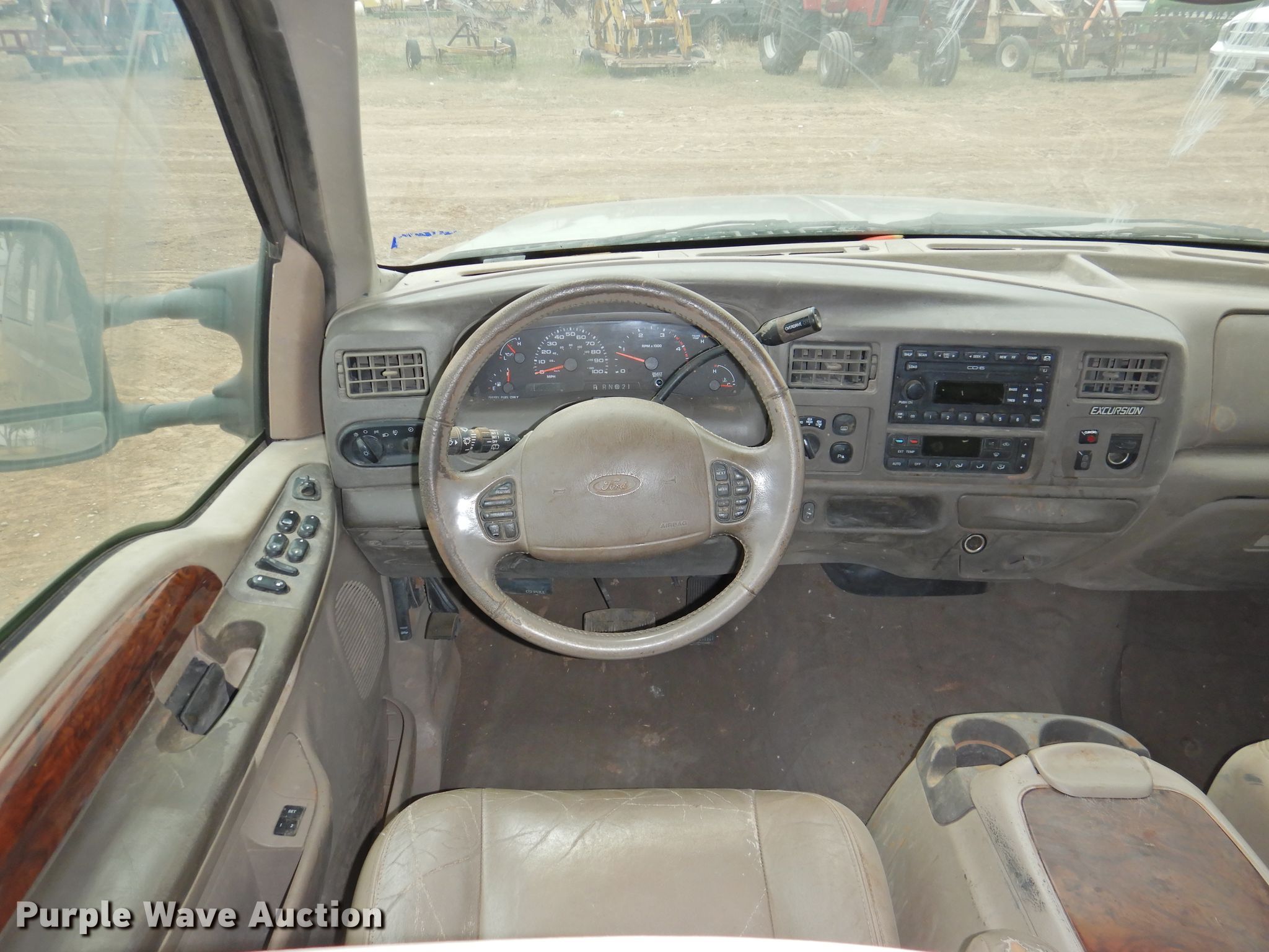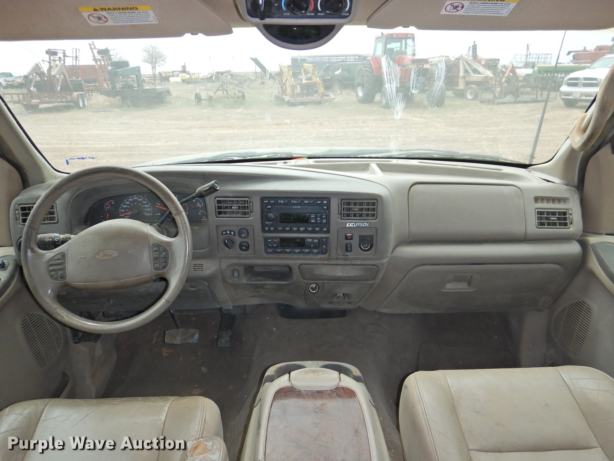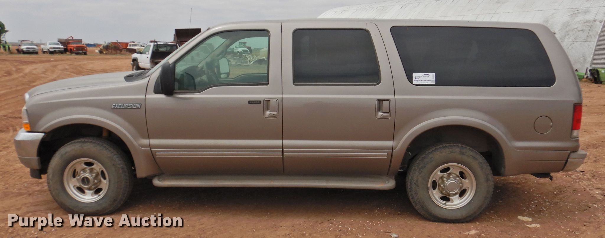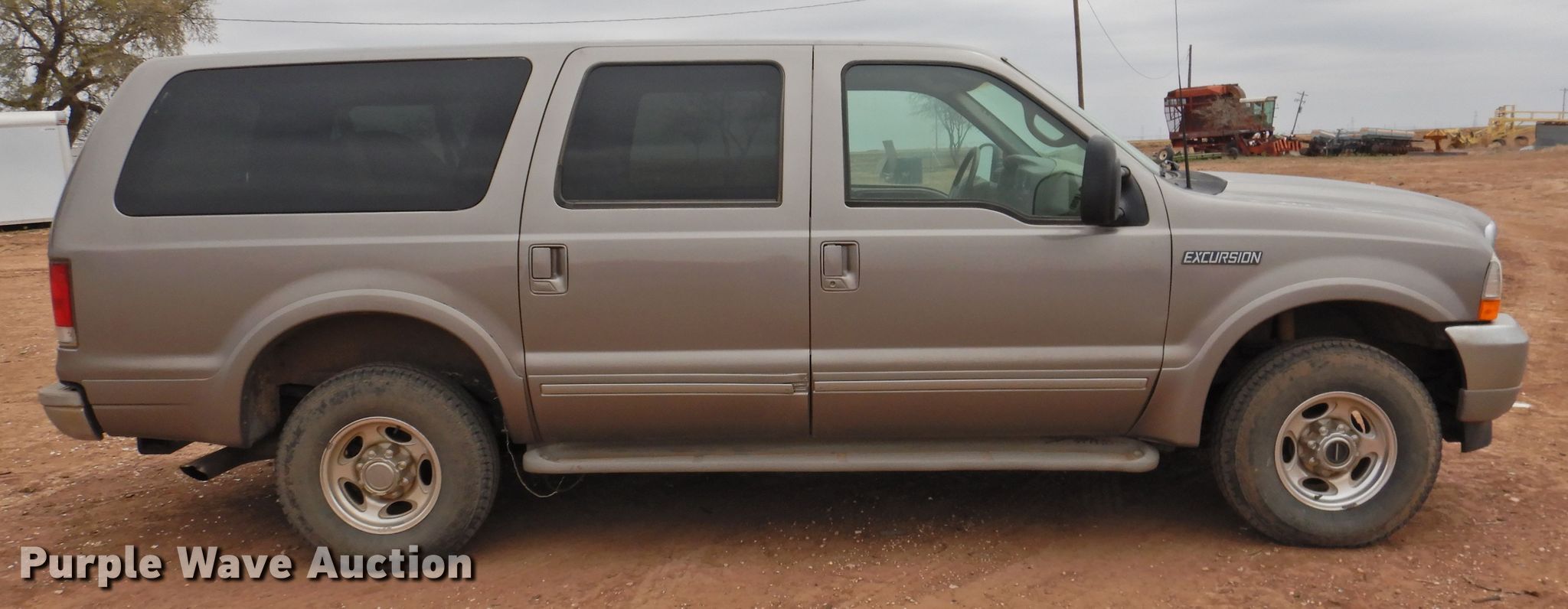 2002 Ford Excursion SUV. 196,304 miles on odometer. Engine Displacement: 7.3L V8 OHV 16V, Cylinders: 8, Fuel type: Diesel. Transmission Automatic, Four wheel drive. Interior AC, Heat, Seat: Heated, Power driver, Power passenger, Power windows, Power locks, Cruise control. Tires Size: 235/85R16. Texas rebuilt salvage title. Title distribution may be delayed up to 30 days from verification of funds. 1FMSU43F62EB88111. Dutton Farms. 1499 County Rd 2. Tulia, TX 79088