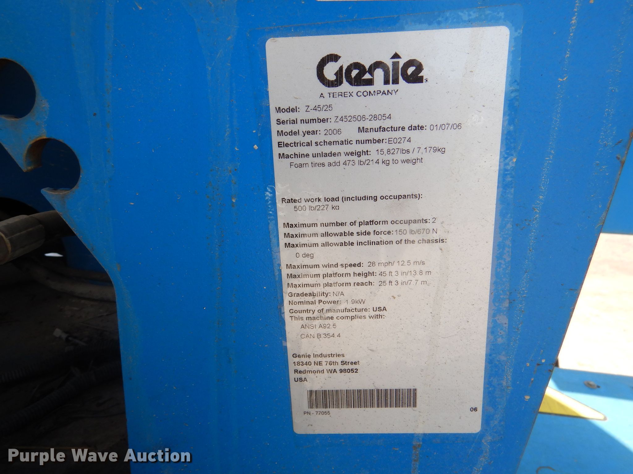 2006 Genie Z45/25J boom lift. 559 hours on meter, Serial: Z452506-28054. Electric Motor GE 5BCG52HA100 Serial: 006223, Volts: 48. Operational Maximum lift capacity: 500 lbs, Maximum reach length: 25' 3", Maximum lift height: 45' 3", Platform: 69" L x 27" W, AC power outlet, Controls: Platform, Ground, Platform rotation: Hydraulic. Tires Tire size: 9-14.5, Solid. Piping Contractors of Kansas Inc... 4141 NW 25th St. Topeka, KS 66618