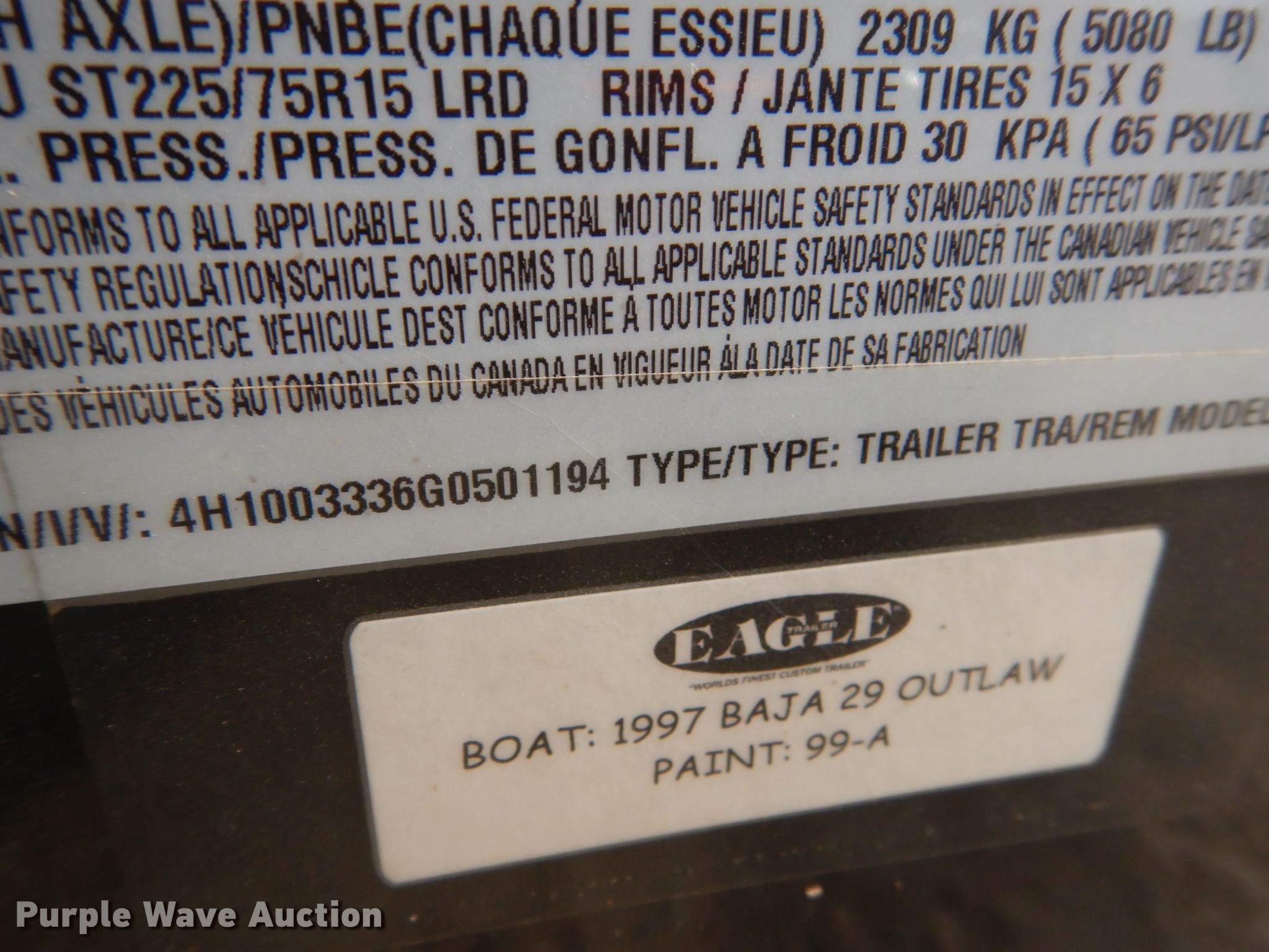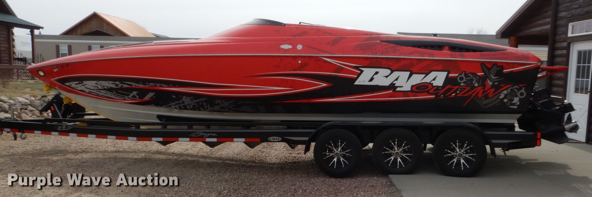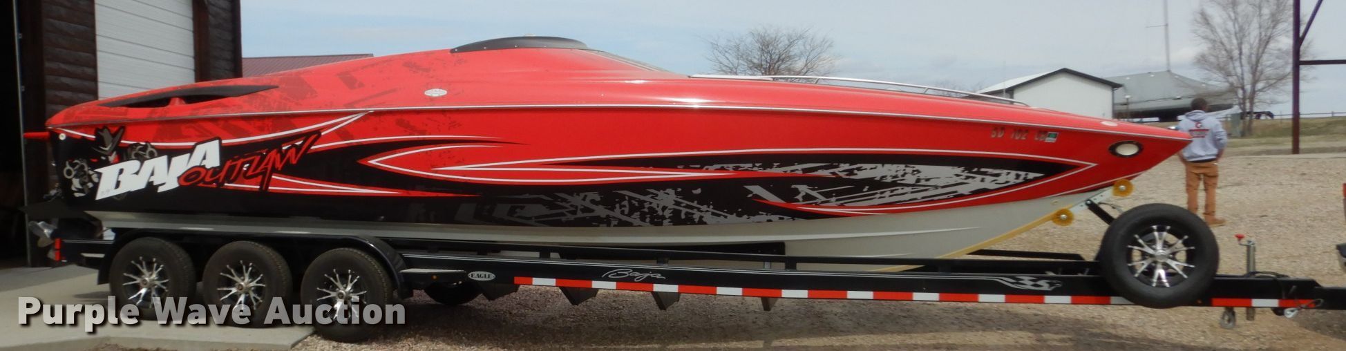 1997 Baja Outlaw boat. 347 hours on meter, Length: 29', Hull ID: AGC56055C797. Engine Engine type: Inboard, Mercury MCM 454 Magnum MPI, Cylinders: 8, Fuel type: Gas, Outdrive Make: MerCruiser, Model: Bravo One, Serial: OK220775, Propellor: Stainless steel. Second engine Engine type: Inboard, Mercury MCM 454 Magnum MPI, Cylinders: 8, Gas , Outdrive Make: MerCruiser, Model: Bravo One, Serial: OK220170, Propeller: Stainless steel. Operational Cuddy cabin. Trailer HLT Limited Eagle, Overall length: 36', Triple axle, GVWR: 15,240 lbs, Tire size: 225/75R15. South Dakota title. 4H1003336G0501194. Groeneweg Construction. 525 N Main Ave. Parker, SD 57053
