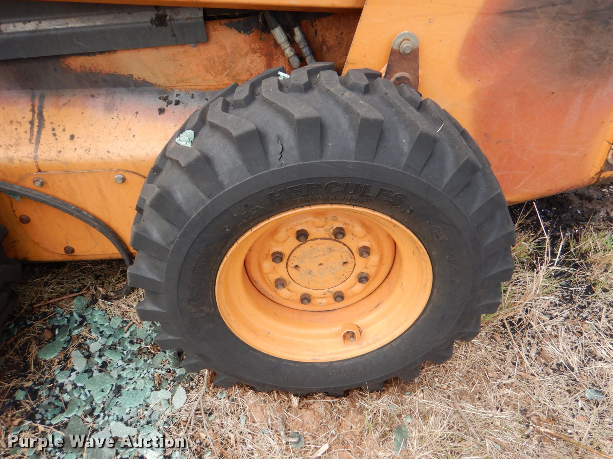 2005 Case 85XT skid steer loader. Serial: JAF411403, Claim #: 2021803959. Engine Cylinders: 4, Fuel type: Diesel. Transmission Hydrostatic. Operators station OROPS, Bucket control: Hand. Operational Auxiliary hydraulics, Quick coupler: Manual, Bucket Width: 80", Cutting edge: Bolt-on. Tires Size: 12-16.5 NHS. Notes Fire damage, Non-operational unit. Oklahoma Farm Bureau Insurance. Roosevelt, OK 73564