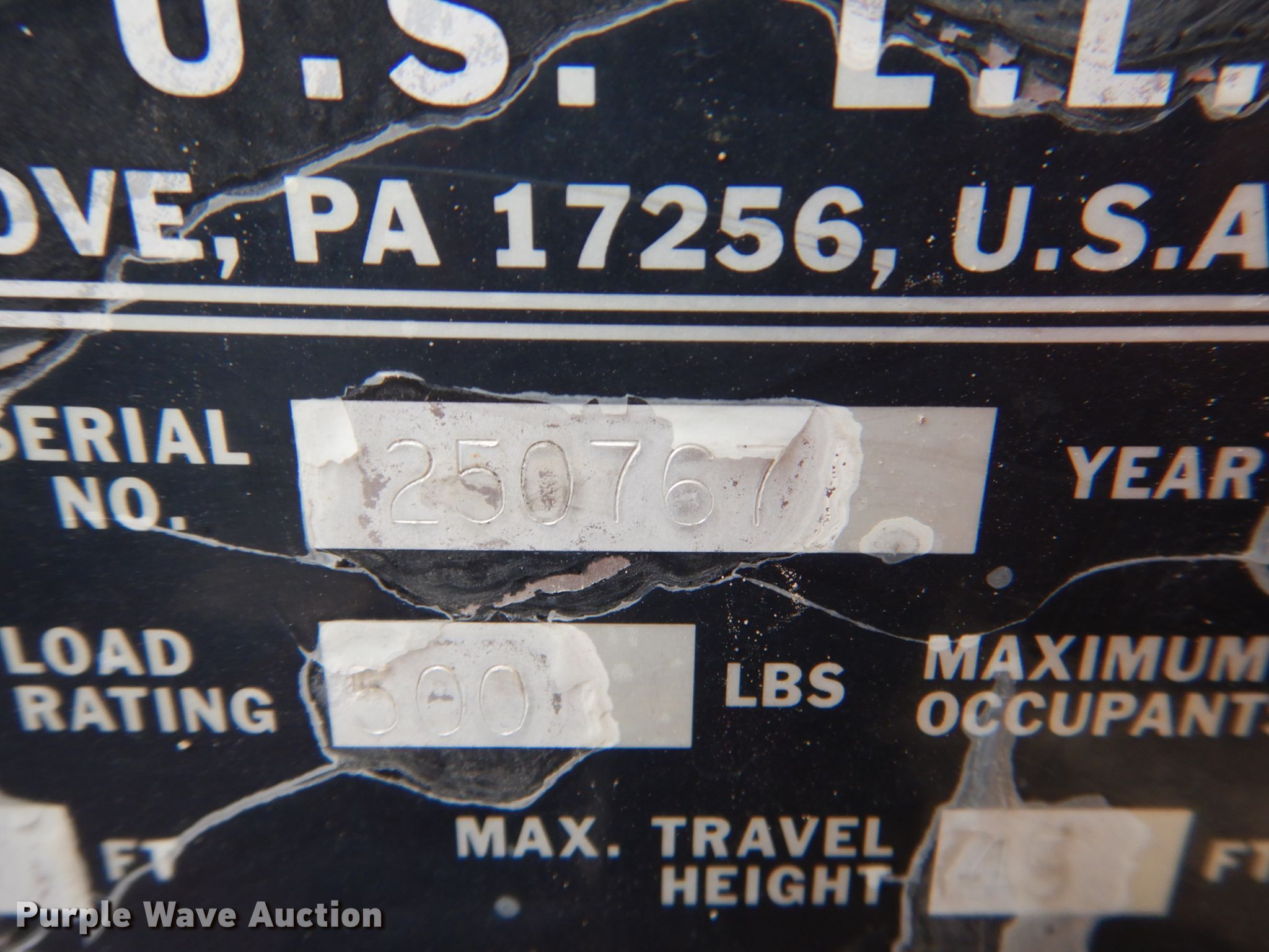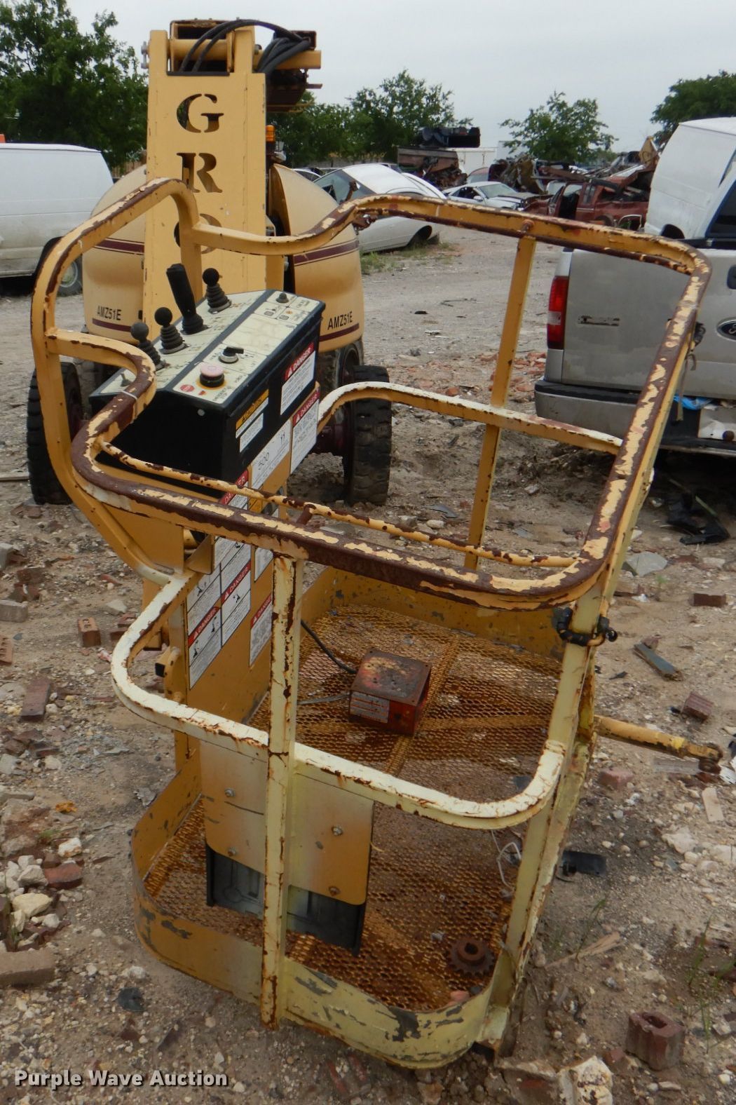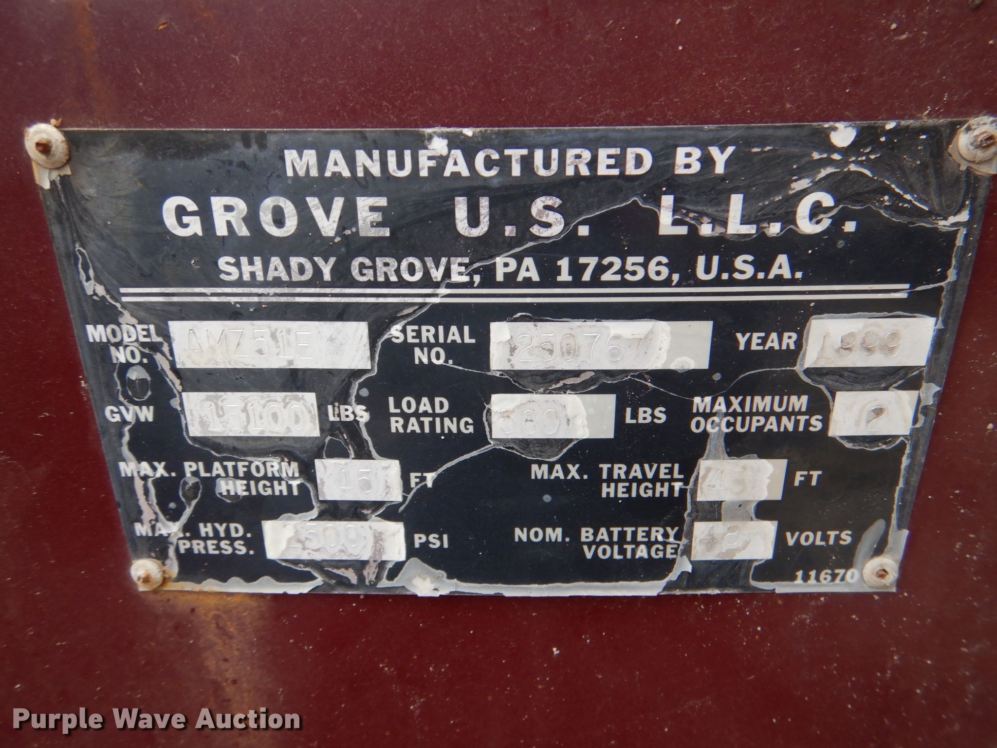 1999 Grove AMZ51E boom lift. 366 hours on meter, Serial: 250767. Electric Motor Lester Electrical 19110. Operational Maximum lift capacity: 500 lbs, Maximum lift height: 45', Platform: 45" L x 28" W, AC power outlet, Controls: Platform, Ground. Tires Tire size: 7.00-15, Solid. Notes Non-operational unit. Salvage Auto Parts Solutions LLC. 2866 S US Highway 77. Waxahachie, TX 75165