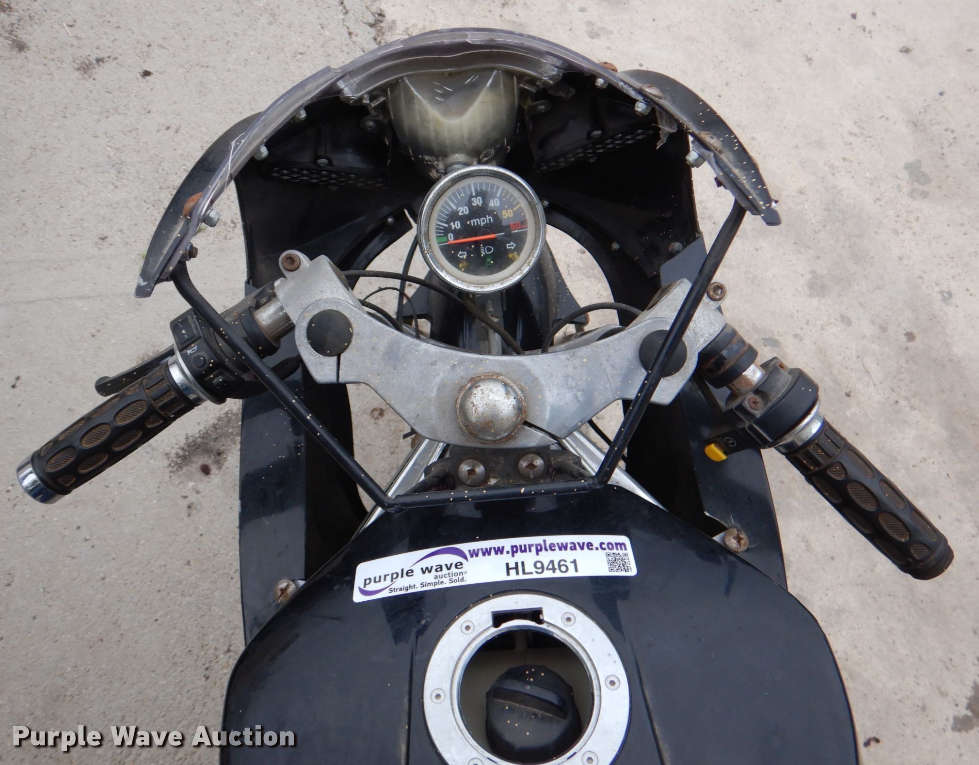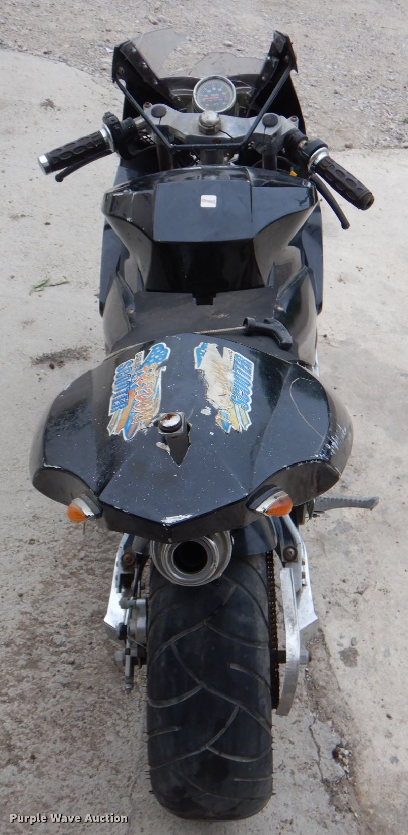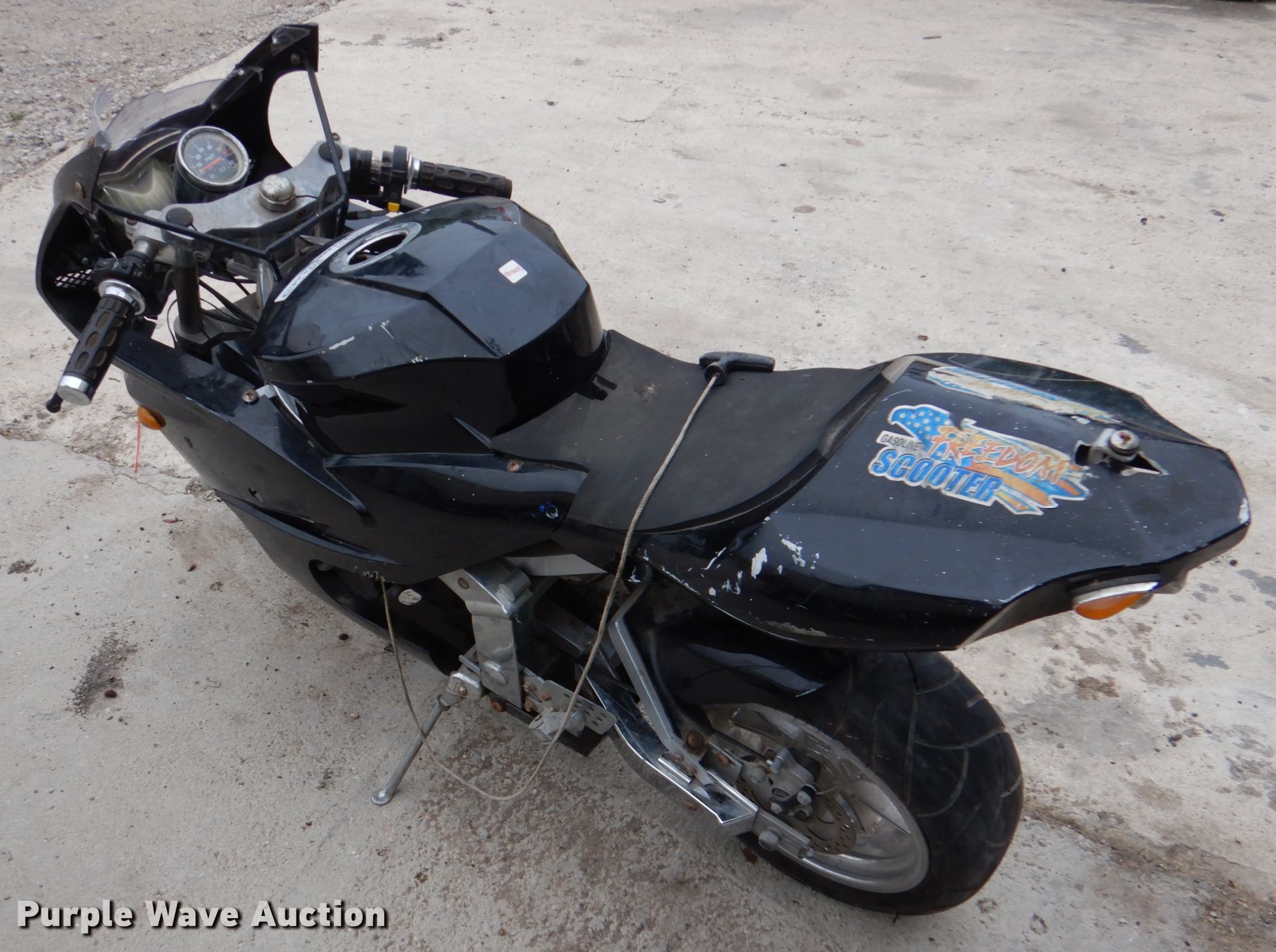Purple Wave is selling a used Sporting Goods in Texas. This item is a Freedom pocket bike with the following: Gas engine, 145/50-10 tires, Pull start cord broken, Windshield broken, Non-operational unit