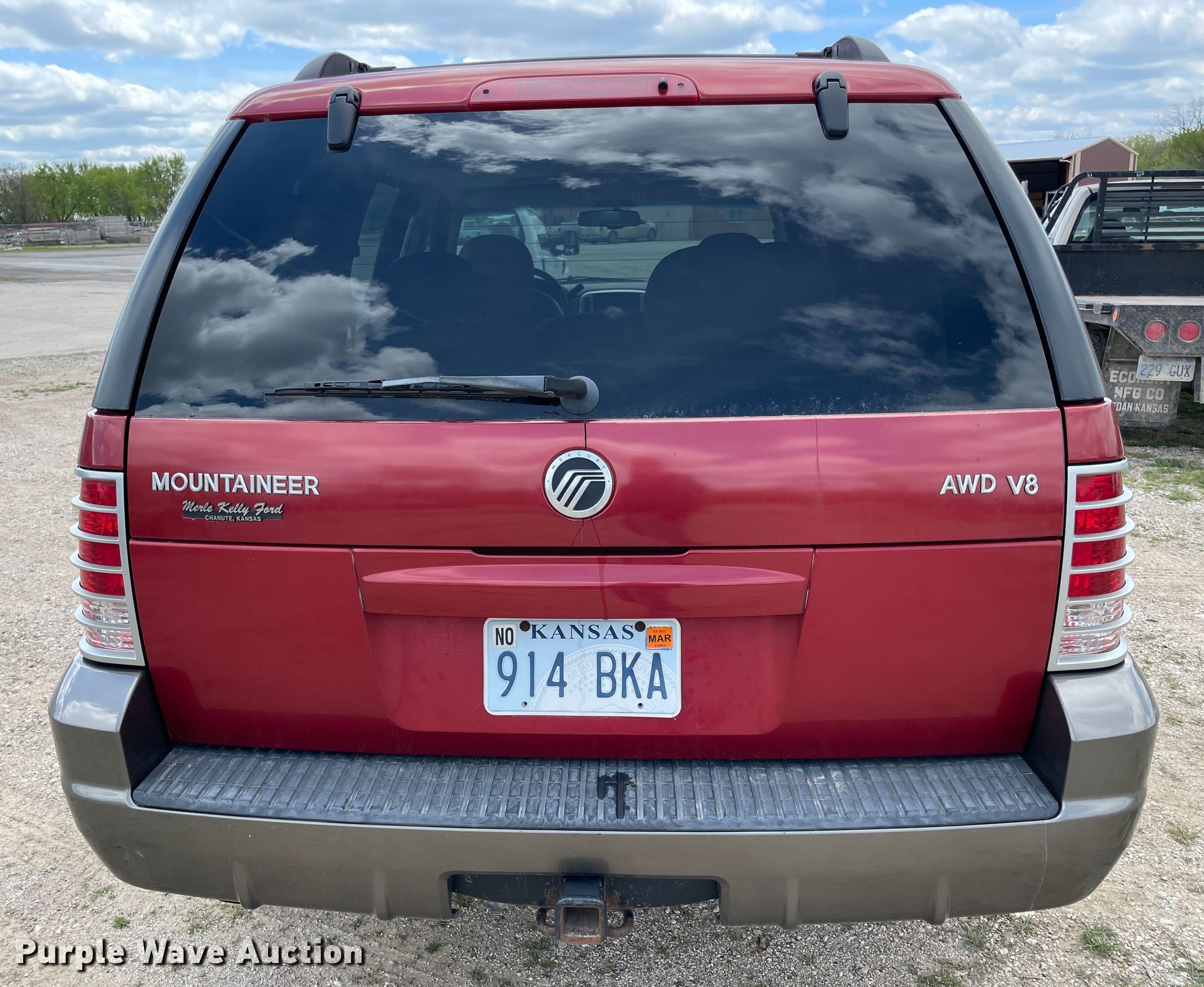 2002 Mercury Mountaineer SUV. 164,902 miles on odometer. Engine Displacement: 4.6L V8 SOHC 12V , Cylinders: 8, Fuel type: Gas. Transmission Automatic, All wheel drive. Interior AC, Heat, Seat: Power driver, Power windows, Power locks, Cruise control, Powered sunroof. Tires Size: P245/70R16SL. Kansas title. 4M2ZU86W12UJ32177. Beachner Bros.. 616 7th St. Saint Paul, KS 66771