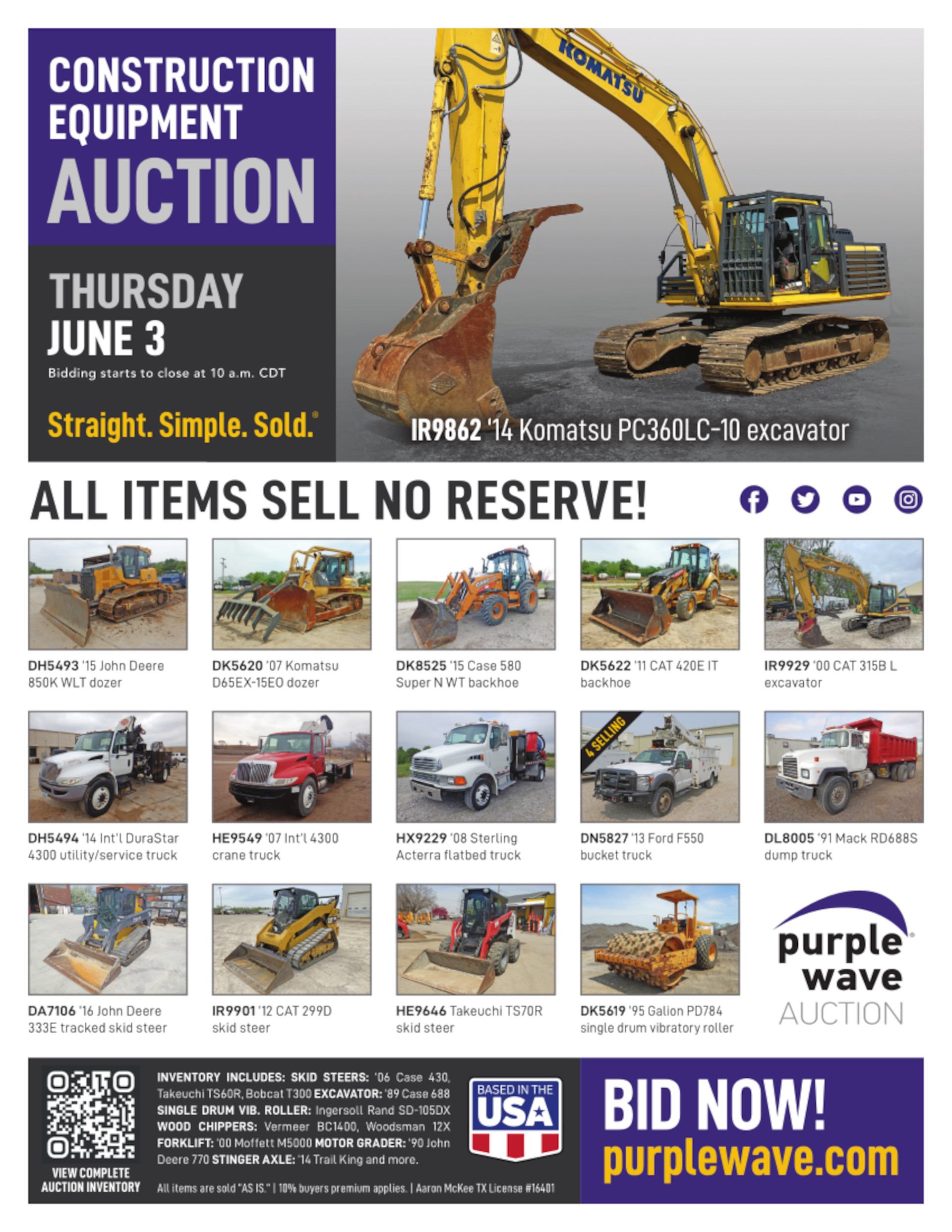 This auction is conducted by Purple Wave, Inc., whose home office is 825 Levee Drive, Manhattan, Kansas. Aaron McKee, Texas auctioneer license # 16401, operates Purple Wave, Inc. Complaints against us may be directed to the Texas Department of Licensing and Regulation, P.O. Box 12157, Austin, Texas 78711, (512) 463-6599. For additional required information, see the attached document.