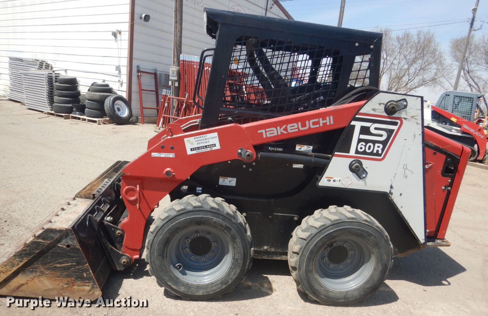 Takeuchi TS60R skid steer loader. 664 hours on meter, Serial: T3R06000471. Engine Cylinders: 4, Fuel type: Diesel. Transmission Hydrostatic. Operators station OROPS, Bucket control: Hand. Operational Auxiliary hydraulics, Quick coupler: Hydraulic, Bucket Width: 69", Cutting edge: Bolt-on. Tires Size: 265/70D16.5. Midwest Construction Rentals, Inc.. 2100 4th St. Sioux City, IA 51101