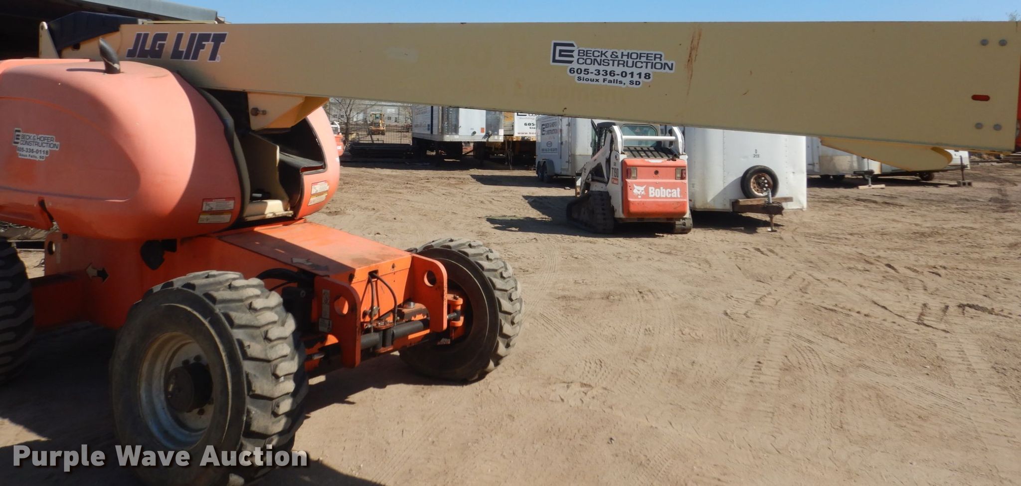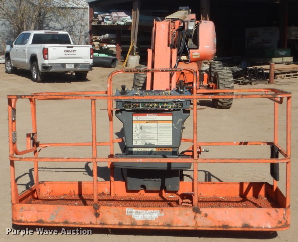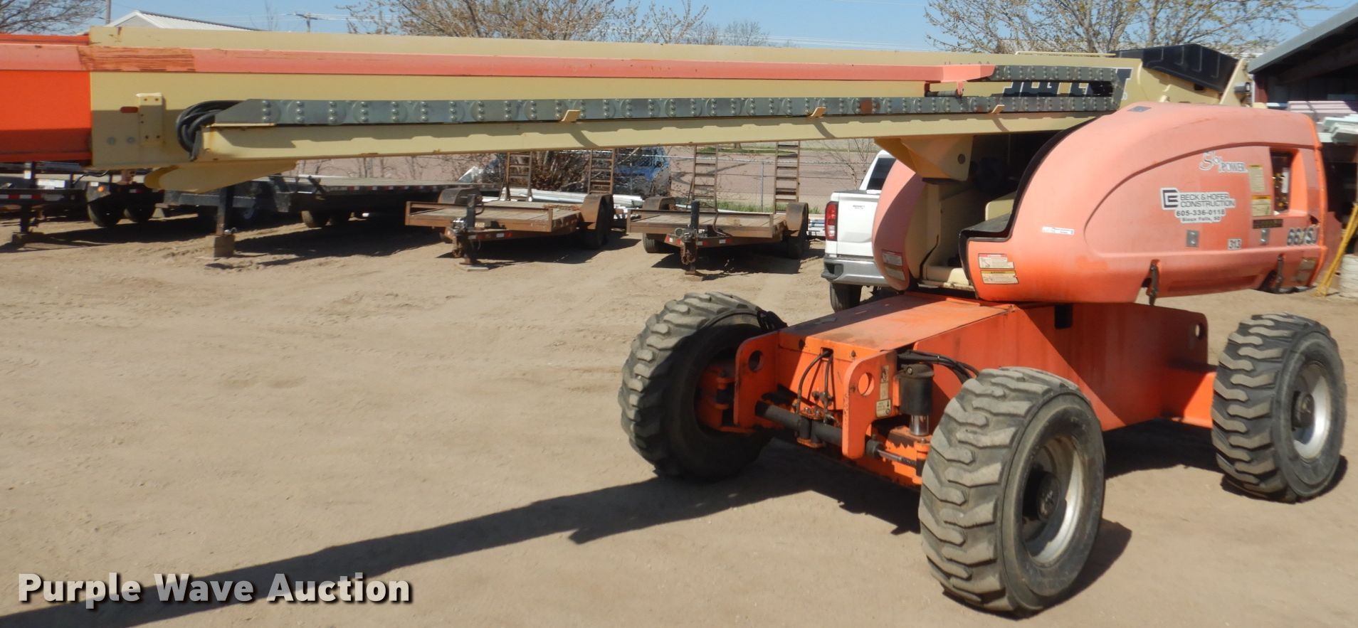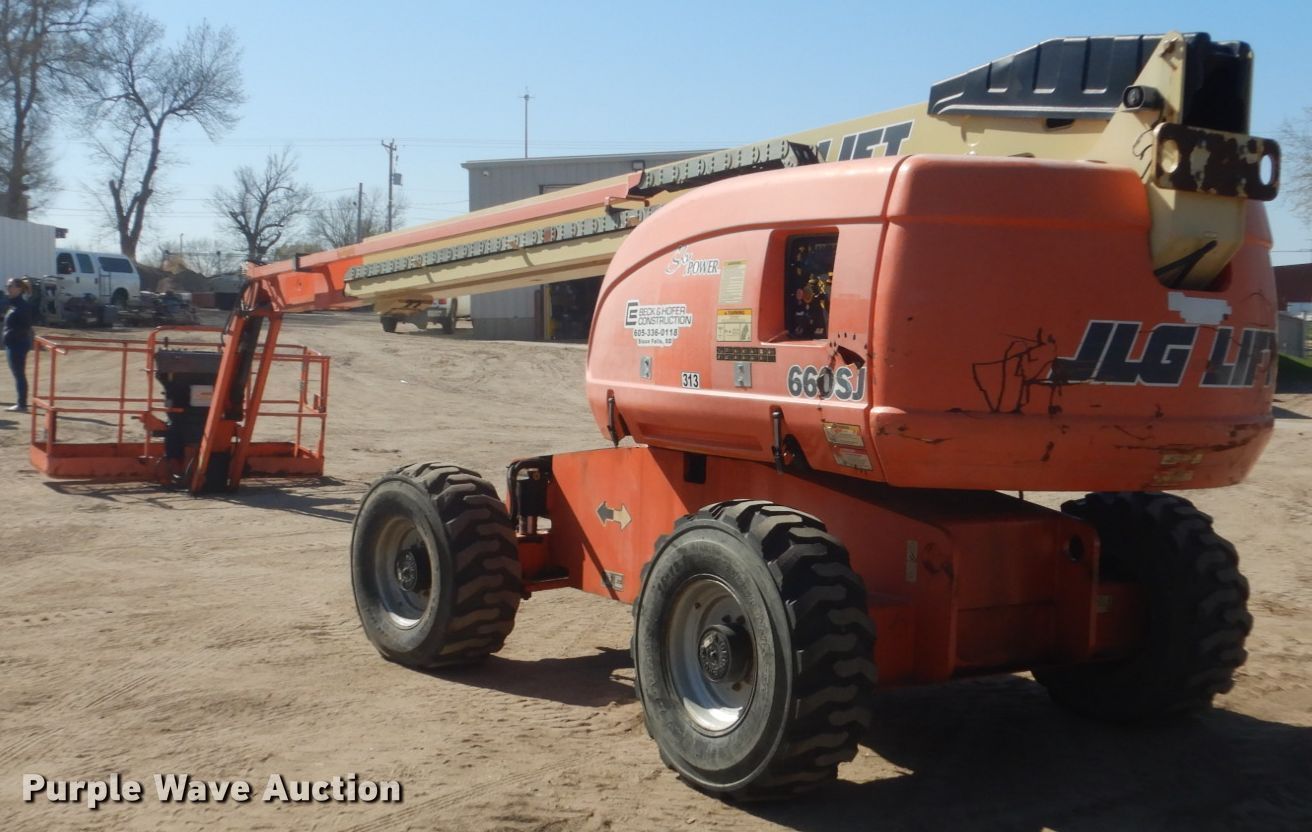 2008 JLG 660SJ boom lift. 8,459 hours on meter, Serial: 0300121460. Engine Cylinders: 4, Fuel type: Diesel. Chassis All wheel drive. Operational Rough terrain, Hydraulic leveling, Platform: 96" L x 35" W, AC power outlet, Air outlet, Controls: Platform, Ground, Platform rotation: Hydraulic, Safety alarm. Tires Tire size: 15-19.5. Notes Hydraulic leaks. Beck & Hofer Construction. 618 E Maple St. Sioux Falls, SD 57104