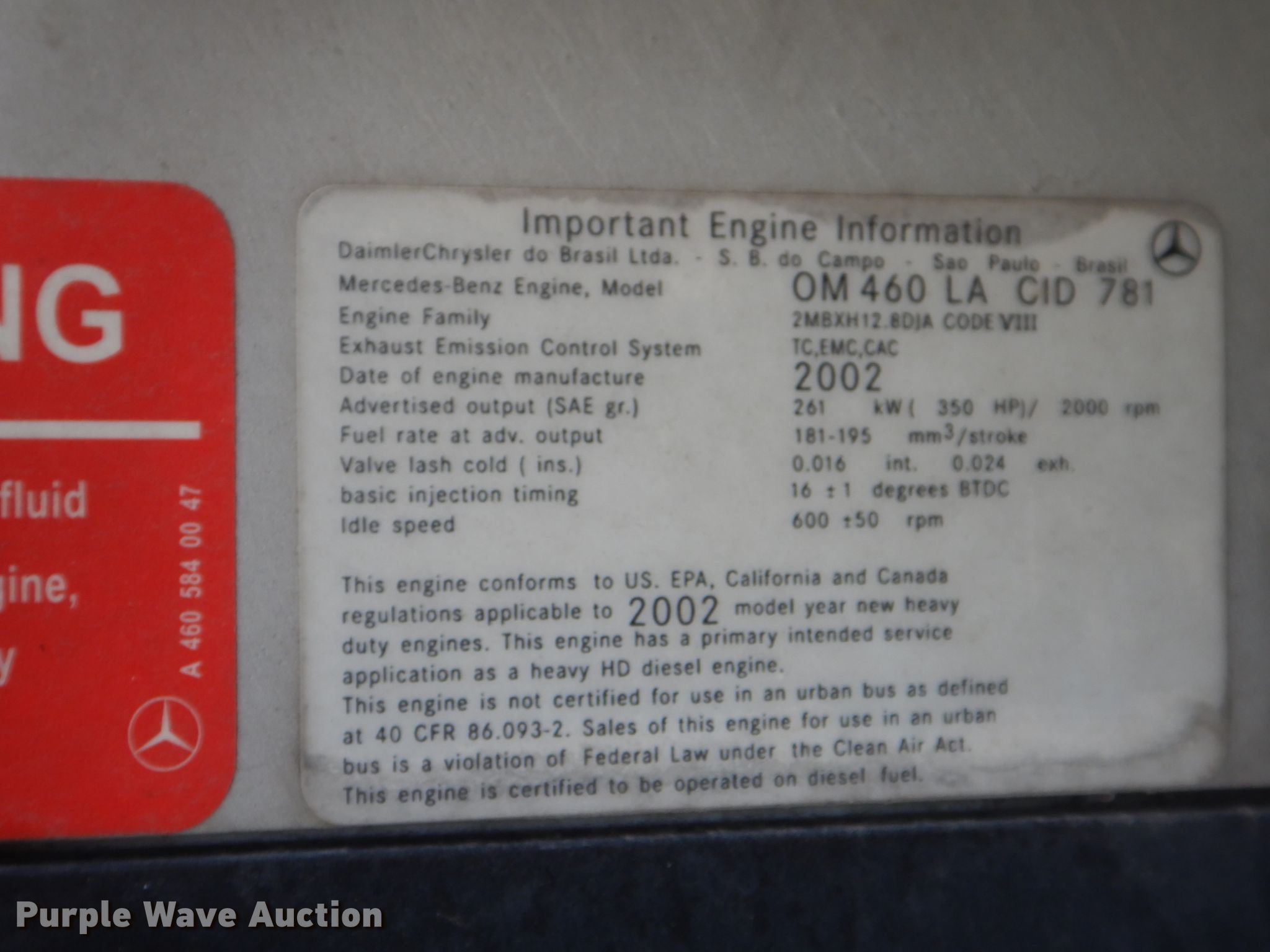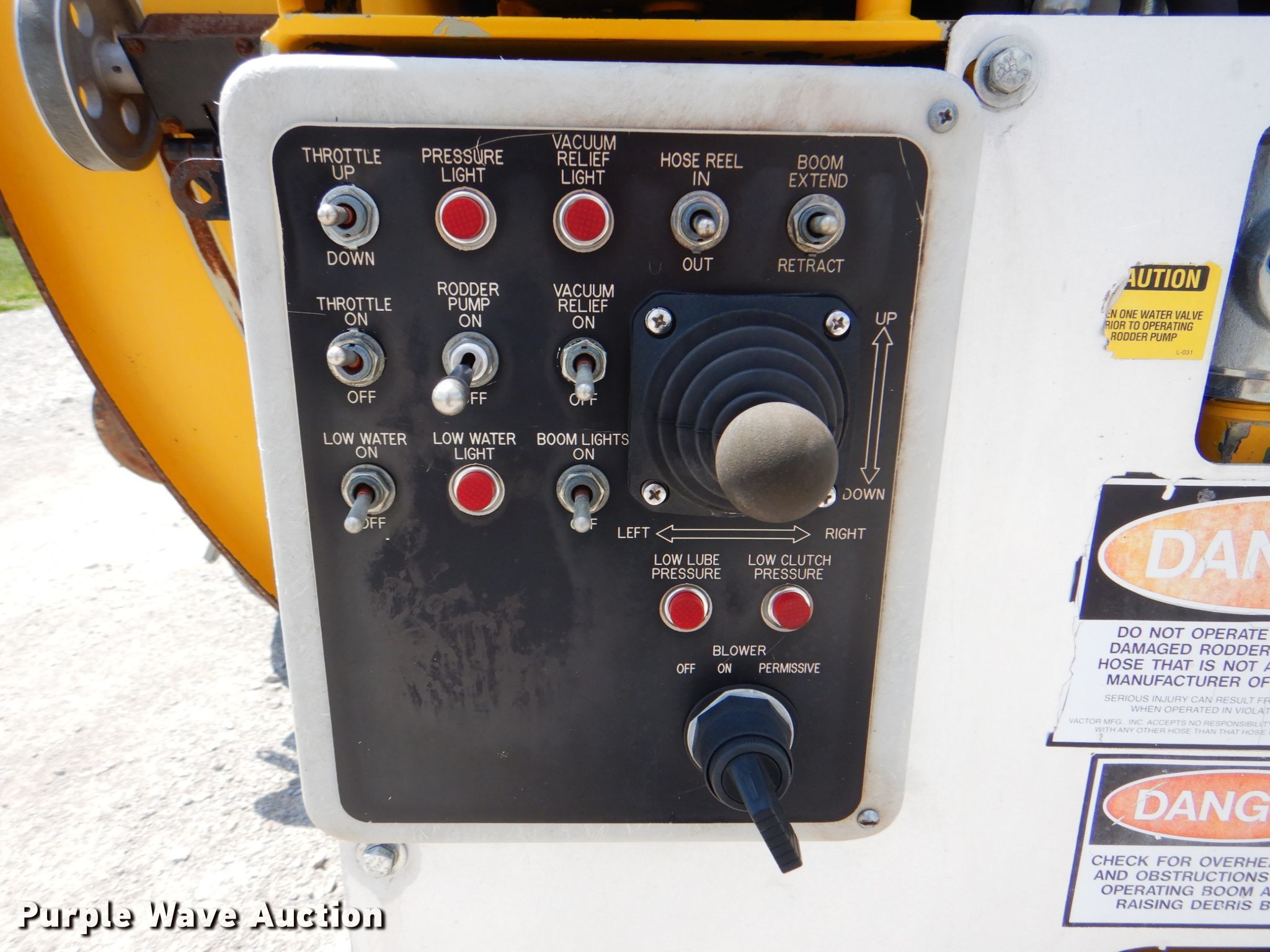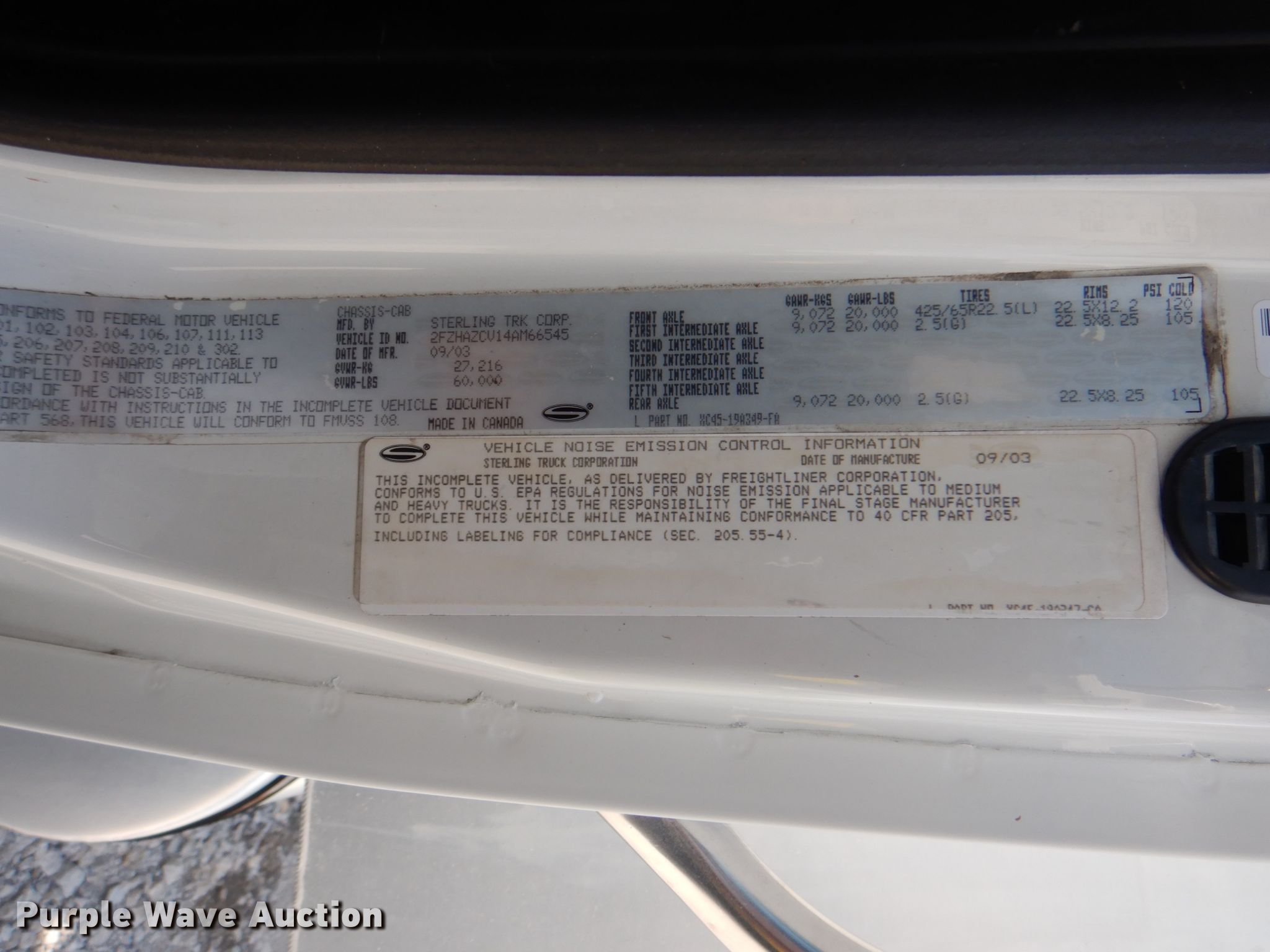 2004 Sterling L-Line vacuum truck. 32,509 miles on odometer, Engine hours: 5,468, Vacuum truck. Engine Mercedes Benz MBE 4000, Displacement: 12.8L, Cylinders: 6, Fuel type: Diesel. Transmission Eaton Fuller Road Ranger, Manual, Speed: 10. Chassis Axles: Tandem, Suspension: Walking beam, Brakes: Air, PTO, GVWR: 60,000 lbs. Interior AC, Heat, Cruise control. Operational Tank bed Vactor Mfg. Inc. 2112-824-18, Serial: 03-10V-8942, Capacity: 1,500 gallons, Top hatches: 1, Rear outlet: 7", Engine John Deere PowerTech, Displacement: 6.9L, Cylinders: 6, Fuel type: Diesel, Hose reel Front, Diameter: 48", Telescopic boom Diameter: 10", Length: 5', Remote control. Tires Size: 425/65R22.5, Brand: Goodyear. Notes Windshield chipped or cracked. Oklahoma title. 2FZHAZCV14AM66545. Collinsville, OK 74021