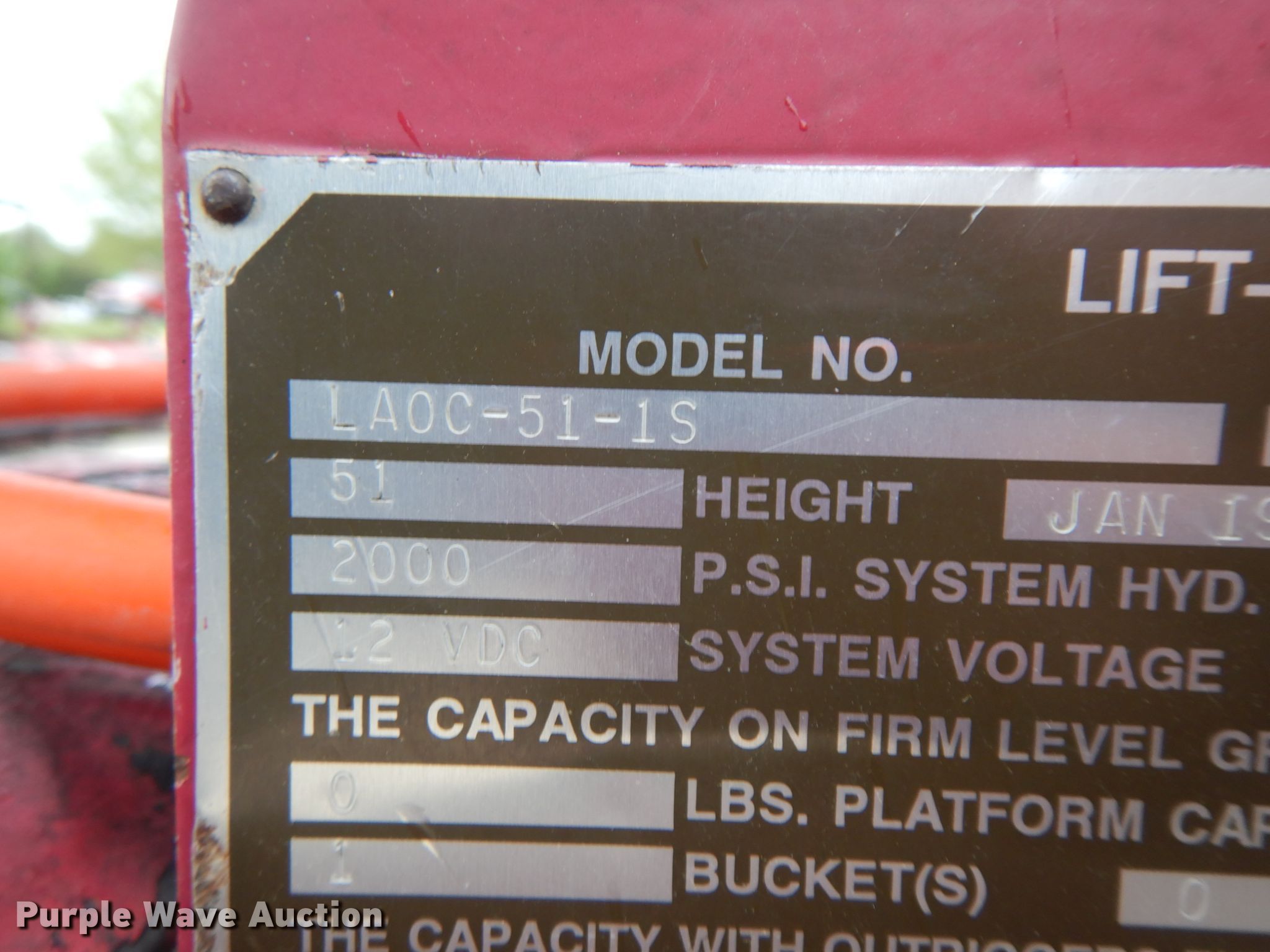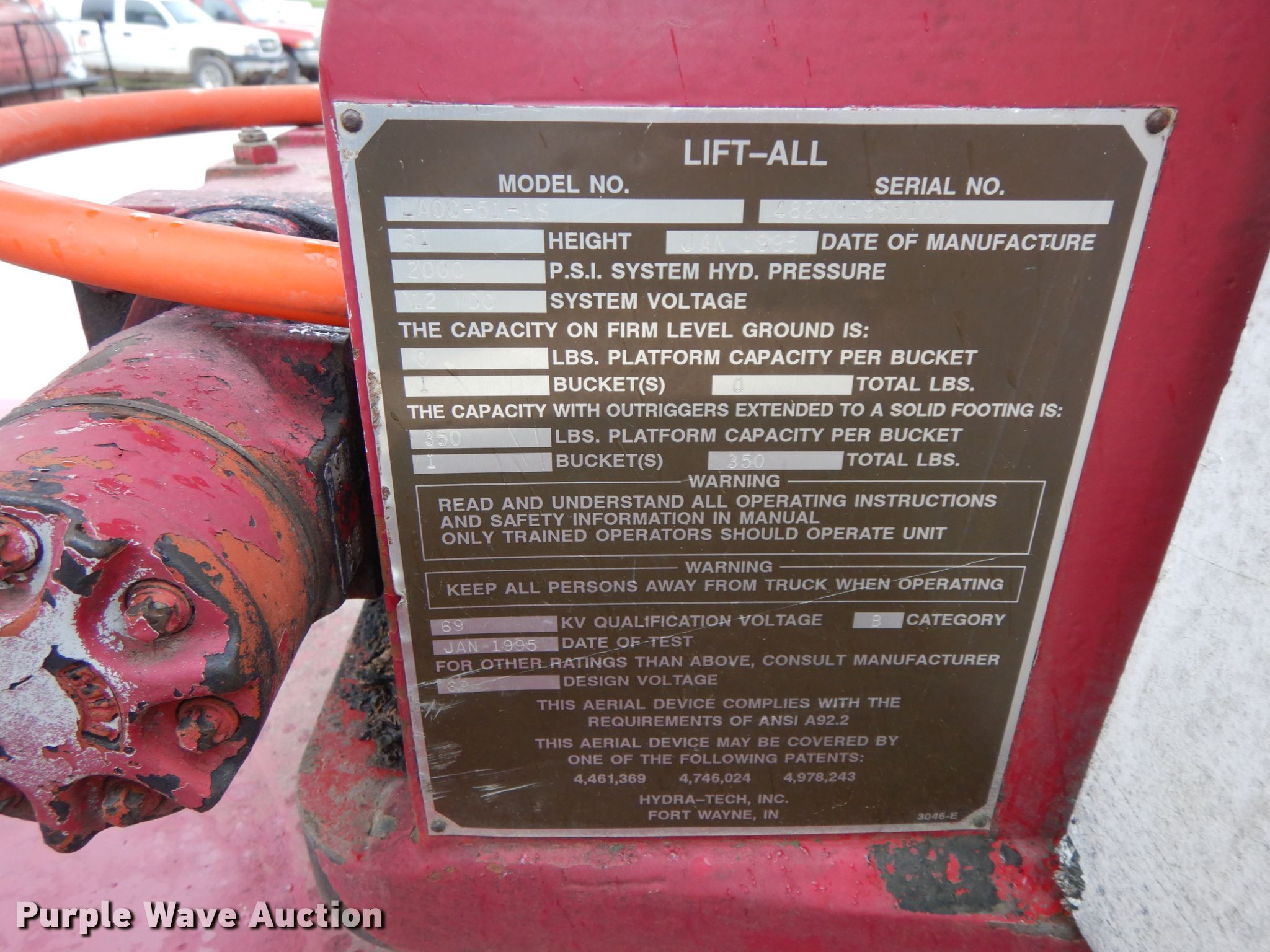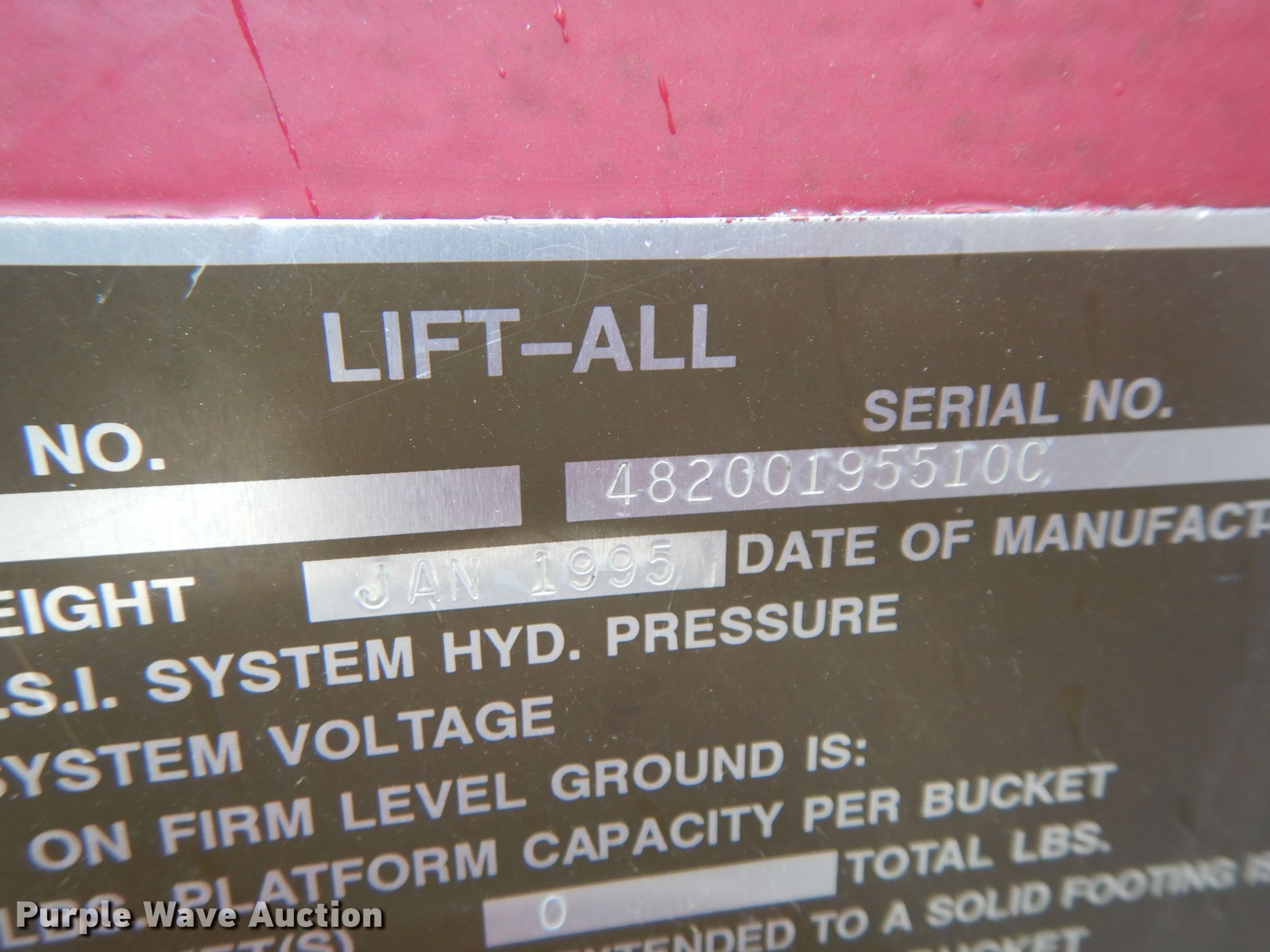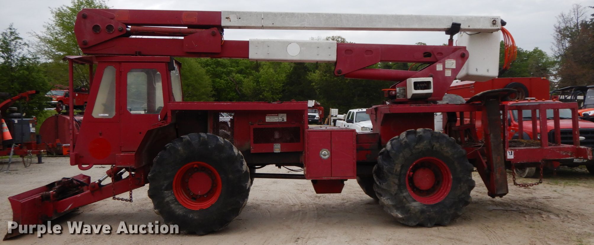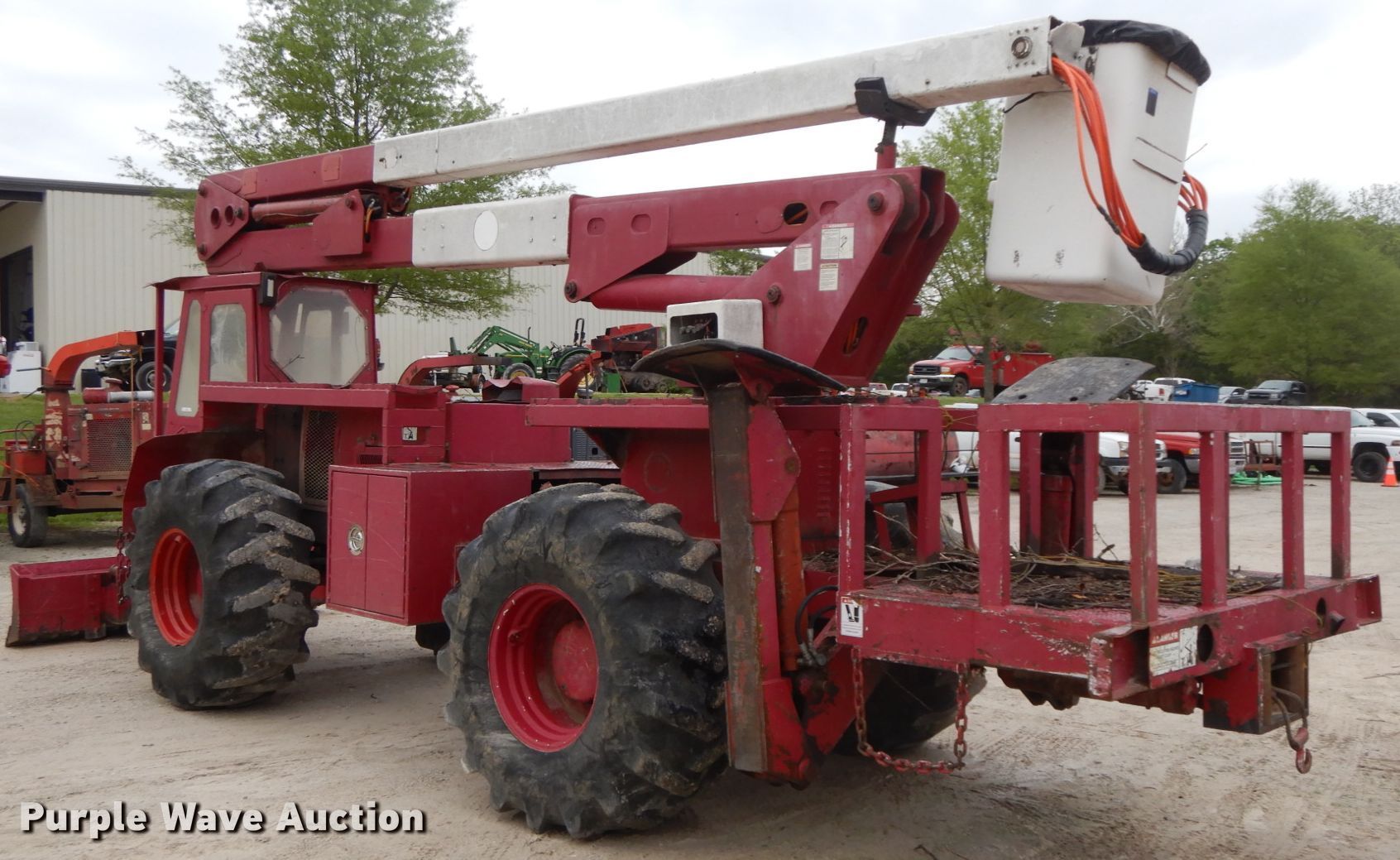 Brown Bear 9116B skidder with bucket. 86 hours on meter, Serial: 9116B-005. Engine Cylinders: 6, Fuel type: Diesel. Transmission Powershift, Speed: 4. Chassis Four wheel drive, Brakes: Hydraulic, PTO. Operational Boom 1995 Lift All LA0C-51-1S, Serial: 48200195510C, Maximum lift capacity: 350 lbs, Maximum lift height: 51', Boom type: Articulating, Insulated, Man basket, Boom controls Ground, Platform/ basket.. Tires Size: 23.1-25. Notes Winch not included, Engine compartment doors will not latch, Transmission issues, Outriggers bleed down. Hentges Tree Service, Inc.. 5905 Old Lohman Rd. Jefferson City, MO 65109