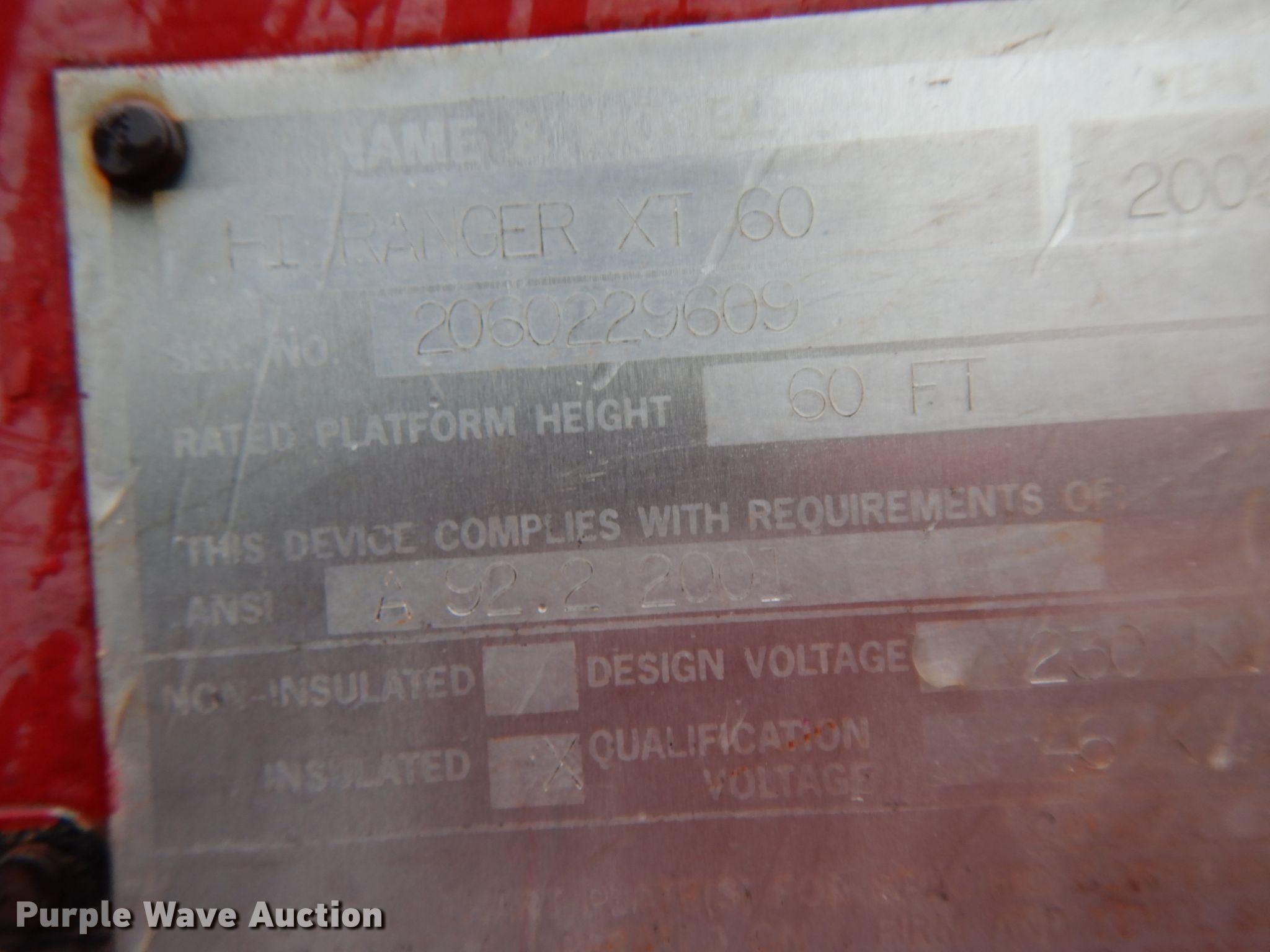 2007 International 4300 forestry bucket truck. 138,486 miles on odometer, Engine hours: 18,653. Engine International DT466, Displacement: 7.6L, Cylinders: 6, Fuel type: Diesel. Transmission Manual, Speed: 6. Chassis Axles: Single, Suspension: Spring, Brakes: Hydraulic, PTO. Interior Heat. Operational Chip bed Length: 12' 6", Ram: Single, Boom Terex Hi ranger xt60, Serial: 2060229609, Maximum lift capacity: 350 lbs, Maximum lift height: 60', Boom type: Articulating, Insulated, Man basket, Boom controls Ground, Platform/ basket.. Tires Front: 10R22.5, Rear: 11R22.5. Notes Dash warning indicator: ABS. Missouri title. 1HTMMAAP87H349977. Hentges Tree Service, Inc.. 5905 Old Lohman Rd. Jefferson City, MO 65109