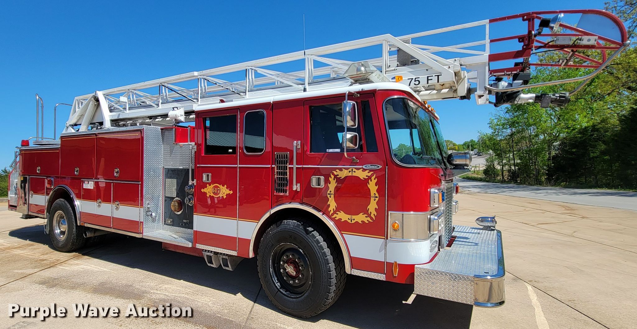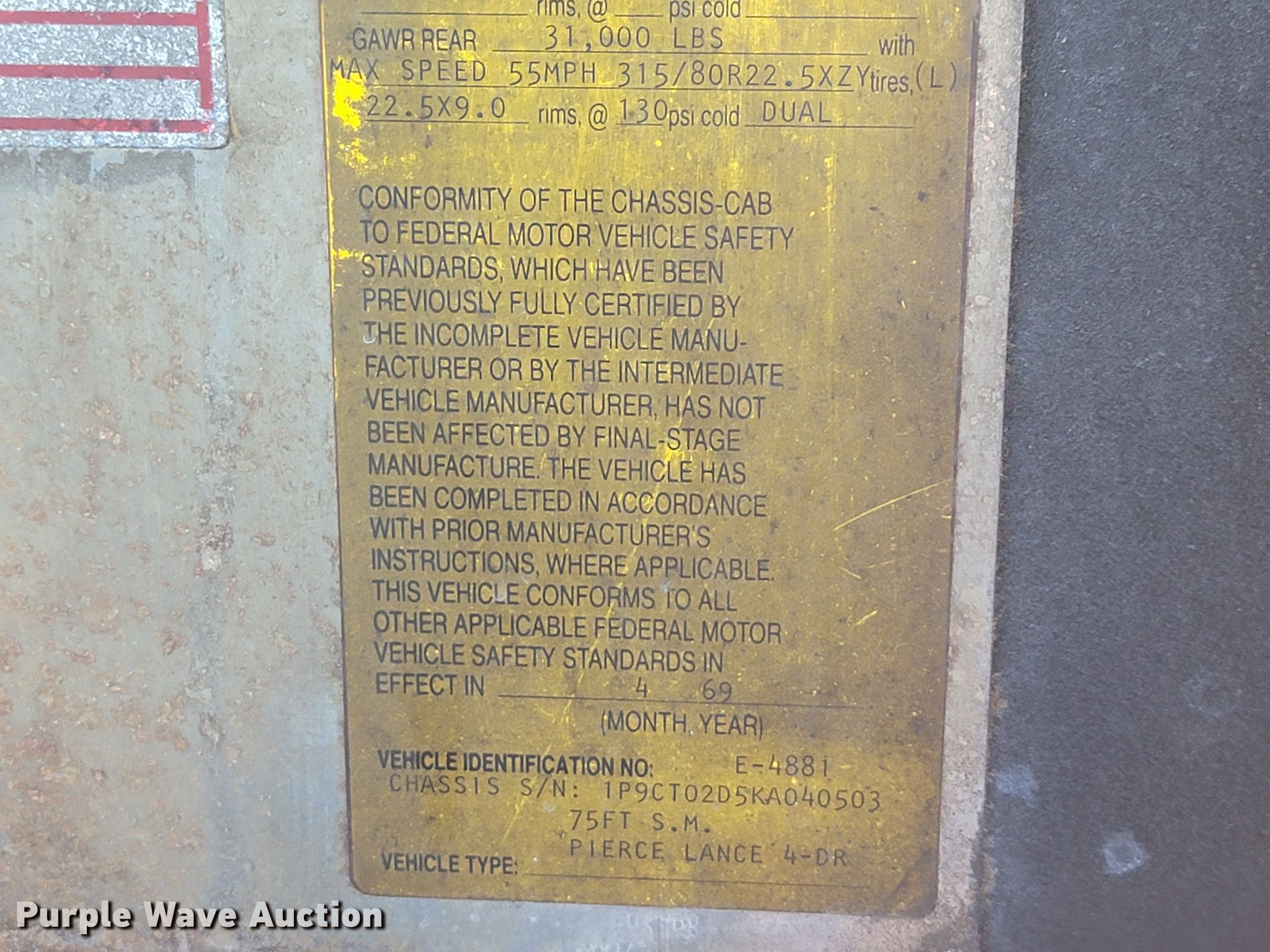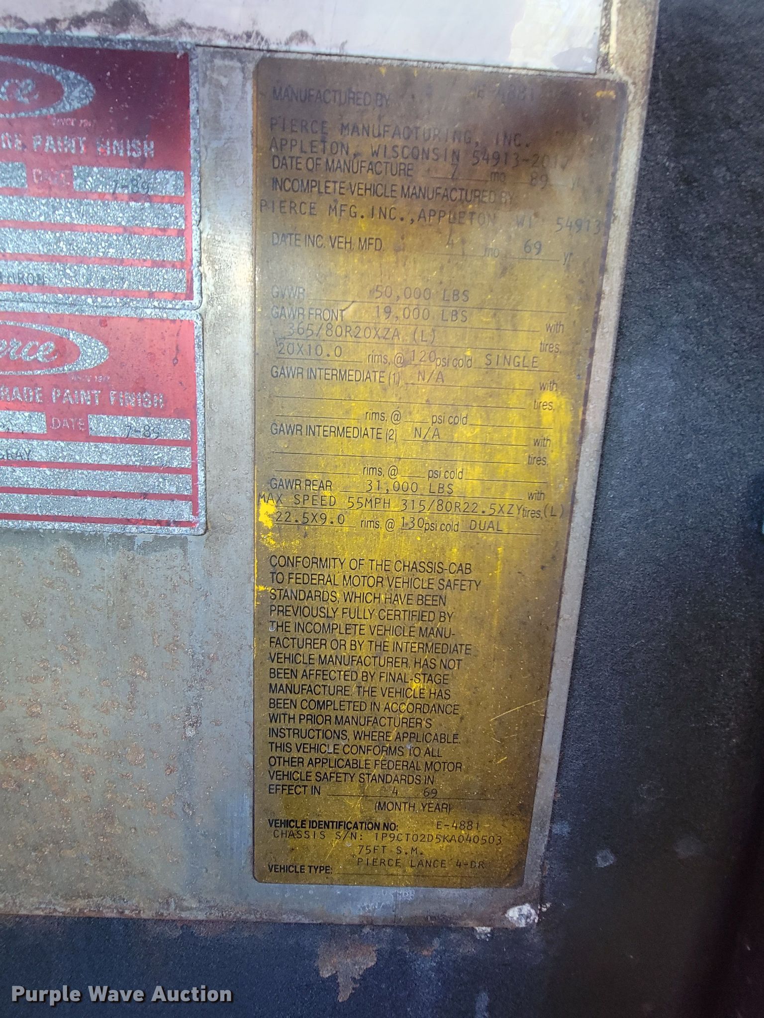 1989 Pierce ladder fire truck. 12,310 miles on odometer. Engine Detroit Diesel 6V92TA, Displacement: 552 C.I.D, Cylinders: 6, Fuel type: Diesel. Transmission Automatic. Chassis Axles: Single, Suspension: Spring, Brakes: Air, GVWR: 50,000 lbs, Wheelbase: 216". Interior Heat. Operational Fire truck Aerial Maximum height: 75', Elevated deck gun, Pump 1,250 gpm.. Tires Front: 385/65R22.5, Rear: 315/80R22.5. Missouri prior salvage title. 1P9CT02D5KA040503. Rocky Mount Fire Prot. Dist.. 20401 Brendel Blvd. Rocky Mount, MO 65072