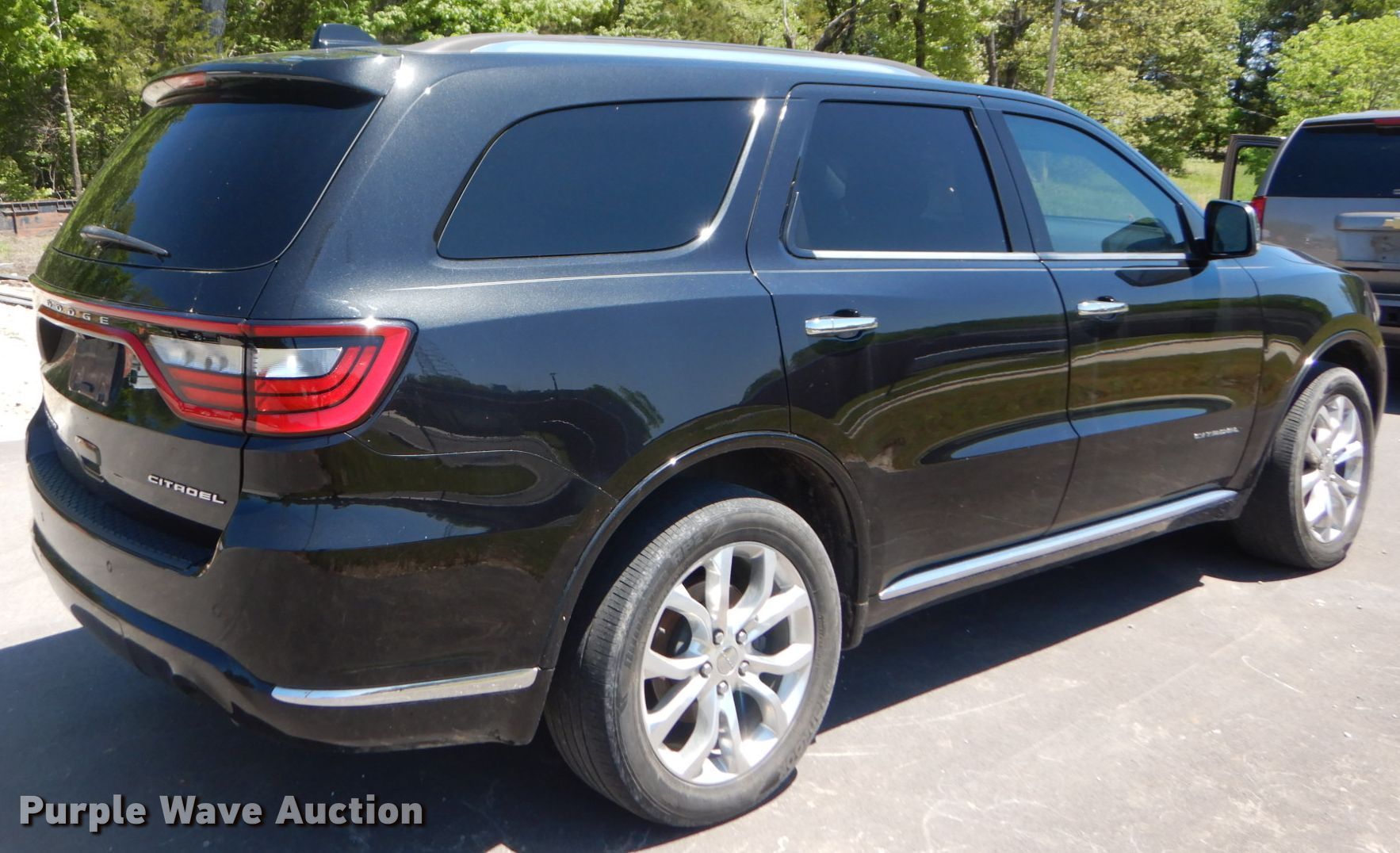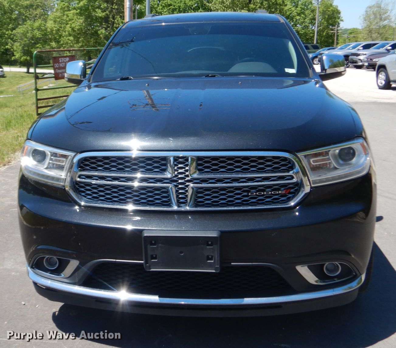 2016 Dodge Durango Citadel SUV. 160,429 miles on odometer. Engine Displacement: 3.6L V6 DOHC 24V, Cylinders: 6, Fuel type: Gas. Transmission Automatic, All wheel drive. Interior AC, Heat, Seat: Power driver, Power passenger, Heated mirrors, Power windows, Power locks, Cruise control, Backup camera, Powered sunroof. Tires Size: 265/50R20. Missouri title. 1C4RDJEG0GC416629. Franklin County Sheriff's Office. 1 Bruns Ln. Union, MO 63084