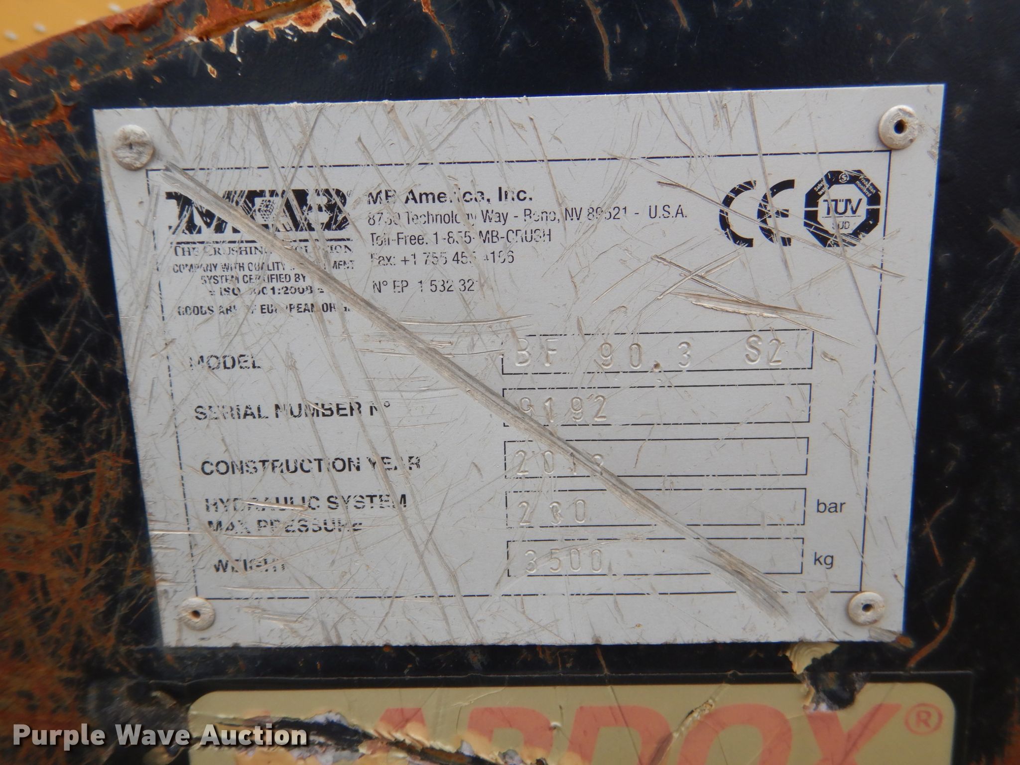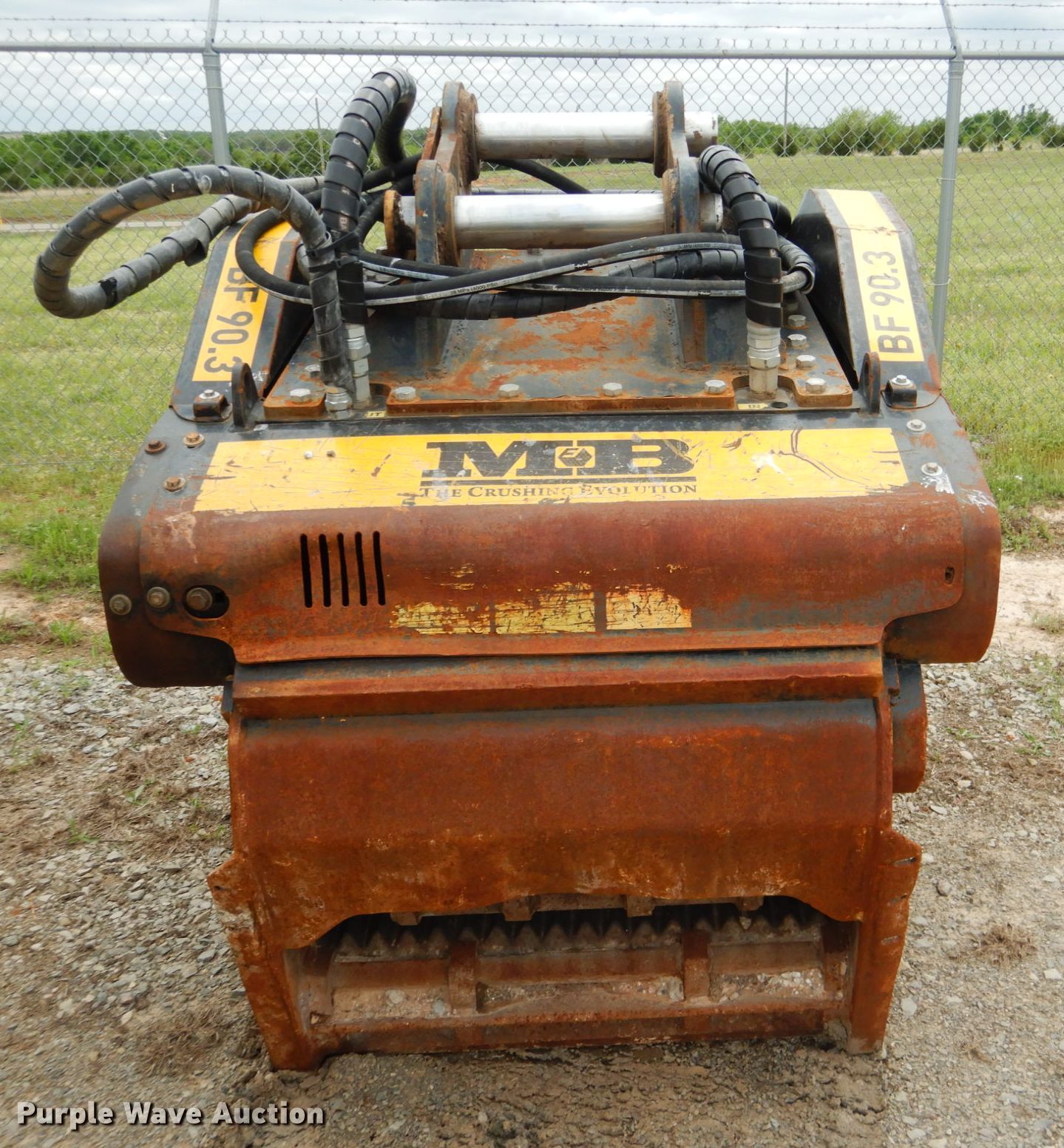 Purple Wave is selling a used Excavator Attach. in Oklahoma. This item is a 2013 MB America BF 90.3 excavator crusher bucket with the following: Load capacity: 1.17 cu.yd., Mouth opening: 36", Serial 9192
