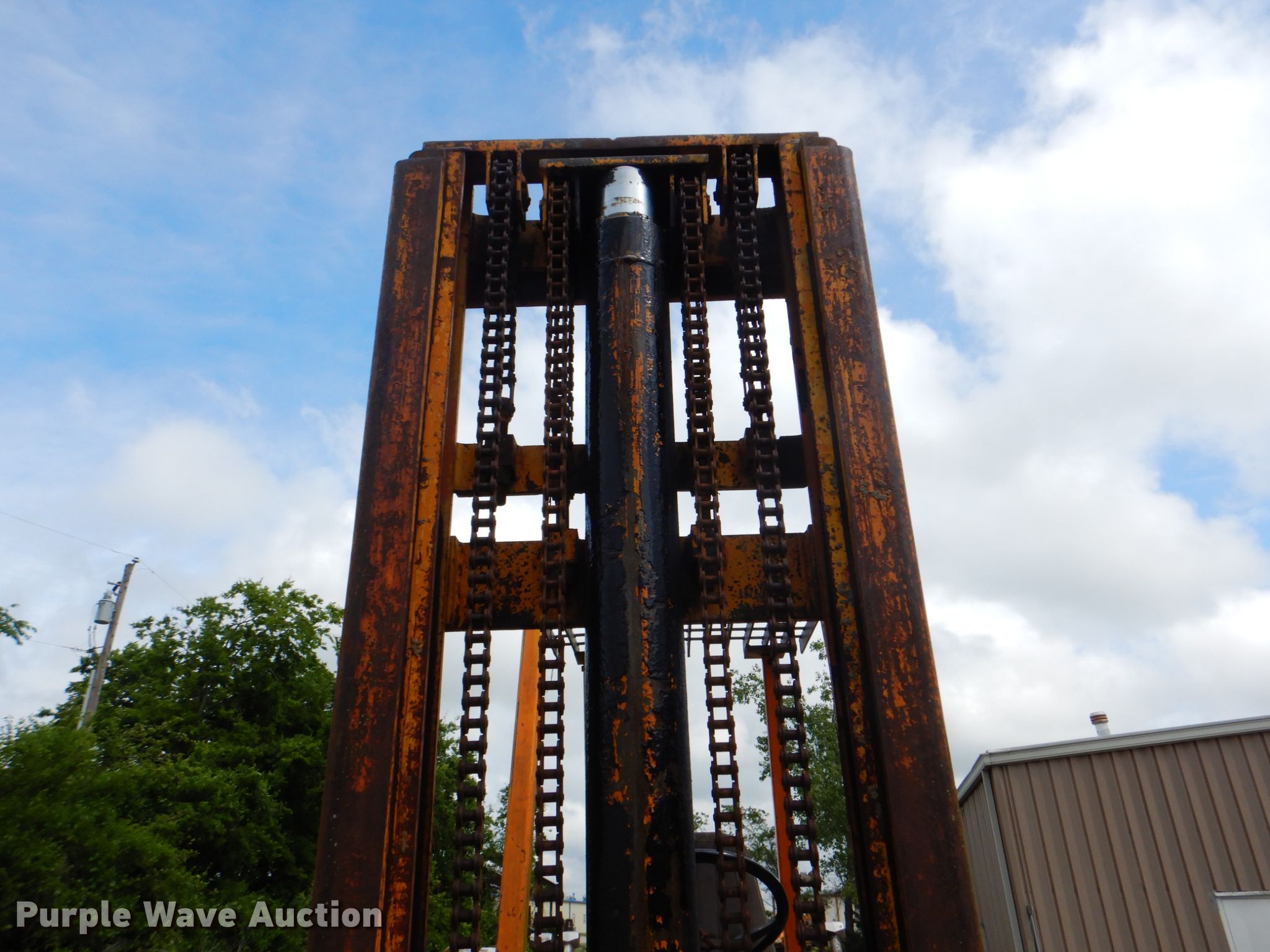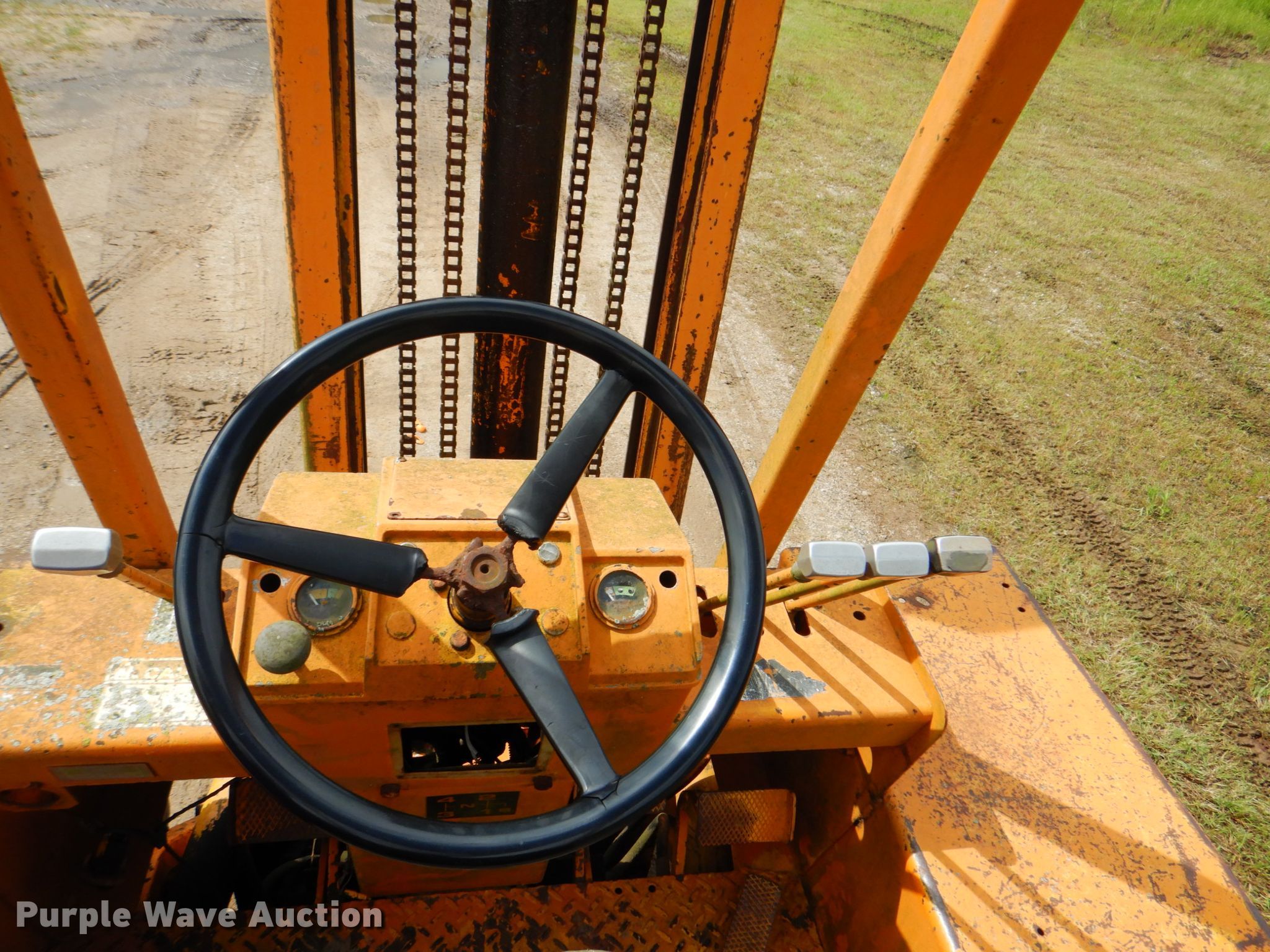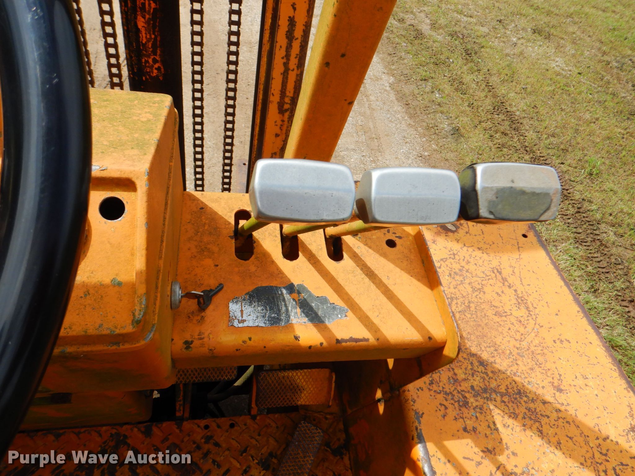 Case 584 forklift. Unknown hours on meter, Serial: 5423619. Engine Cylinders: 4, Fuel type: Diesel. Transmission Shuttle shift, 4F - 1R. Chassis Differential lock. Operators station Canopy. Operational Maximum lift capacity: 4,000 lbs, Maximum lift height: 24", Mast stages: 3, Side shift, Mast tilt, Fork length: 48". Tires Front: 16.9-24, Rear: 7.50-10ST2. Notes Non-operational hour meter , Hydraulic seal needs replaced. Flint Equipment LLC. State Hwy 33. Cushing, OK 74023