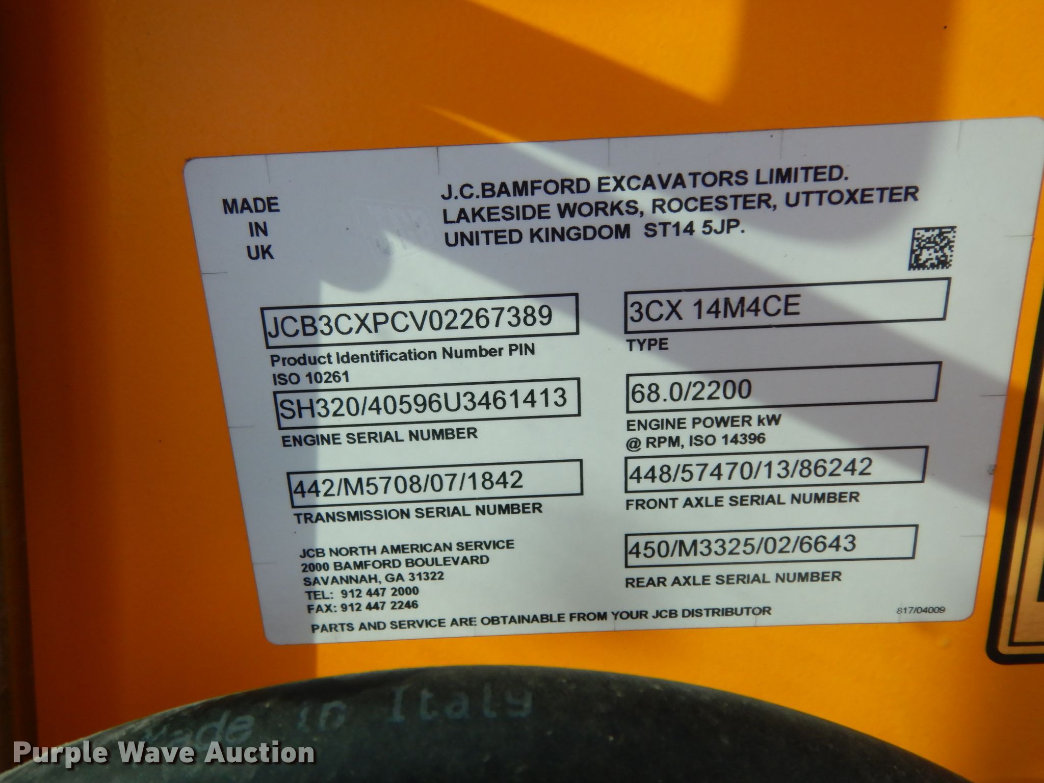 2014 JCB 3CX14M4CE backhoe. 231 hours on meter, Serial: JCB3CXPCV02267389. Engine Serial: SH320/40596U3461413, Displacement: 4.4L, Cylinders: 4, Fuel type: Diesel, kW: 68. Transmission Powershift, 4F - 4R. Chassis Four wheel drive. Operators station EROPS AC, Heat, Backhoe controls: Pilot control, Pattern changer. Operational Loader Auxiliary hydraulics, Bucket Bucket leveler, Width: 92", Cutting edge: Bolt-on, Backhoe Extendable stick, Bucket Width: 24", Teeth: 4.. Tires Front: 14-17.5, Rear: 19.5L-24. D&V Dirtworks, LLC. 257 CR 493. Mertzon, TX 76941