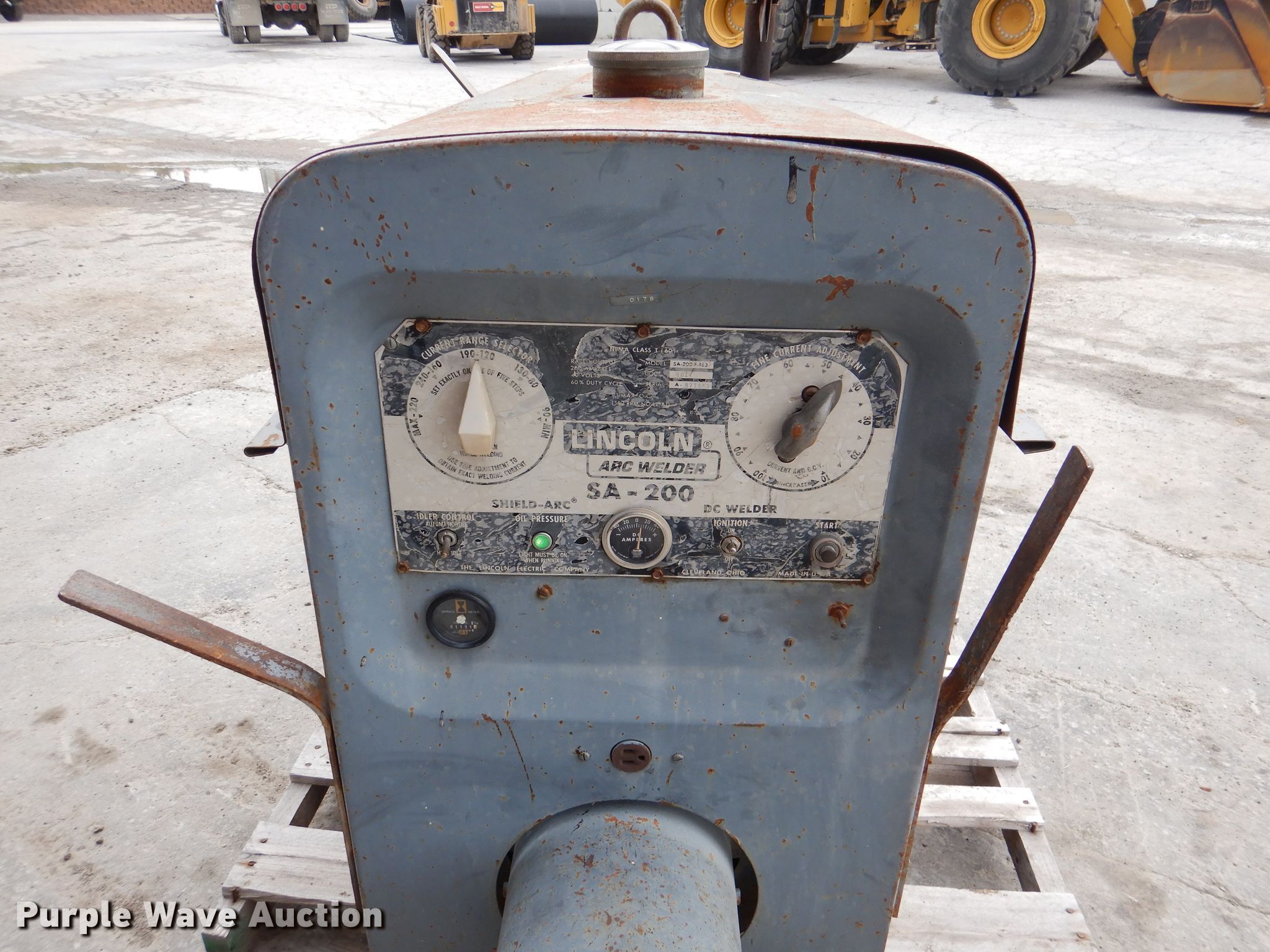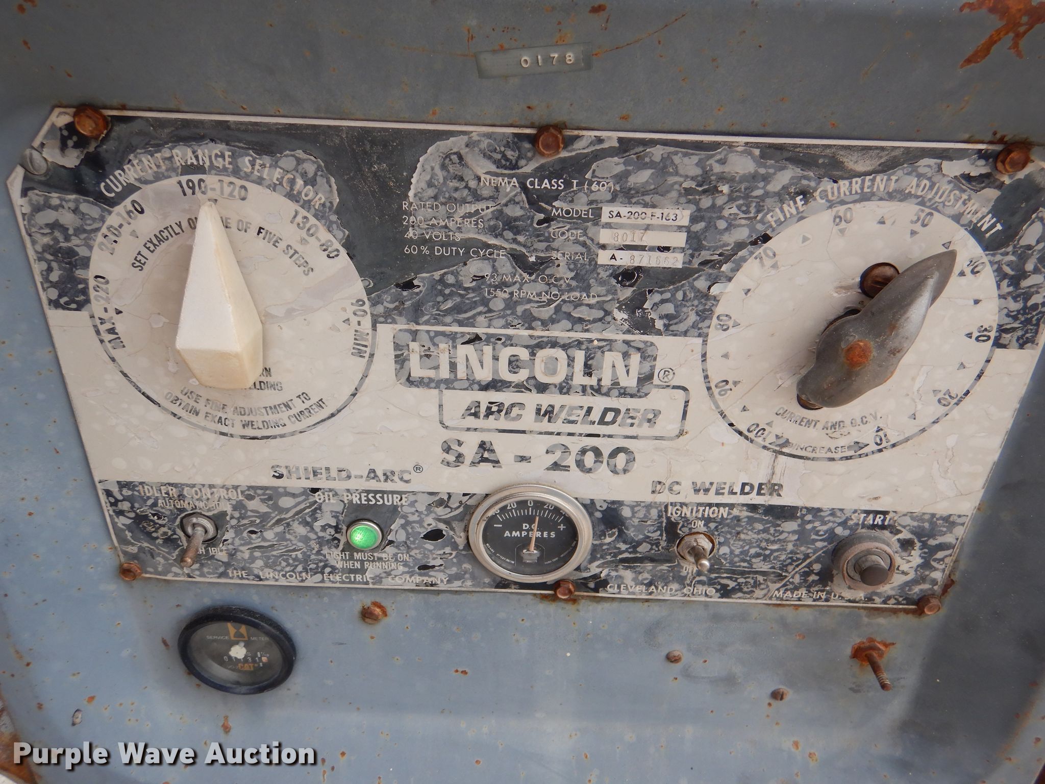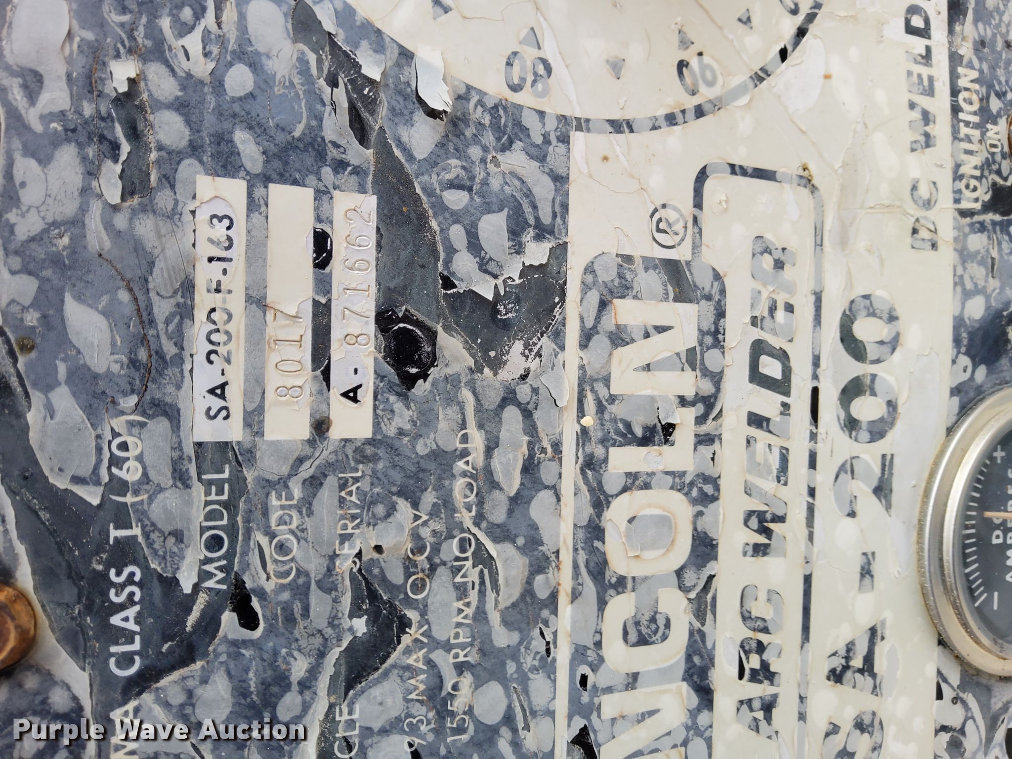 Purple Wave is selling a used Welder (Manual) in Kansas. This item is a Lincoln SA200F163 arc welder with the following: 1,131 hours on meter, Four cylinder gas engine, Serial A-871662