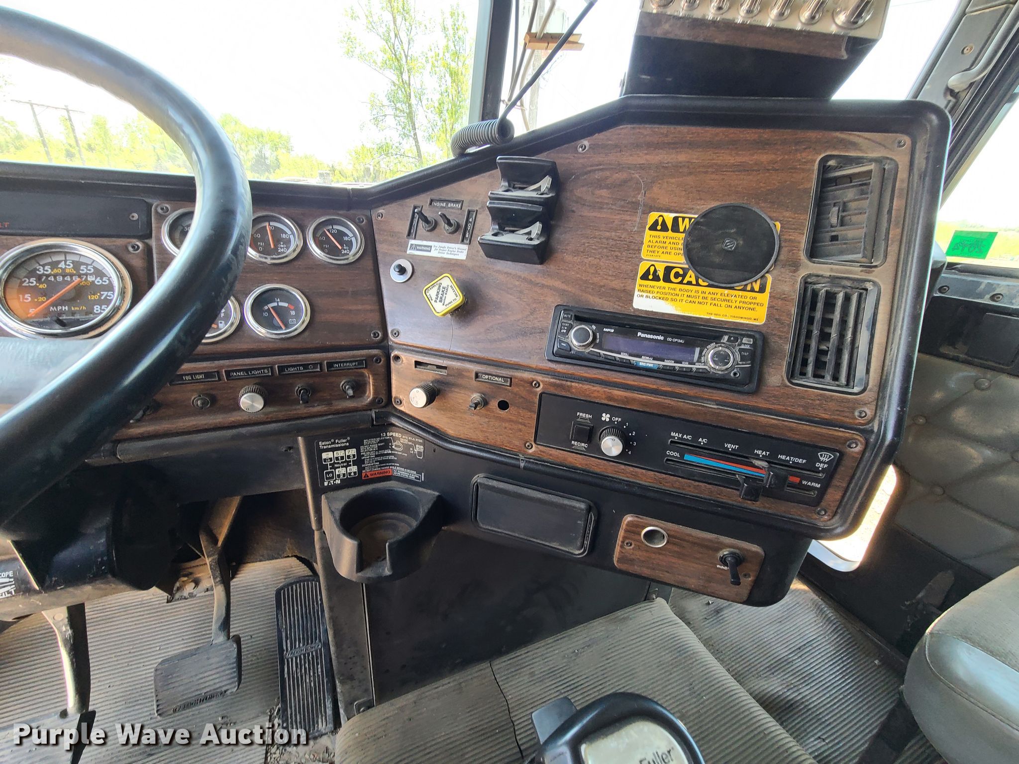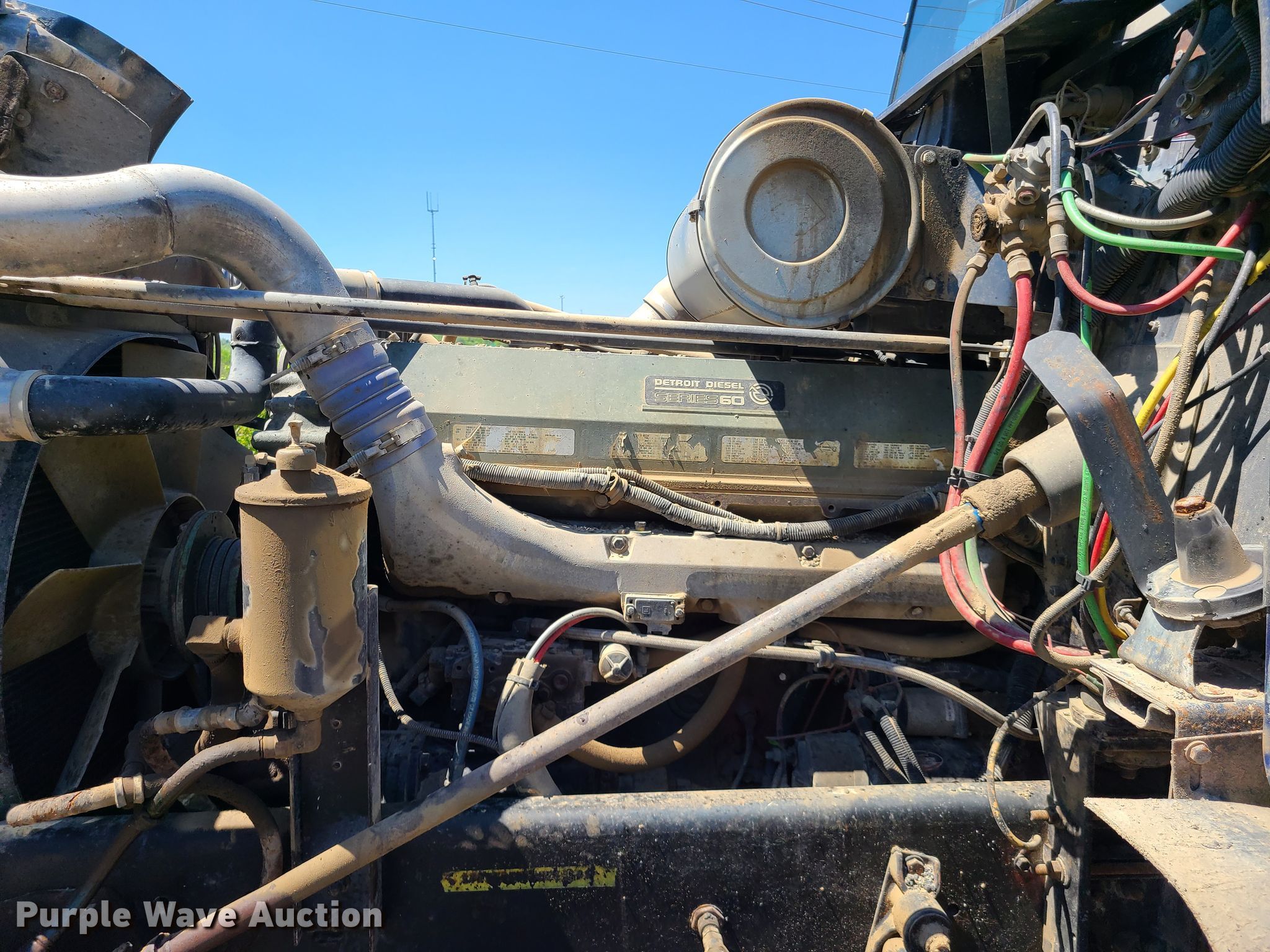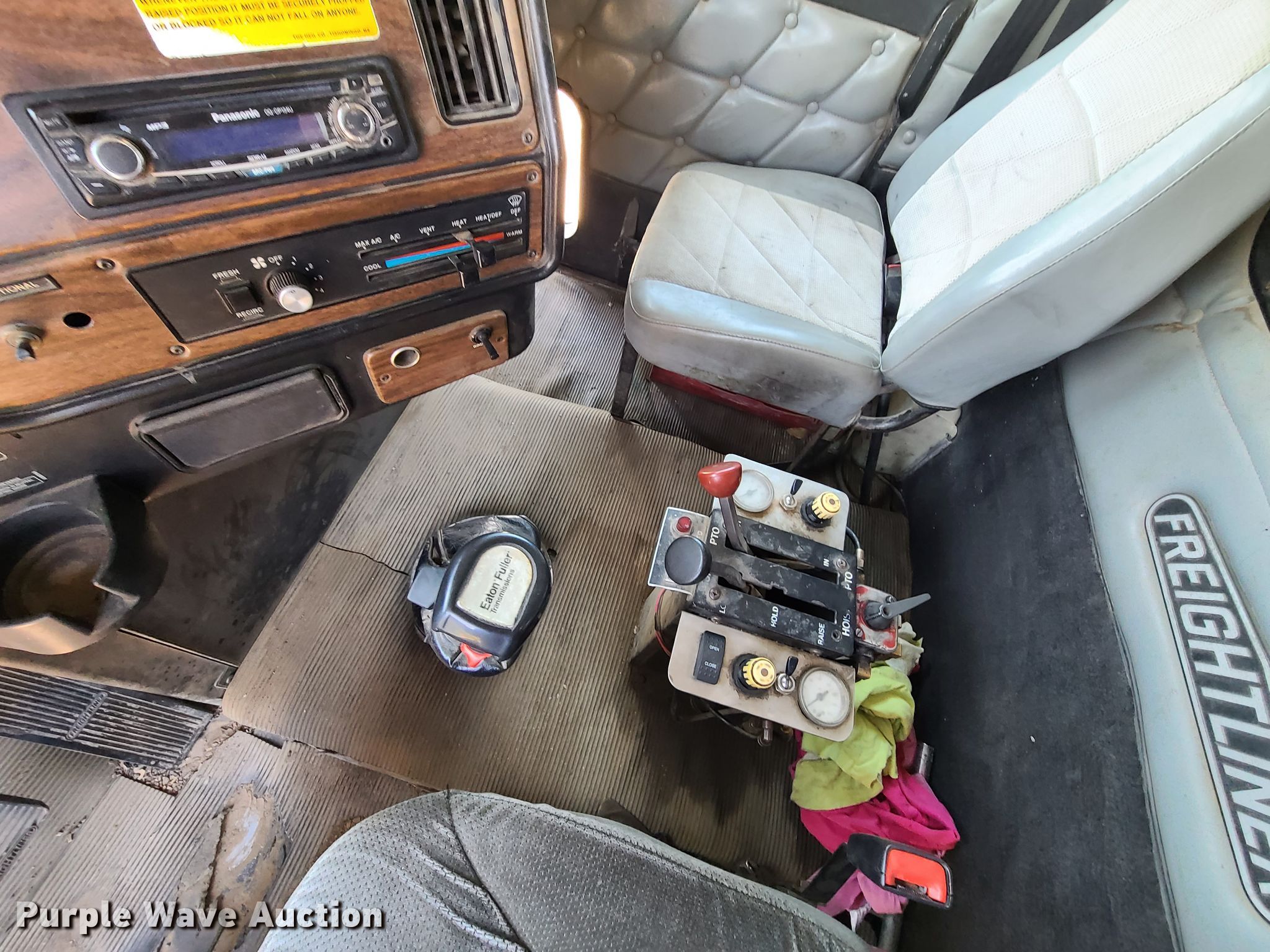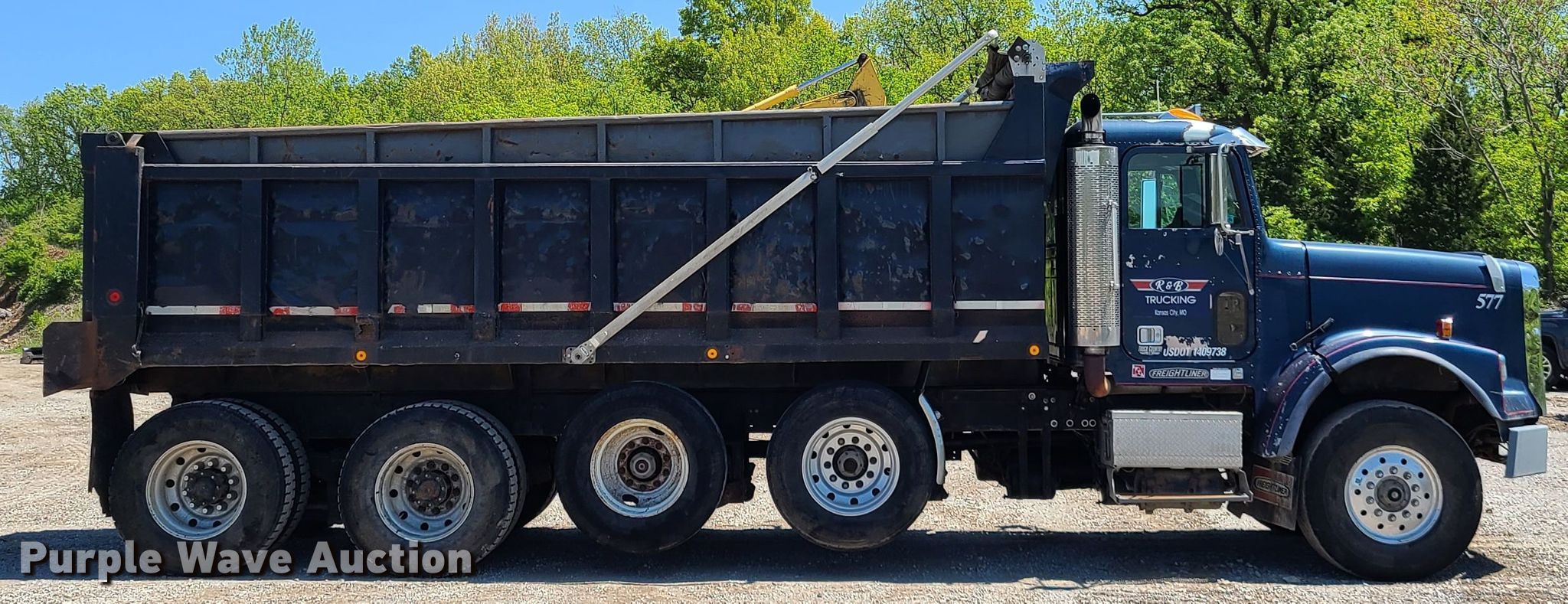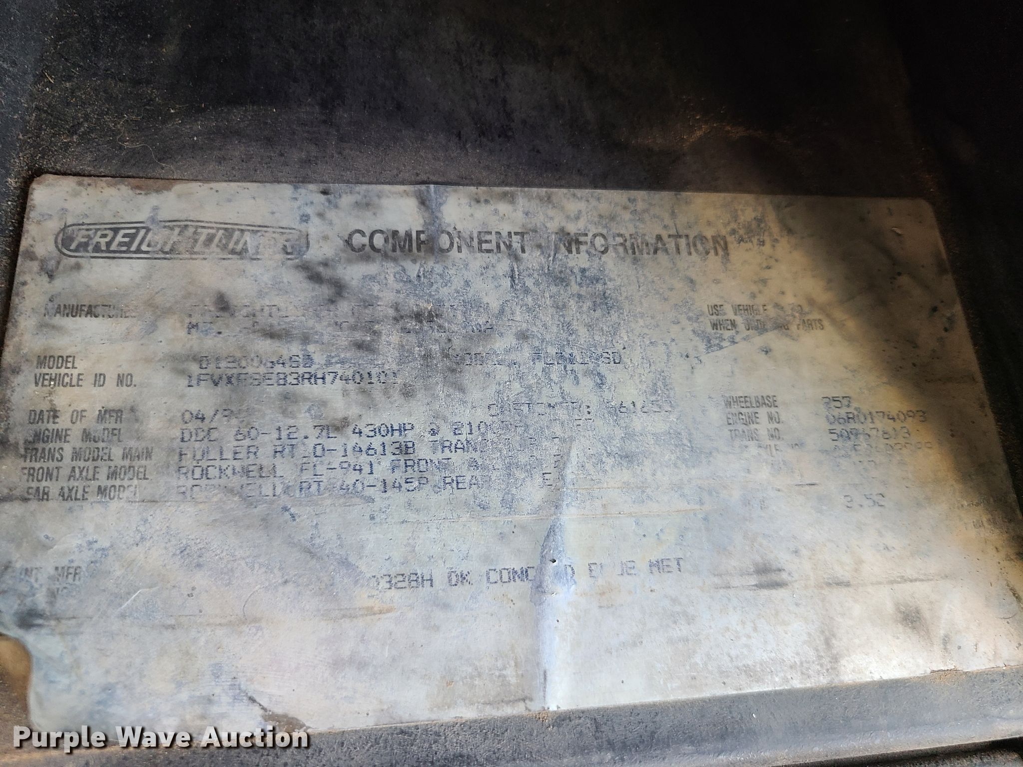 1994 Freightliner FLD120 dump truck. 749,467 miles on odometer. Engine Detroit Diesel Series 60, Displacement: 12.7L, Cylinders: 6, Fuel type: Diesel. Transmission Eaton Fuller, Manual, Speed: 13. Chassis Axles: 4, Pusher axle, Suspension: Walking beam, Brakes: Air, PTO. Interior AC, Heat. Operational Dump bed 19' L x 96" W, Side height: 60", Bed type: Steel, Roll tarp, Ram: Single , End gate: Air operated. Tires Front: 425/65R22.5, Rear: 11R22.5. Missouri title. 1FVXFSEB3RH740101. R & B Trucking. 8100 Blue Parkway Dr. Kansas City, MO 64133