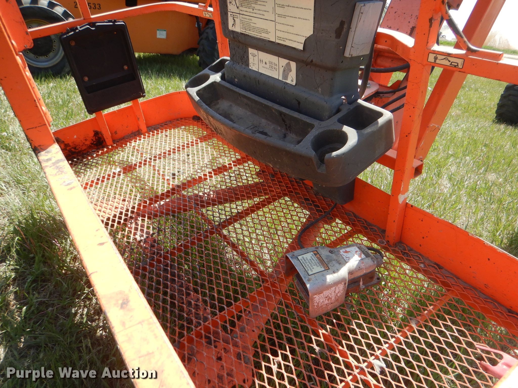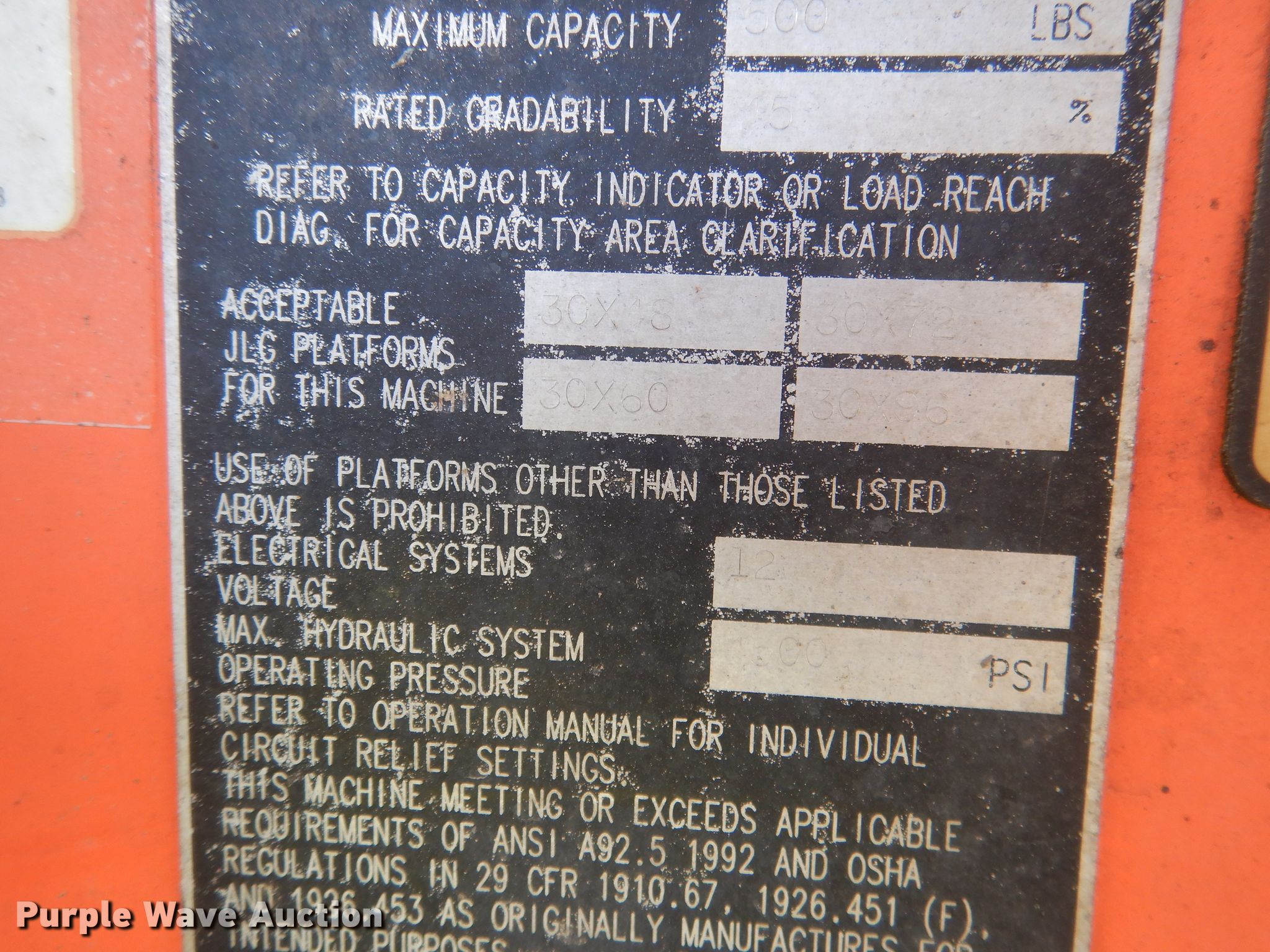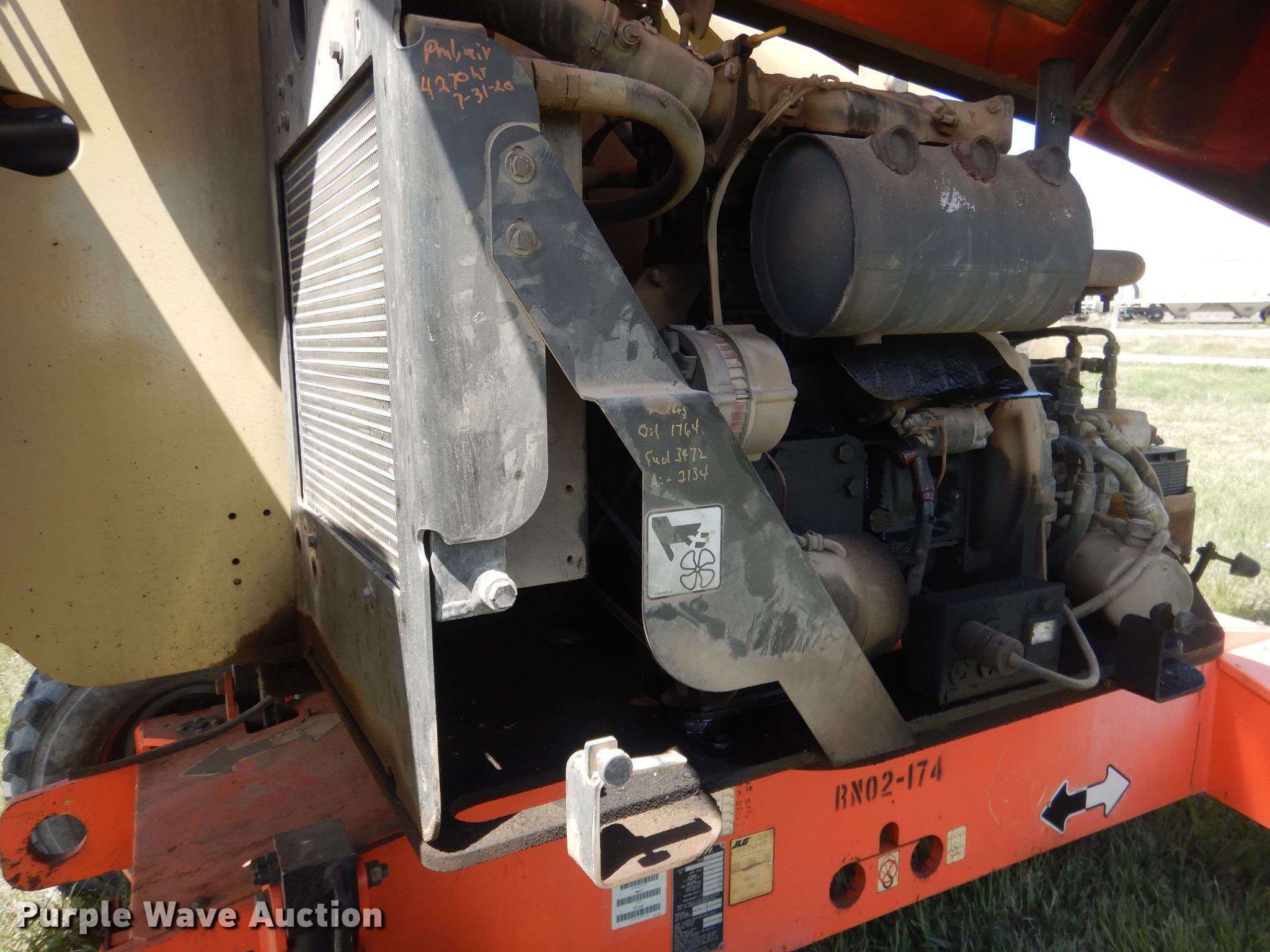 2002 JLG 460SJ boom lift. 4,492 hours on meter, Serial: 0300067335. Engine Cylinders: 4, Fuel type: Diesel. Chassis Four wheel drive. Operational Rough terrain, Maximum lift capacity: 600 lbs, Maximum reach length: 10.5', Maximum lift height: 16', Hydraulic leveling, Platform: 72" L x 30" W, AC power outlet, Controls: Platform, Ground, Platform extensions: Powered, Platform rotation: Hydraulic. Tires Tire size: 12-16.5. Paulsen Inc.. Cozad, NE 69130