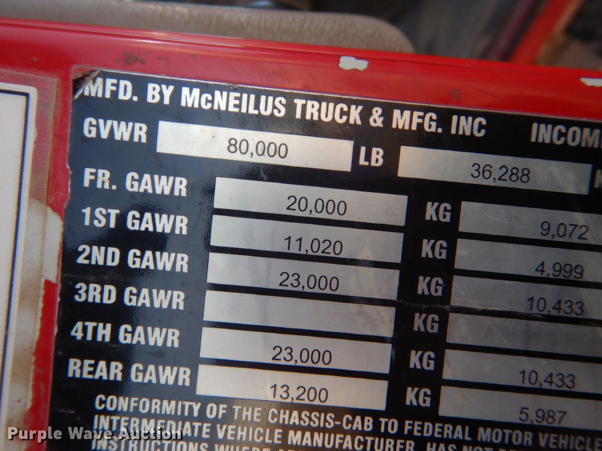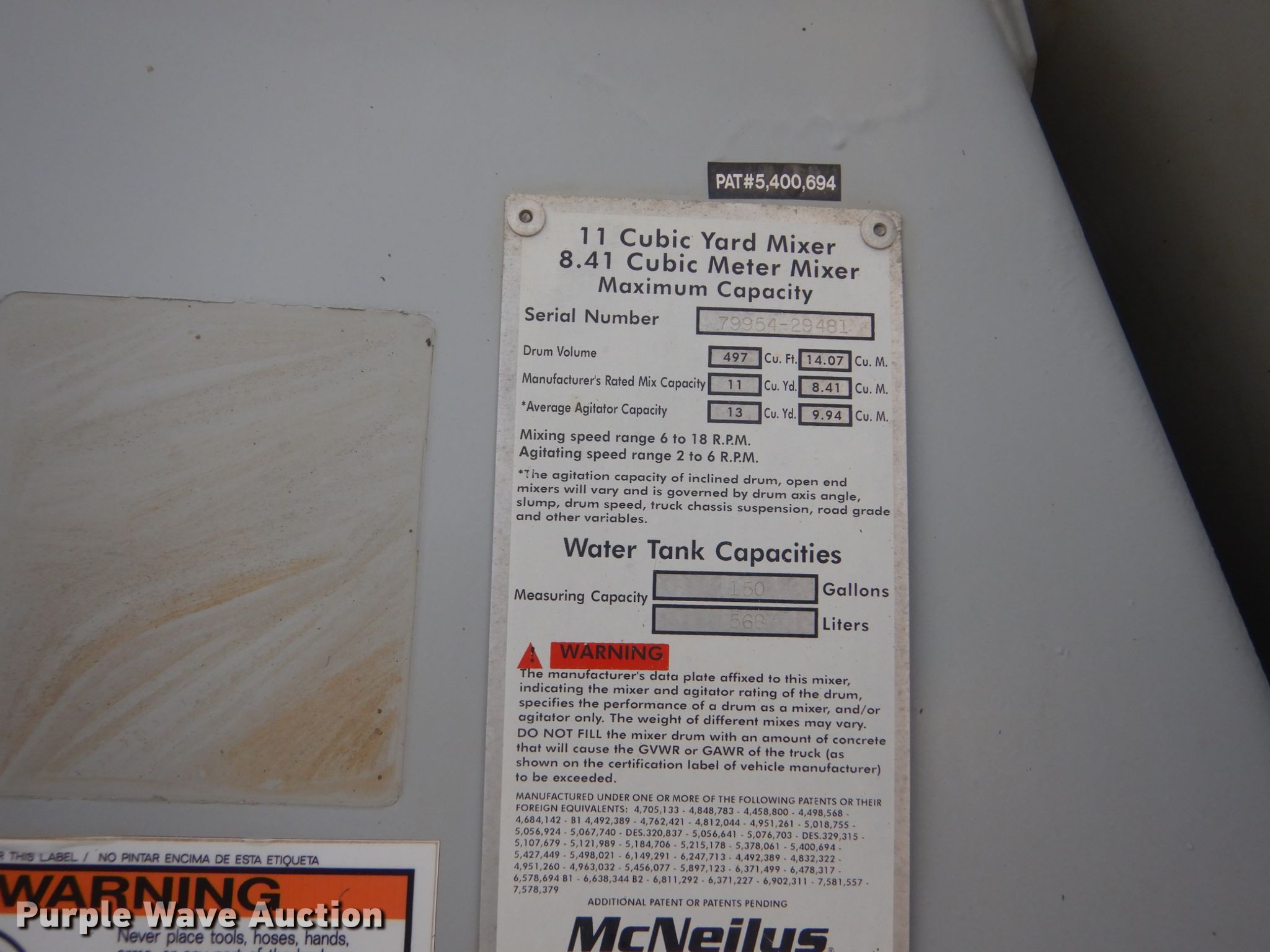 2007 Sterling LT9511 ready mix truck. 262,901 miles on odometer, Engine hours: 19,725, Unit #: 3092. Engine Mercedes Benz MBE4000, Displacement: 12.0L, Cylinders: 6, Fuel type: Diesel. Transmission RoadRanger RTO 9 MLL, Manual, Speed: 11. Chassis Axles: 4, Pusher axle, Tag axle, Differential lock: Full, Suspension: Walking beam, Brakes: Air, PTO, GVWR: 80,000 lbs FAWR: 20,000 lbs, IAWR: 11,020 lbs, RAWR: 23,000 lbs, Lift axle GAWR: 23,000 lbs. Interior AC, Heat, Heated mirrors, Power windows, Cruise control. Operational Mixer McNeilus , Serial: 79954-29481, Capacity: 11 cu.yd., Discharge: Rear, In-cab controls, Rear drum controls, Water tank capacity: 150 gallons, Chute Extensions: 3, Chute type: Steel.. Tires Front: 425/65R22.5, Rear: 11R22.5 , Pusher axle: 255/70R22.5, Tag axle: 315/80R22.5. South Dakota title. 2FZMAZCV47AX71766. Consolidated Ready Mix Inc.. 1011 330th St. Bellingham, MN 56212
