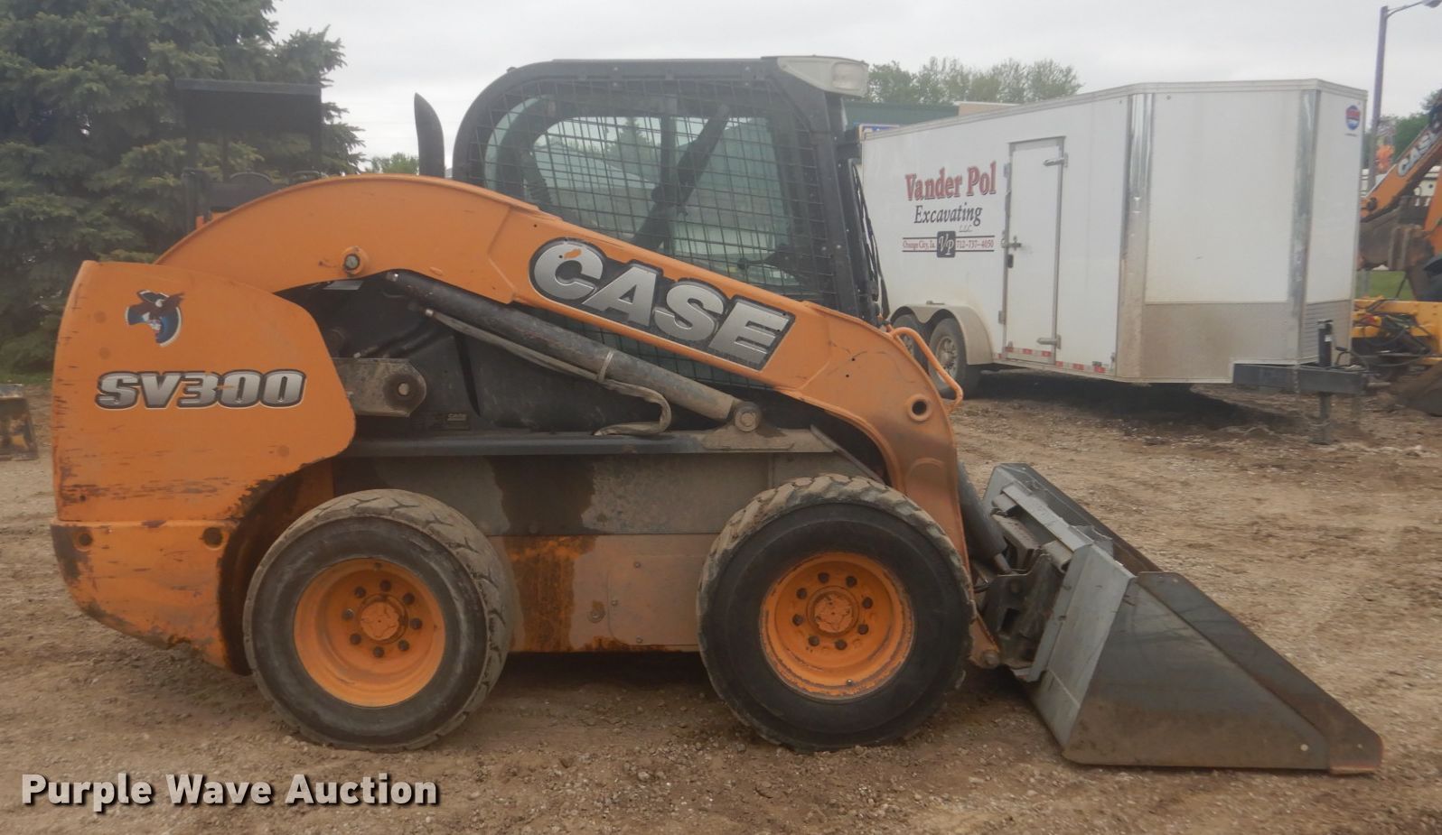 2013 Case SV300 skid steer loader. 3,004 hours on meter, Serial: NDM445663. Engine Case, Cylinders: 4, Fuel type: Diesel. Transmission Hydrostatic. Operators station Enclosed cab, AC, Heat, Bucket control: Hand. Operational Auxiliary hydraulics, Quick coupler: Hydraulic, Bucket Width: 78", Cutting edge: Weld-on. Tires Size: 12-16.5. VanderPol Excavating LLC. 808 Highway 10 W. Orange City, IA 51041